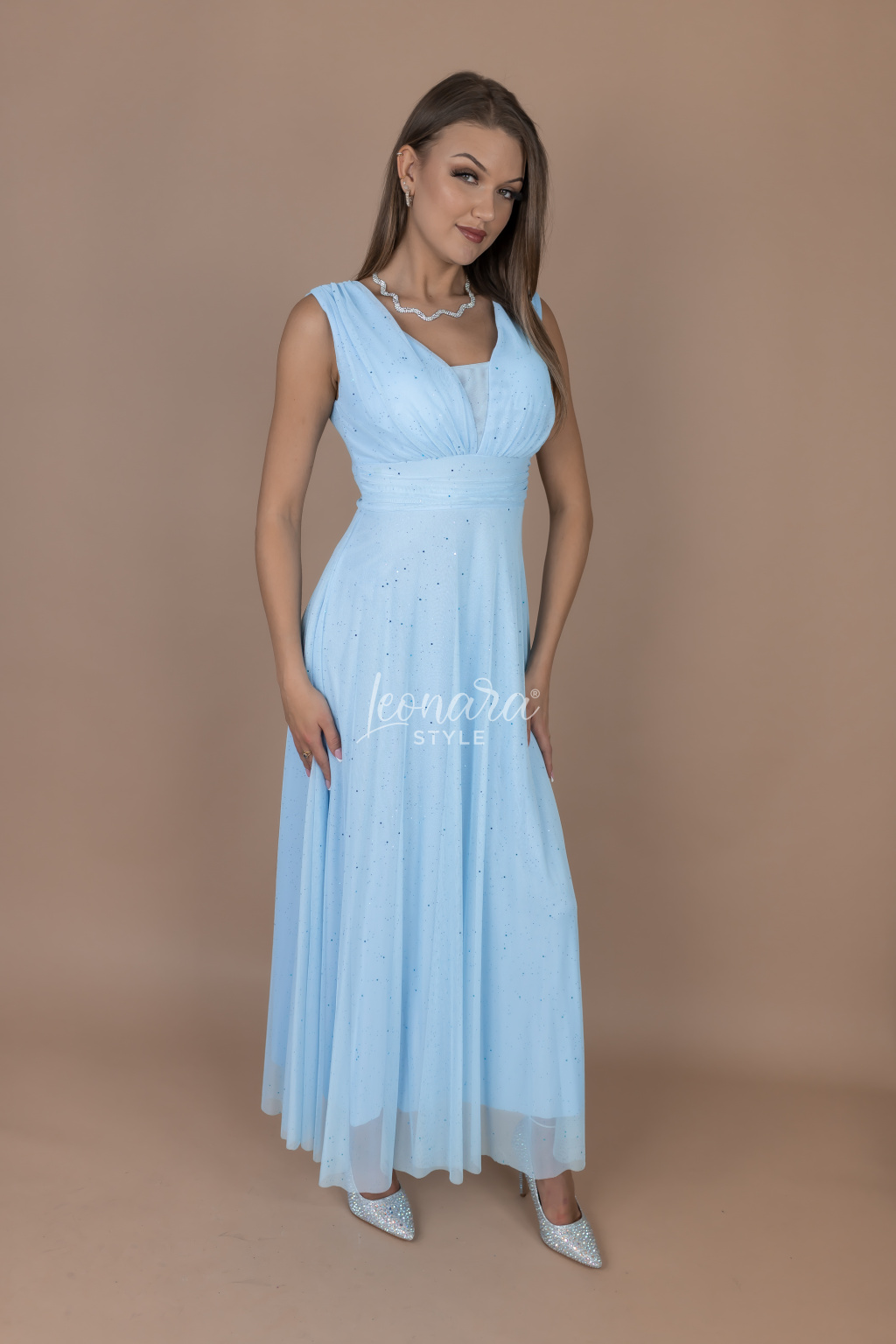 Nádherné lehké tylové šaty, které si zamilujete pro jejich vzdušnost a éterický vzhled. Celý model je posetý jemnými třpytkami, jež na světle vytvářejí decentní a luxusní odlesky. Praktická širší ramínka poskytují pohodlí a skvěle drží, zatímco výstřih do V opticky prodlouží šíji. V pase mají šaty všitý pásek na zavazování, kterým snadno vytvarujete postavu a zvýrazníte ženské křivky. Ideální volba na svatby, plesy či jiné slavnostní okamžiky. Pod tyto šaty vždy doporučujeme vzít tělové spodní prádlo!