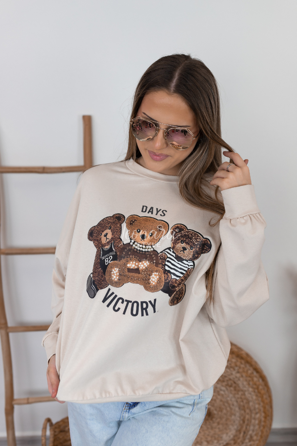 Tato stylová mikina bez kapuce je ideální volbou pro jarní dny. Je lehká, tenká a velmi pohodlná, takže se skvěle hodí na každodenní nošení. Příjemný materiál zajišťuje komfort po celý den a snadno ji zkombinujete s džínami, legínami i sukní. Mikinu zdobí roztomilý motiv medvídků, přičemž jeden z nich je ozdoben našitými perličkami. Mikina nemá kapuci ani kapsy.
