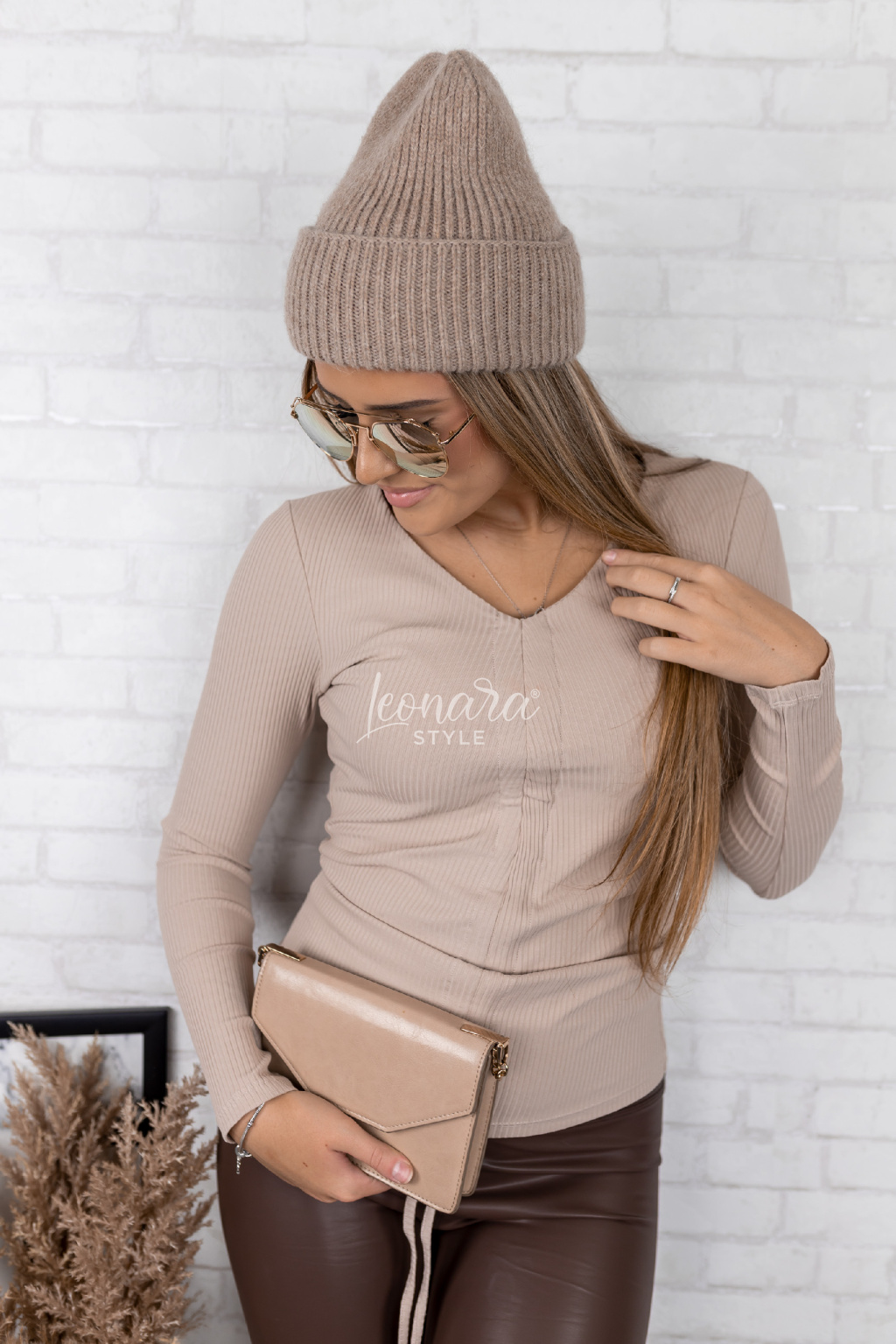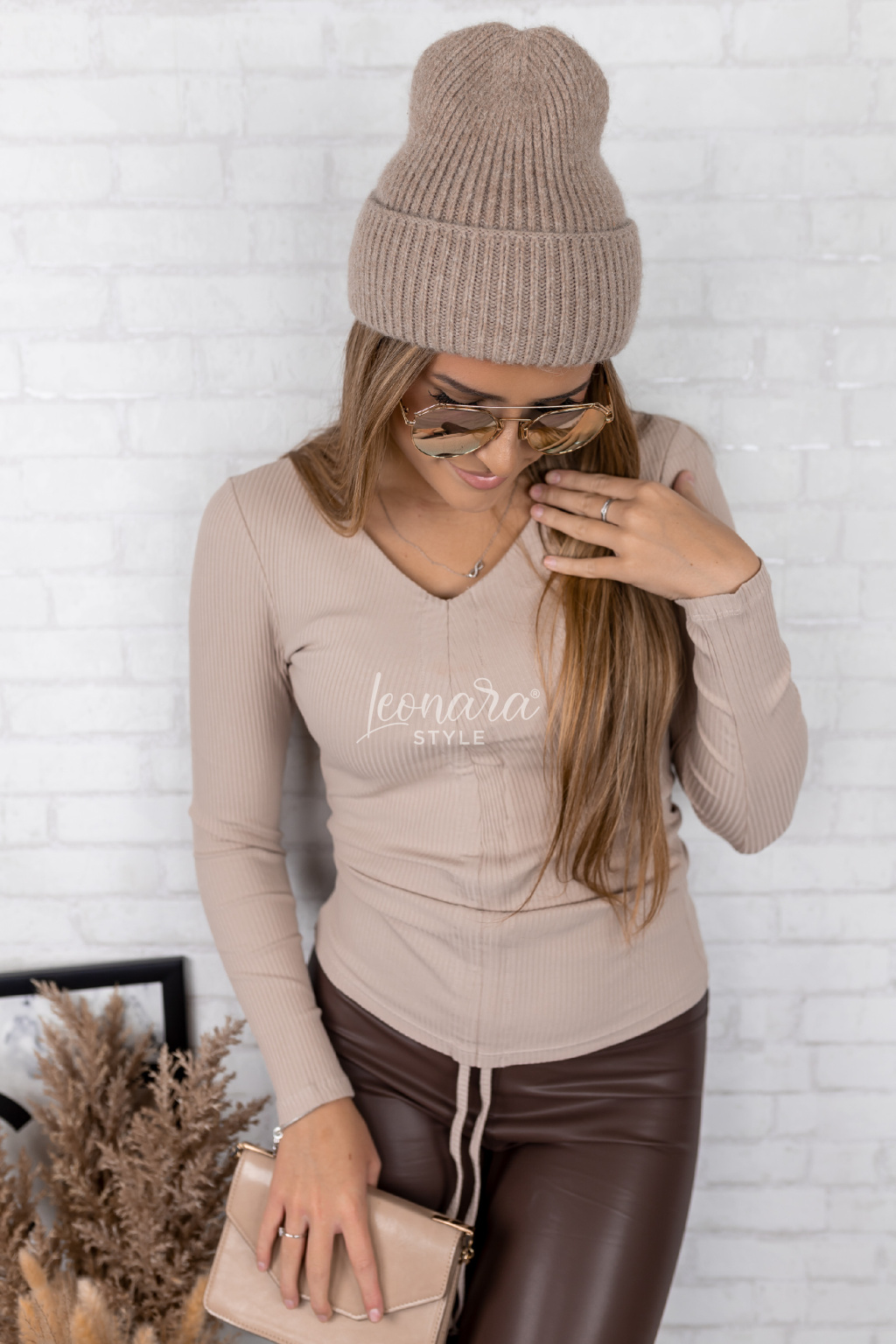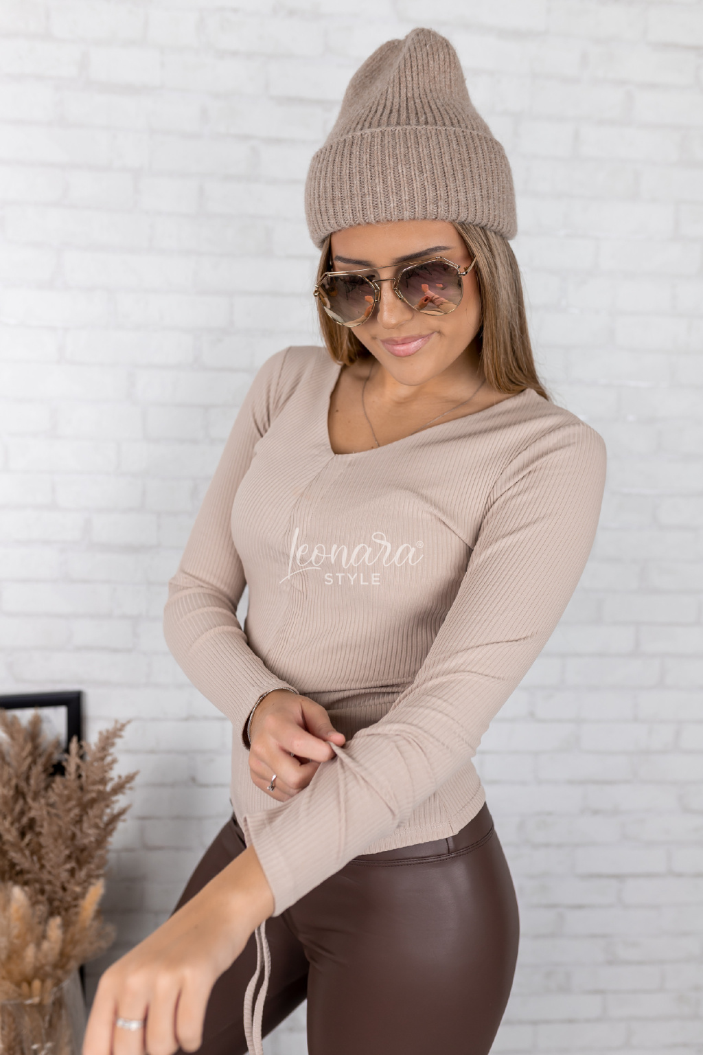 Tato žebrovaná halenka zaujme svým originálním stahováním v oblasti hrudníku, díky kterému si snadno upravíte vzhled podle svých představ. Má jemný výstřih do V, který působí ženským a elegantním dojmem. Pružný materiál se příjemně přizpůsobí postavě a zajistí pohodlí po celý den. Halenka se skvěle hodí jak k ležérním outfitům, tak i k elegantnějším kombinacím na večer nebo do města.