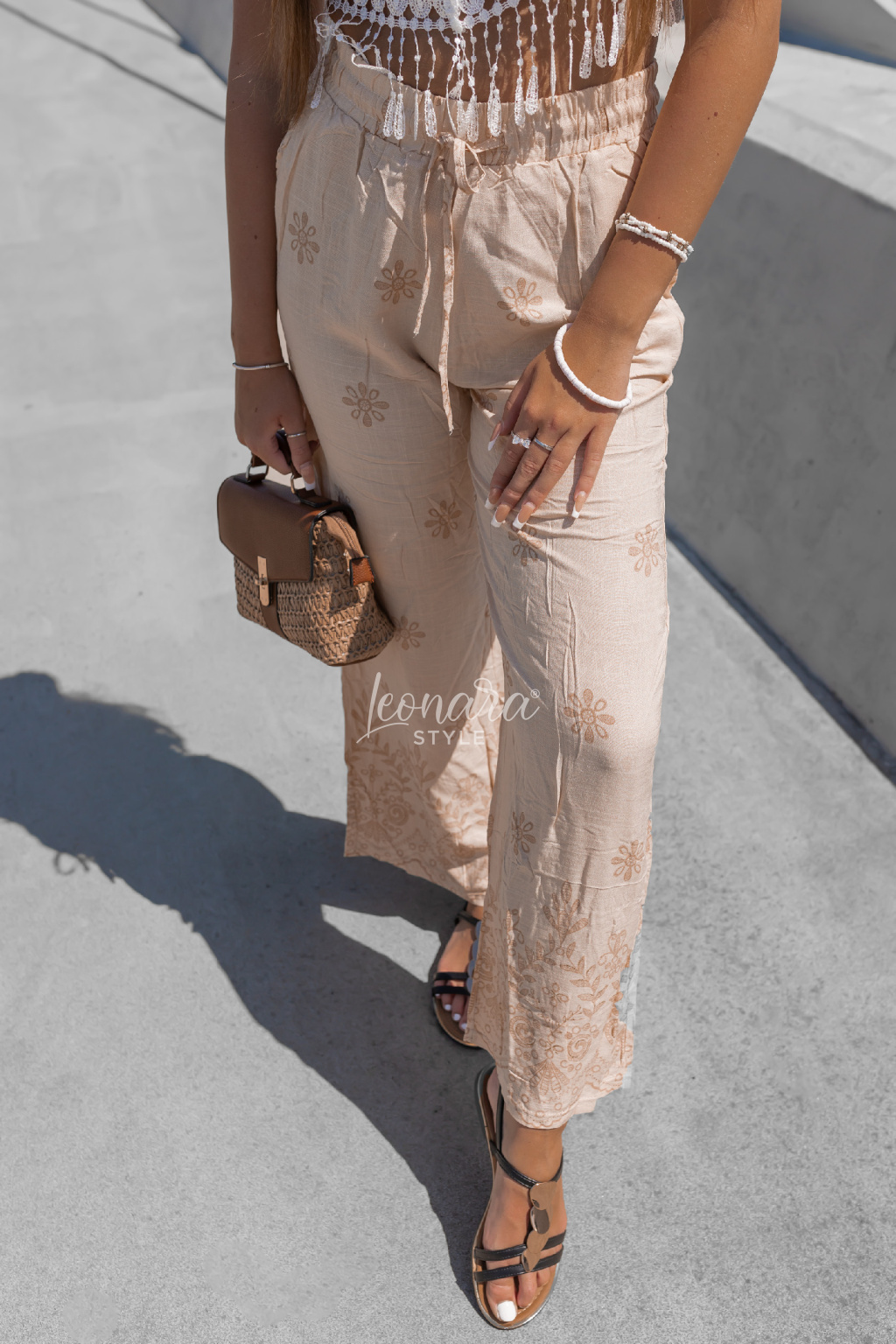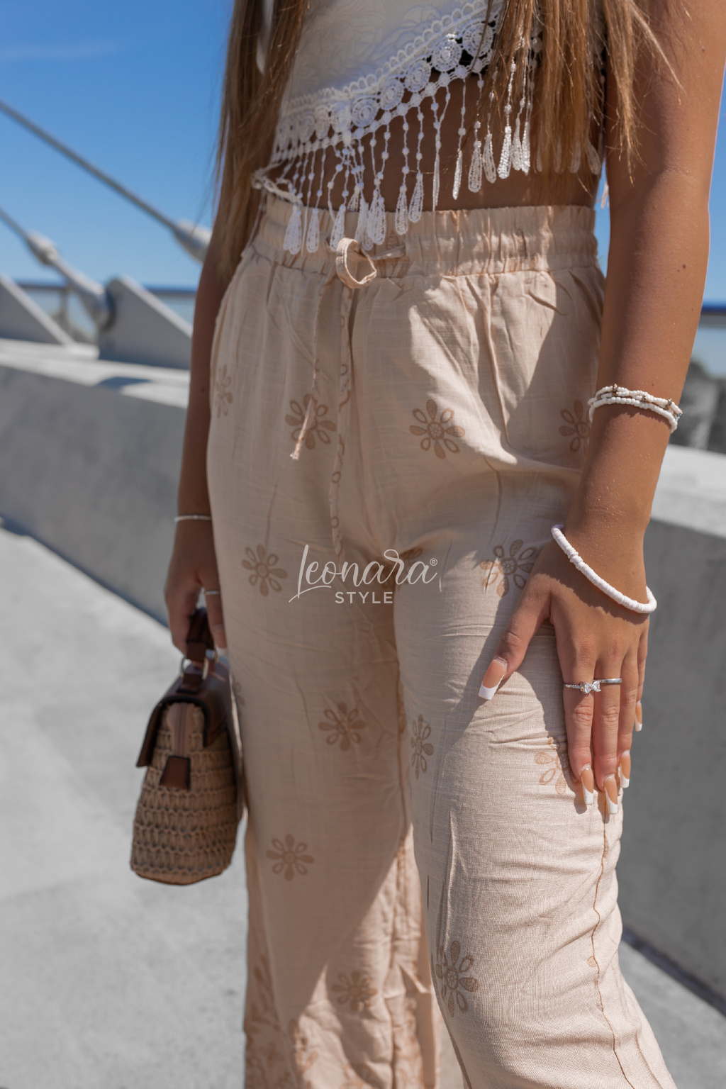 Lehké béžové kalhoty s jemnou výšivkou v bílé barvě, která zdobí nohavice po celé délce. Příjemný materiál, elastický pas se šňůrkou a pohodlný střih dělají z tohoto kousku ideální volbu na volné dny nebo cestování. Výšivka dodává kalhotám šmrnc, ale stále působí decentně. Perfektně ladí s bílým topem i přírodními doplňky.