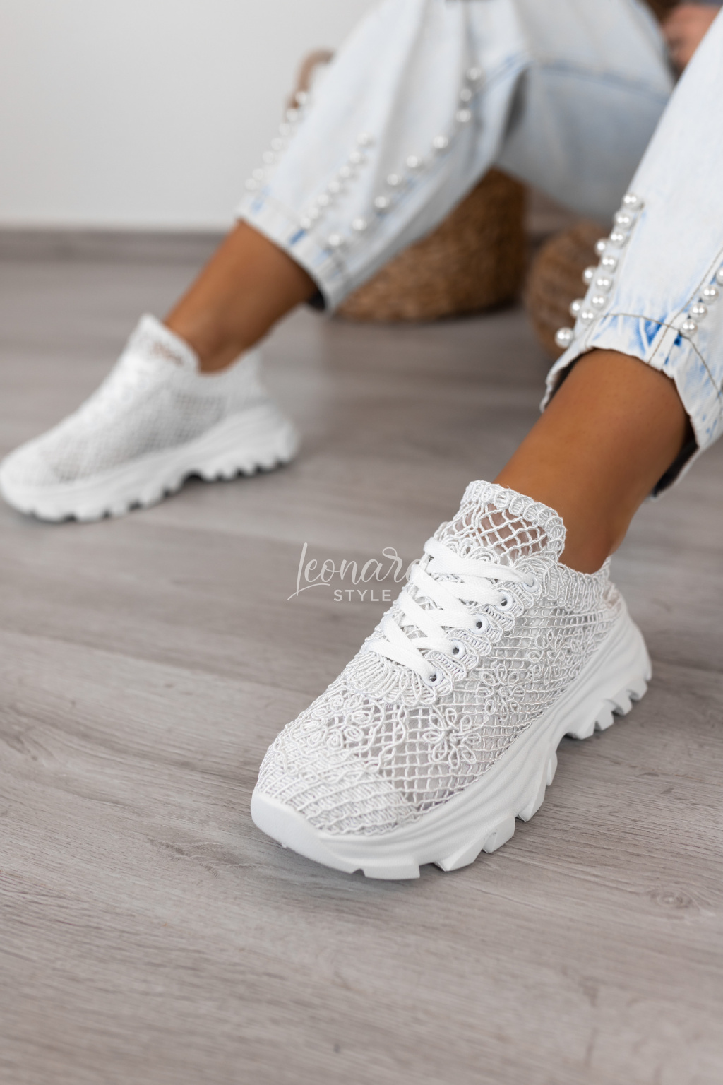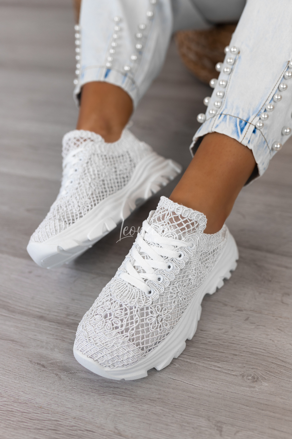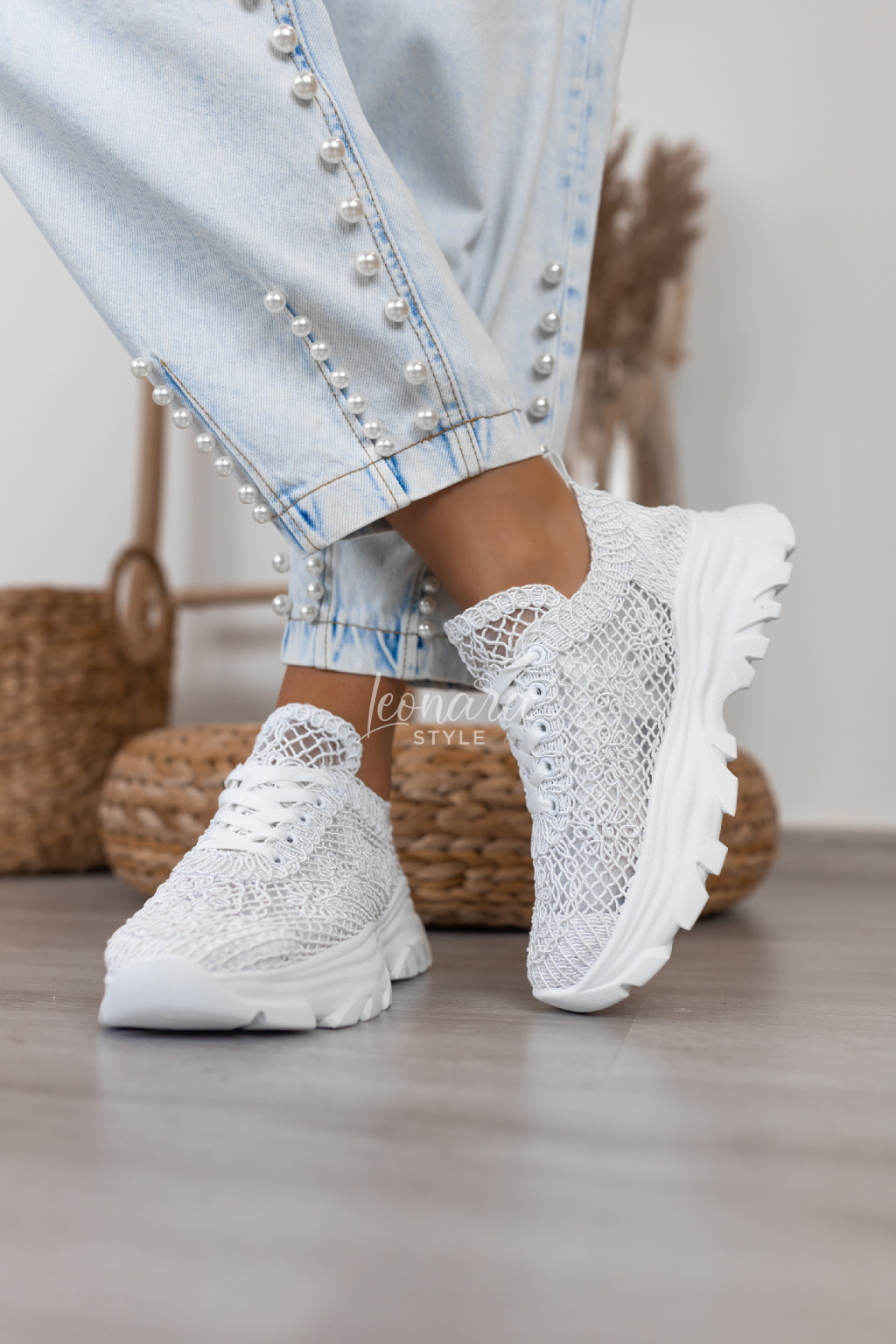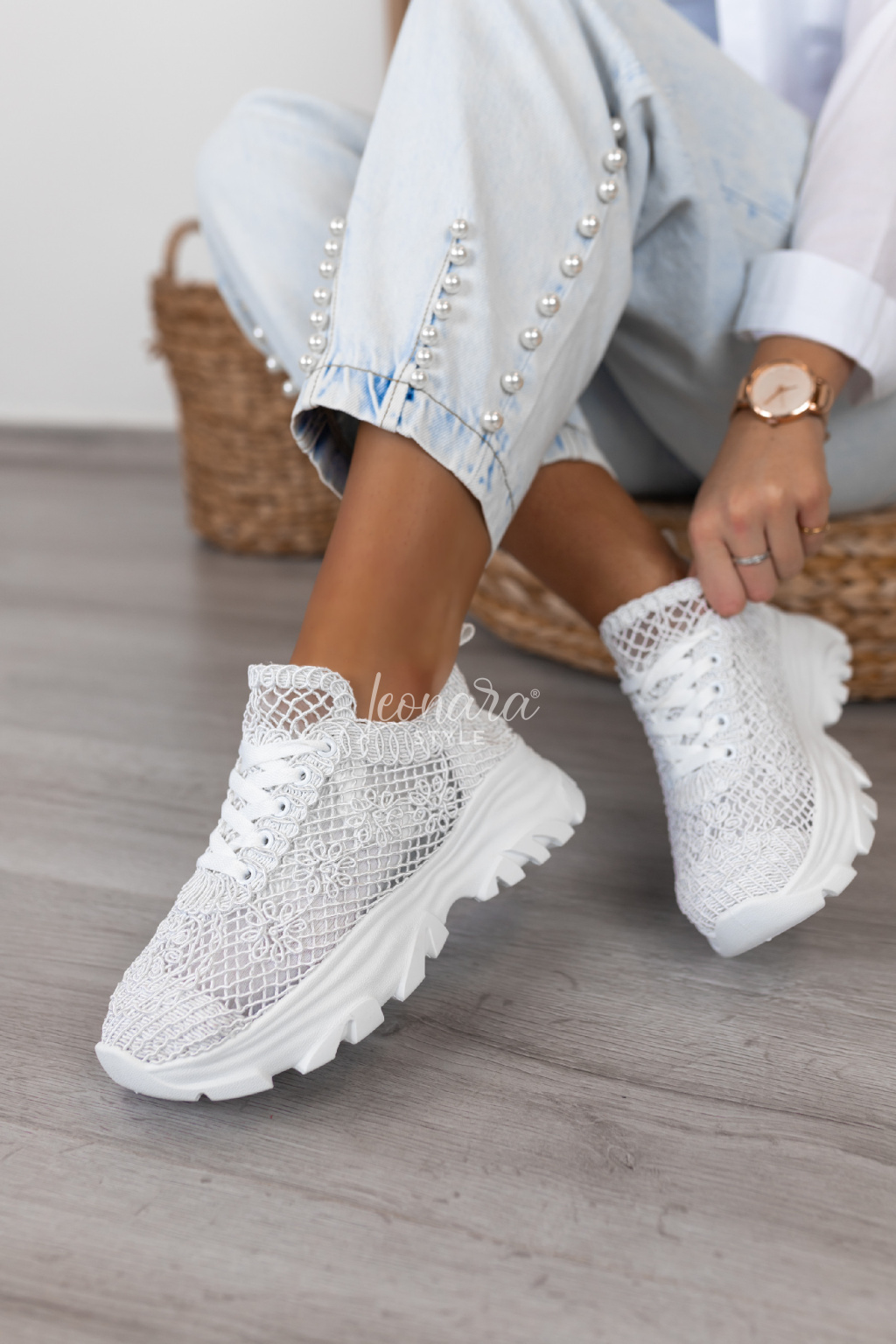 Krajkové tenisky jsou stylovou volbou na jaro. Krajka na průhledné látce působí jemně a hezky vynikne na noze. Mají vyšší podrážku pro pohodlí i moderní vzhled a klasické šněrování na tkaničky. Skvěle se hodí k šatům, sukním i džínám a jsou ideální na běžné nošení i procházky městem.