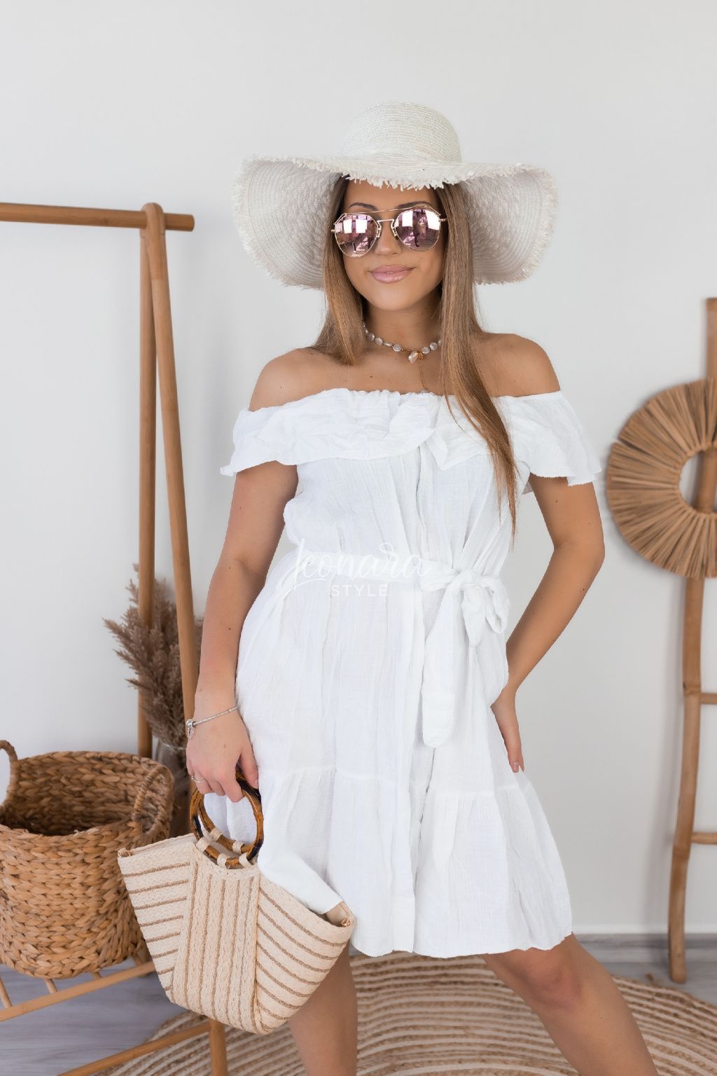 Jednobarevné mušelínové šaty z lehkého a velmi příjemného materiálu. Lze nosit klasicky nebo spadlé na ramenou pro uvolněnější vzhled. Spodní lem i rukávy jsou doplněny decentními volánky. V pase možnost zavázání páskem ze stejného materiálu pro zvýraznění siluety.