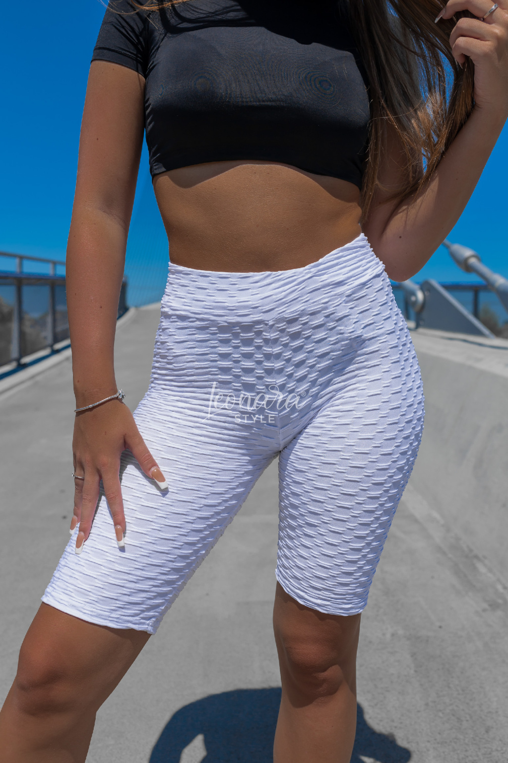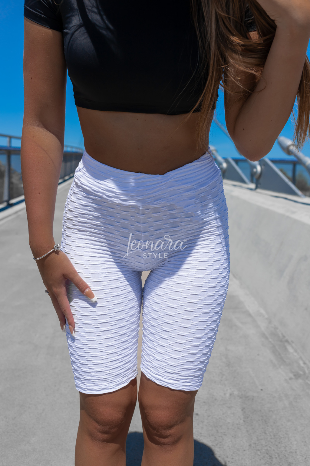Bílé sportovní šortky s push-up efektem a jemnou 3D strukturou. Velmi pružné a pohodlné na nošení. Vysoký pas perfektně tvaruje postavu a drží na místě i při pohybu. Ideální na sport i volný čas – doplní každý letní outfit. Vhodné pro všechny typy postavy.
