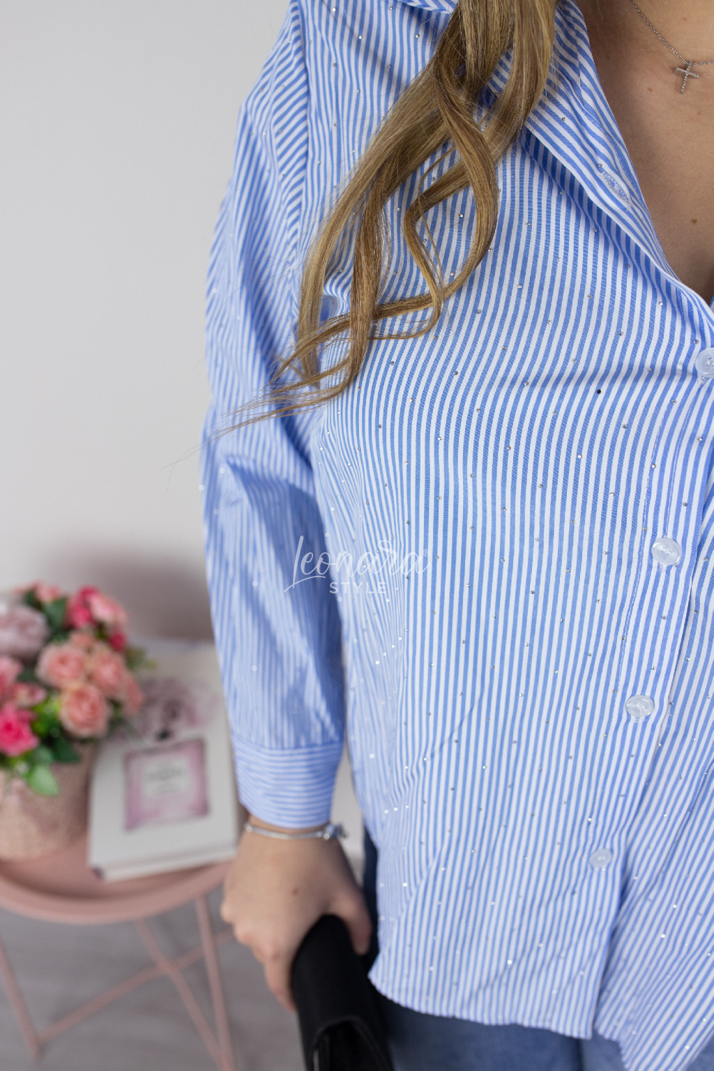 Stylová bílo-modrá pruhovaná košile zdobená jemnými kamínky, které jí dodávají elegantní a zajímavý vzhled. Košile se zapíná na knoflíky a knoflíky jsou také na rukávech. Je vyrobena z příjemného materiálu, který je mírně elastický. Košile je ideální na běžné nošení, do práce, do města i na společenské příležitosti. Skvěle se kombinuje s džínami, kalhotami i sukní a vytvoří stylový a elegantní outfit.