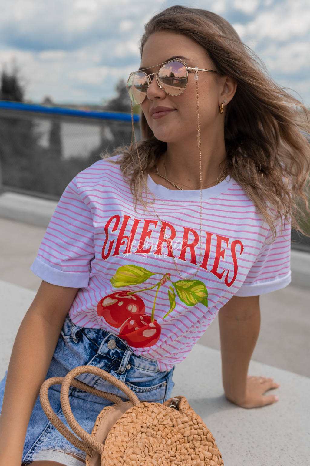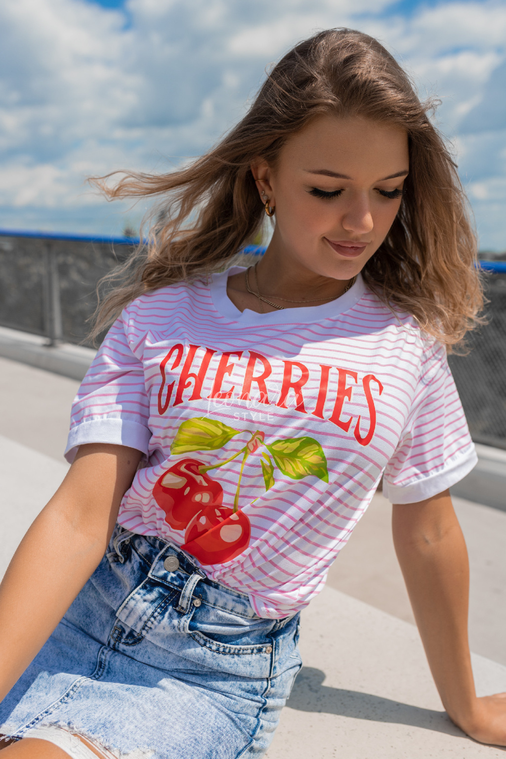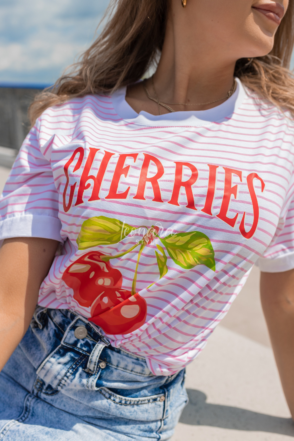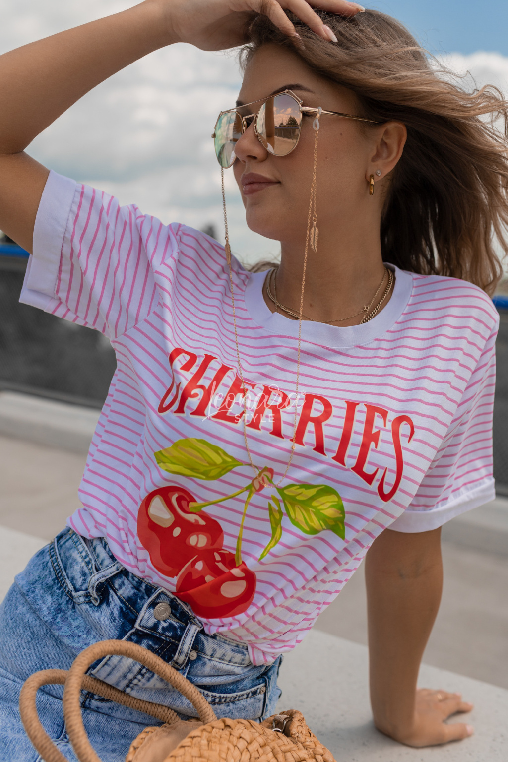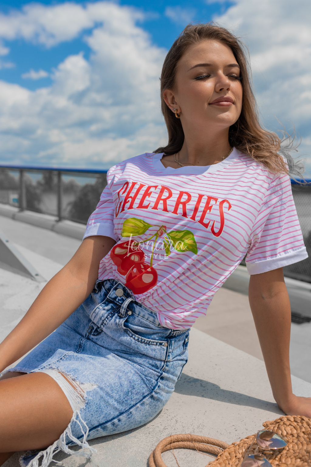 Toto pohodlné letní tričko s třešňovým motivem a nápisem „Cherries“ je svěží a ideální pro teplé dny. Růžovobílý proužek dodává francouzský šmrnc, zatímco ovocný potisk navozuje letní náladu. Lehký, příjemný materiál z něj dělá skvělý kousek na dovolenou, procházky i každodenní nošení.