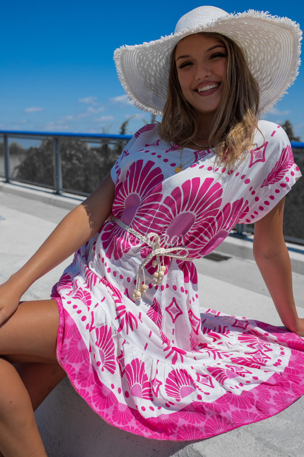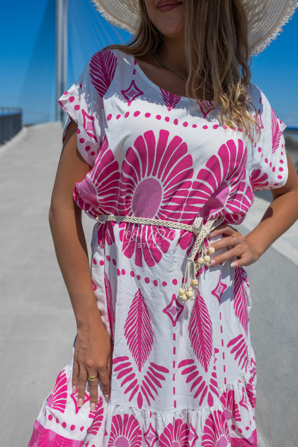Lehké letní šaty s originálním růžovobílým vzorem působí svěže a stylově. Volnější střih s krátkými rukávy je doplněn pleteným páskem, který zvýrazní pas a dodá šatům ženský tvar. Příjemný a vzdušný materiál je ideální na horké dny, ať už vyrazíte na pláž, do města nebo na dovolenou.