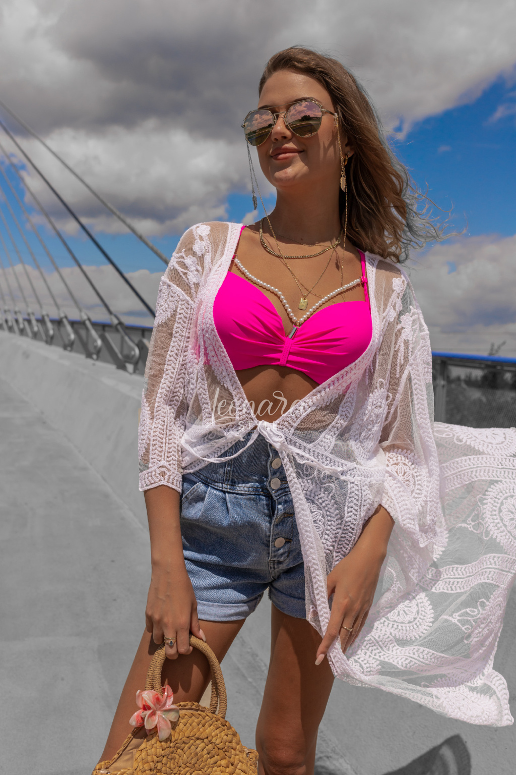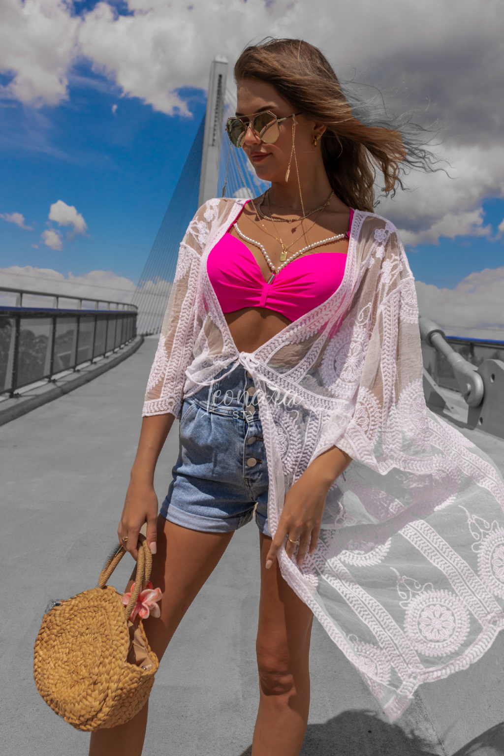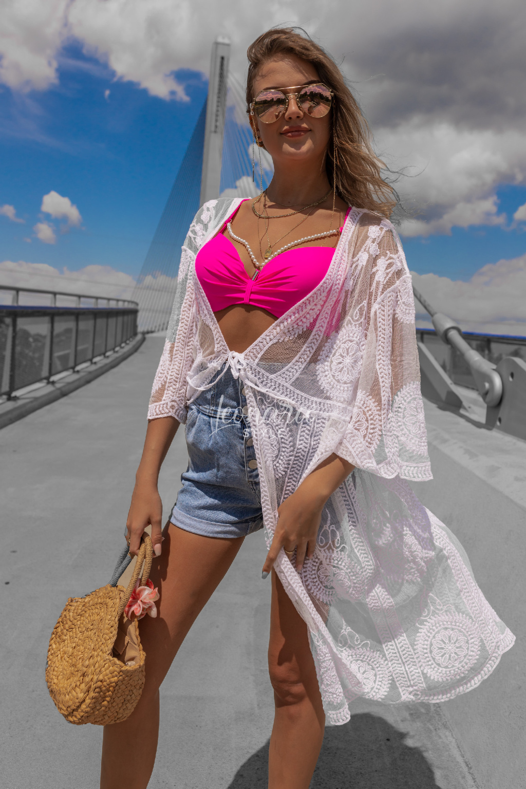Elegantní lehký přehoz s bohatým krajkovým vzorem, ideální na plavky i jako doplněk k letnímu outfitu. Transparentní materiál s vázáním v pase vytváří vzdušný a ženský vzhled. Hodí se na pláž, k bazénu i na procházku po letovisku.