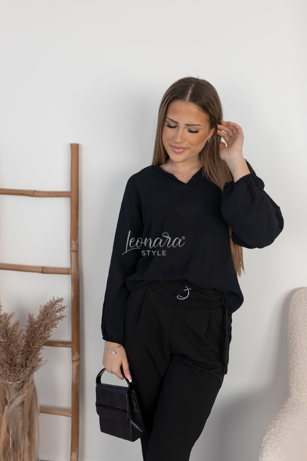 Nadčasová černá košile, která se stane základem každého šatníku. Volnější rukávy zakončené gumičkou dodávají modelu lehkost a pohodlí při nošení. Košile nemá zapínání na knoflíky, díky čemuž působí čistě a moderně. Véčkový výstřih s límečkem krásně zvýrazní dekolt a podtrhne elegantní vzhled. Velmi příjemný materiál zajišťuje komfort po celý den. Skvěle se kombinuje s koženkovými legínami, kalhotami sukněmi.