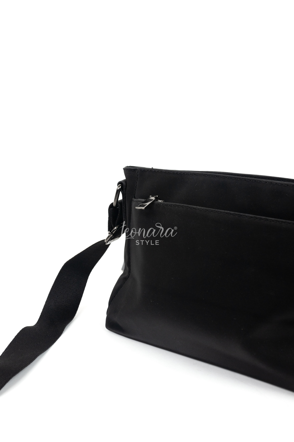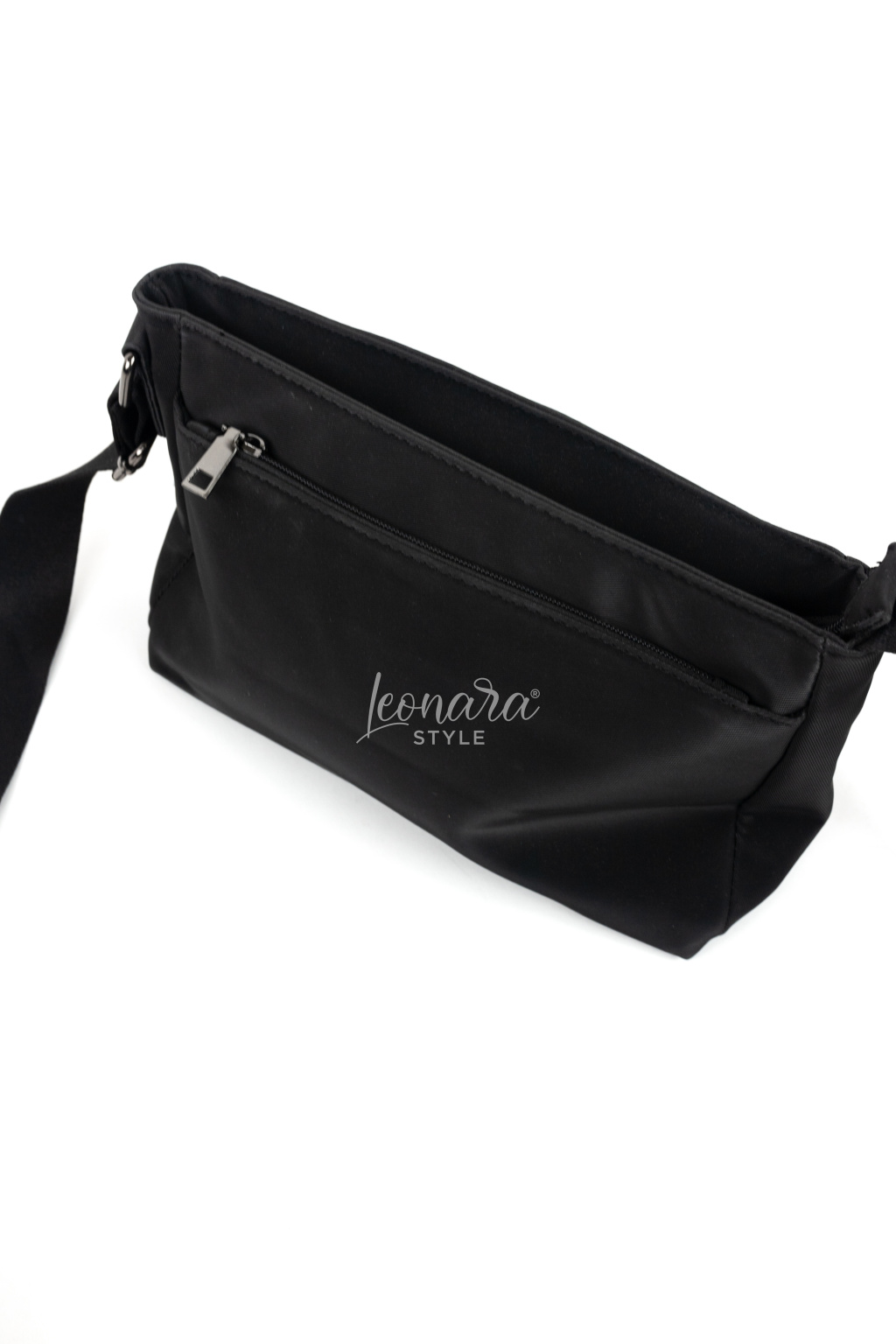 Černá kabelka z pevného látkového materiálu s pogumovanou, nepromokavou úpravou je ideální pro každodenní využití i do nepříznivého počasí. Praktický a jednoduchý design doplňují zipové detaily, které podtrhují její funkčnost. Nabízí přehledně řešený úložný prostor s několika kapsami na zip i menší vnitřní přihrádkou na drobnosti, takže budete mít své věci vždy dobře uspořádané. Délkově nastavitelný popruh umožňuje pohodlné nošení přes rameno nebo jako crossbody. Skvělá volba do města, na cestování i běžné pochůzky.