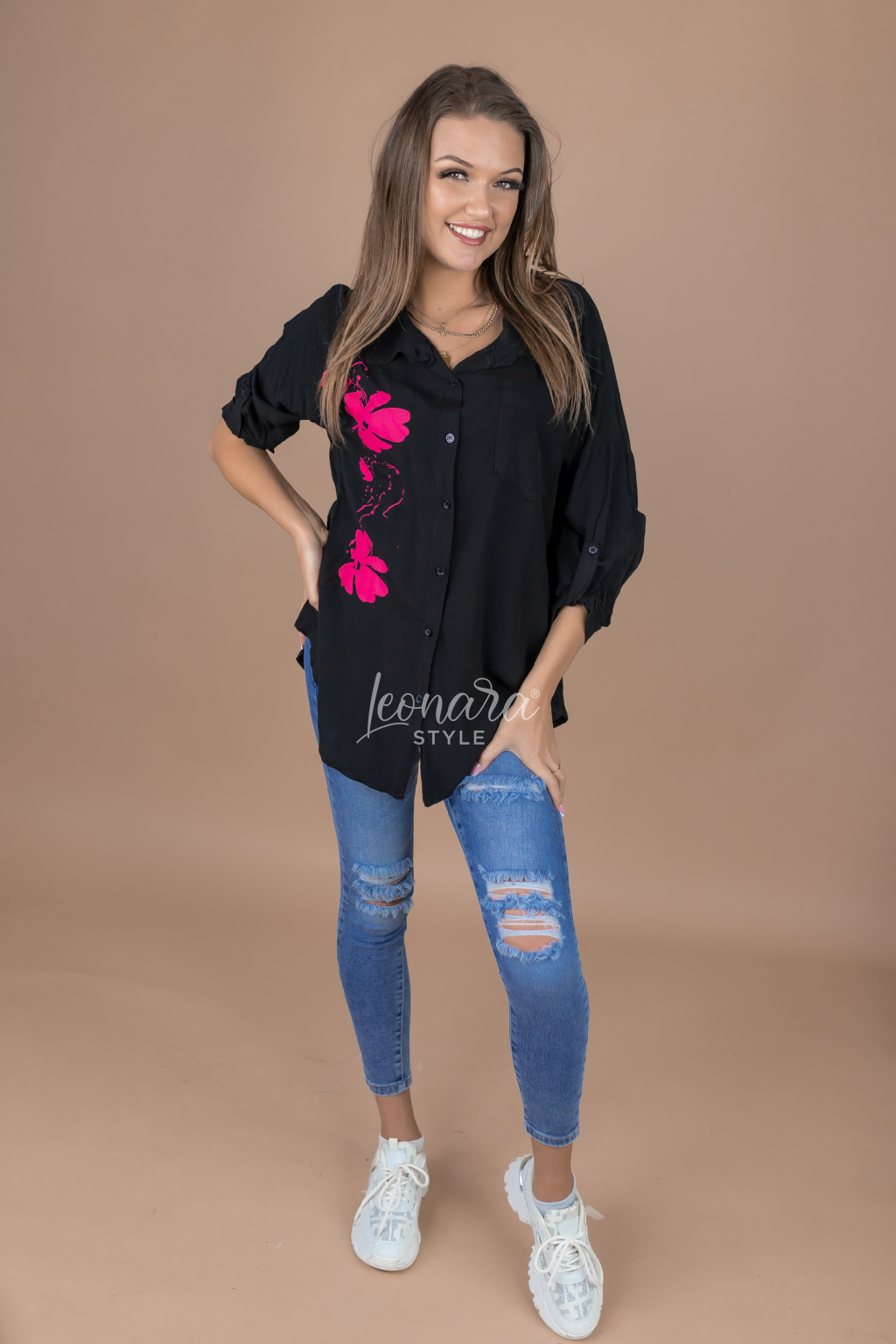 Lehoučká delší košile s výrazným neonovým potiskem květiny a praktickým zapínáním na knoflíky. Je mimořádně příjemná na nošení, hebká na dotek a díky svému vzdušnému střihu nabízí maximální pohodlí. Nadčasový kousek s přední kapsičkou, který lze nosit volně pro ležérní vzhled nebo stylově zakasaný, čímž dodá šmrnc každému outfitu – od jarních procházek až po letní dny.