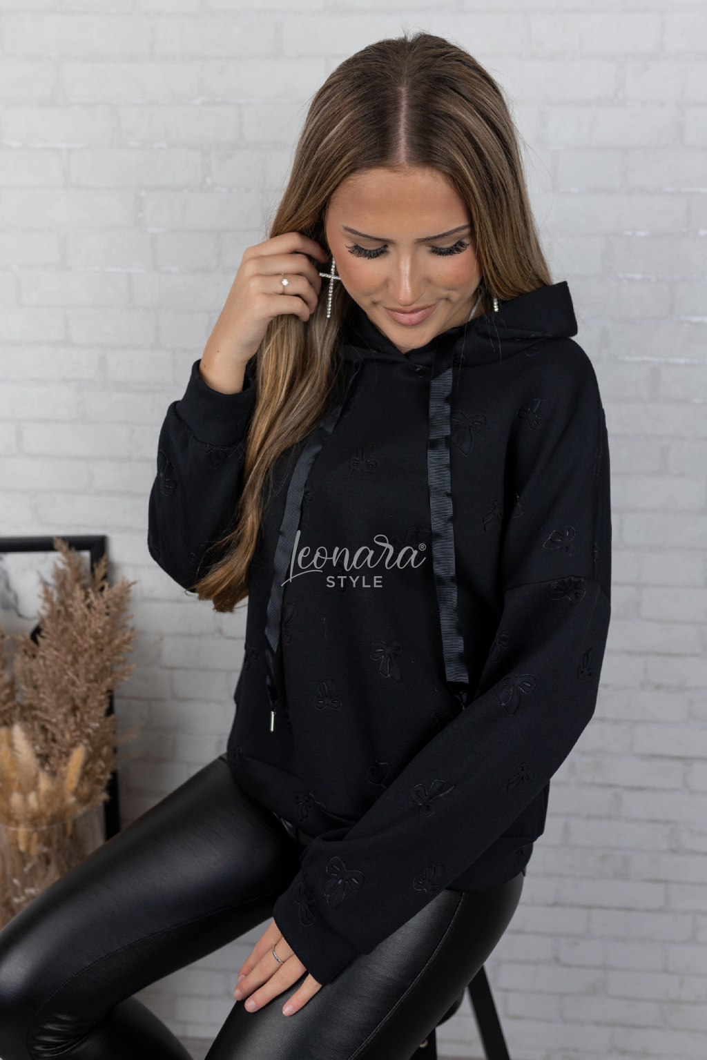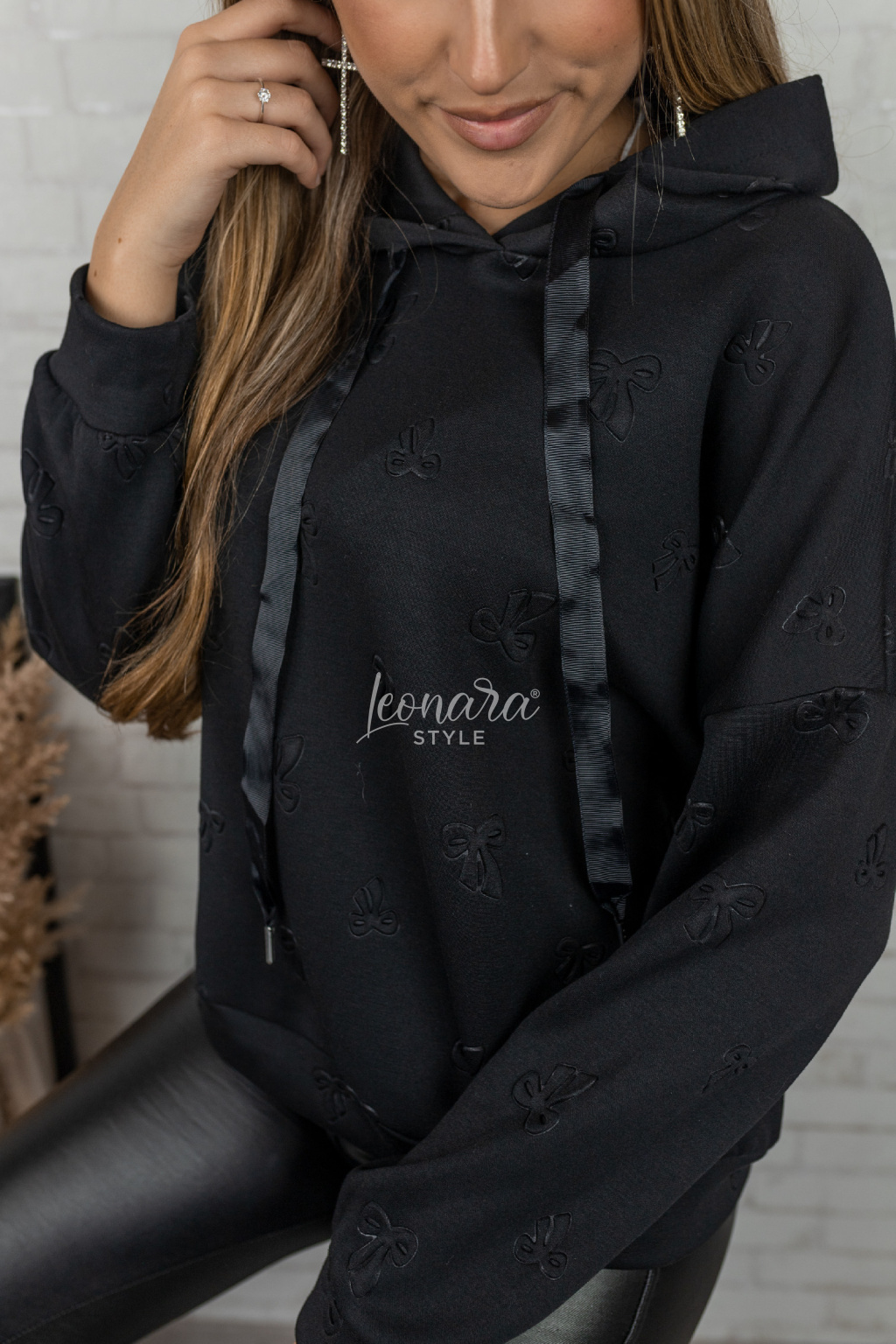 Objevte pohodlí a styl v této dámské mikině s kapucí, která zaujme originálním vzorem jemně vyražených mašliček. Černé šňůrky dodávají mikině moderní kontrastní detail, zatímco čistý střih bez kapes působí elegantně a minimalisticky. Příjemný materiál vám zajistí komfort při každodenním nošení i volném čase.
