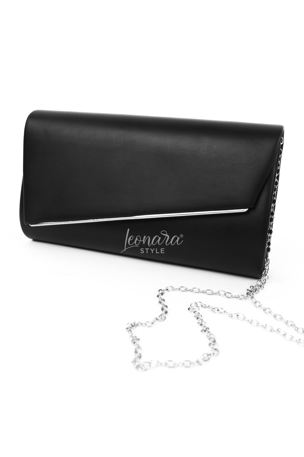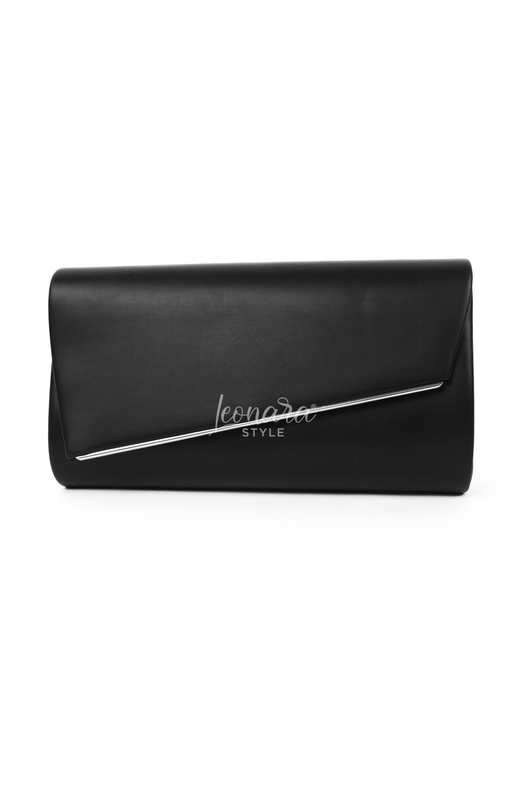 Černé psaníčko zaujme asymetrickým tvarem, podélně zdobeným stříbrným detailem. Magnetický druk zajistí pohodlné a bezpečné zapínání, zatímco odepínací řetízek ze stejného materiálu umožňuje nosit psaníčko v ruce nebo elegantně přes rameno. Uvnitř se nachází praktická kapsa na drobnosti. Tento stylový doplněk skvěle doplní váš outfit na plesy, svatby i jiné slavnostní příležitosti.
