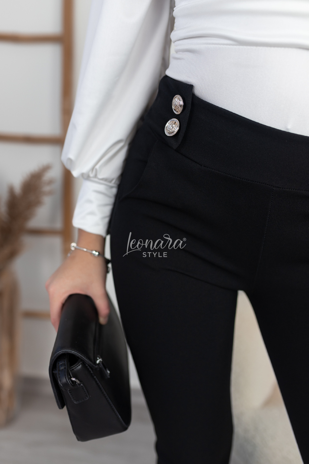 Elegantní kalhoty se střihem jemně do zvonu, který lichotí postavě a opticky prodlužuje nohy. Jsou mimořádně příjemné na nošení, hebké na dotek a díky kvalitnímu materiálu skvěle drží tvar. Nadčasový kousek s praktickými kapsami a ozdobnými zlatými knoflíky v pase, který dodá šmrnc každému outfitu – od pracovních schůzek až po večerní společenské události.