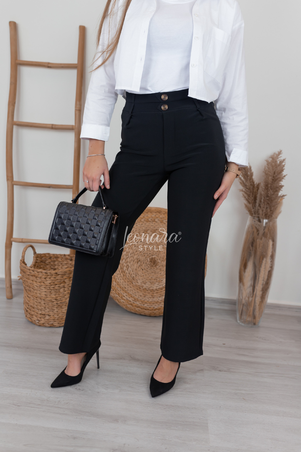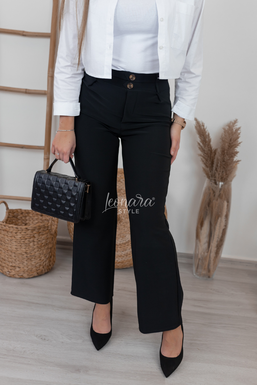 Stylové elegantní kalhoty z velmi příjemného a pohodlného materiálu, který se skvěle nosí po celý den. Kalhoty mají rovný střih, který krásně prodlužuje postavu a působí velmi elegantně. V pase mají pružnou gumu, díky které jsou pohodlné a dobře se přizpůsobí postavě. Přední část zdobí ozdobné knoflíky a vzadu se nachází praktické kapsy. Kalhoty jsou ideální pro vyšší postavy.