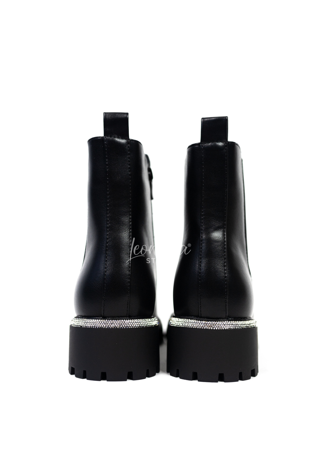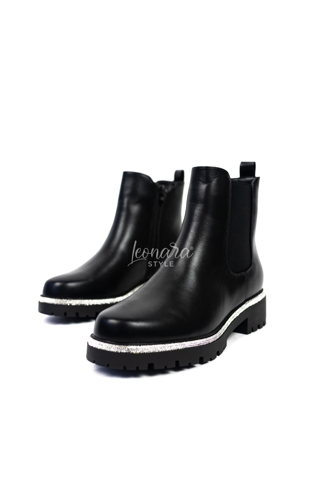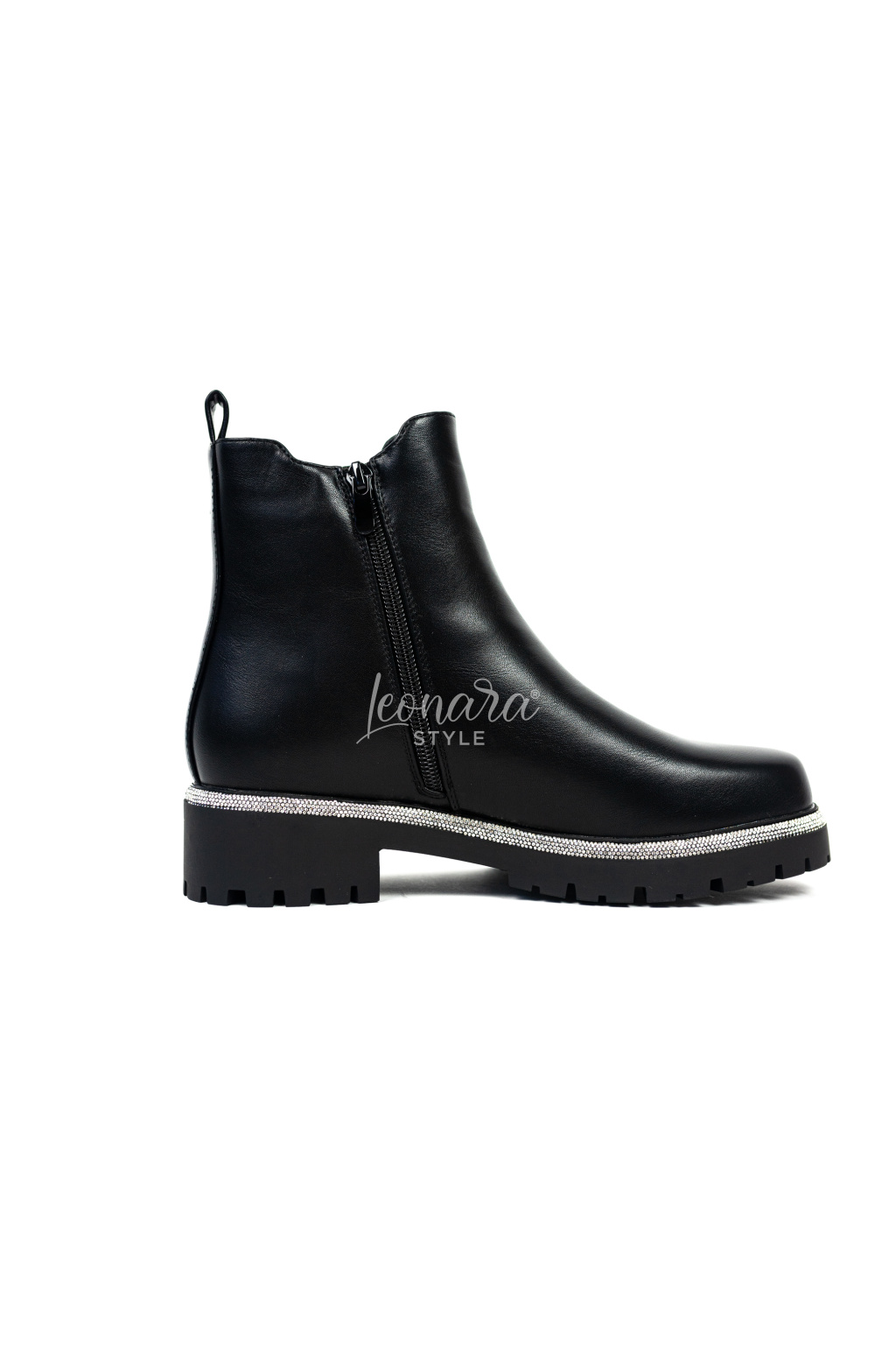 Stylové a elegantní černé kotníčkové boty, které zaujmou jemným, ale efektním detailem – kamínkovou linií podél podrážky. Tento decentní lesk dodává botám šmrnc a dělá z nich ideální volbu pro každodenní i slavnostnější outfit.