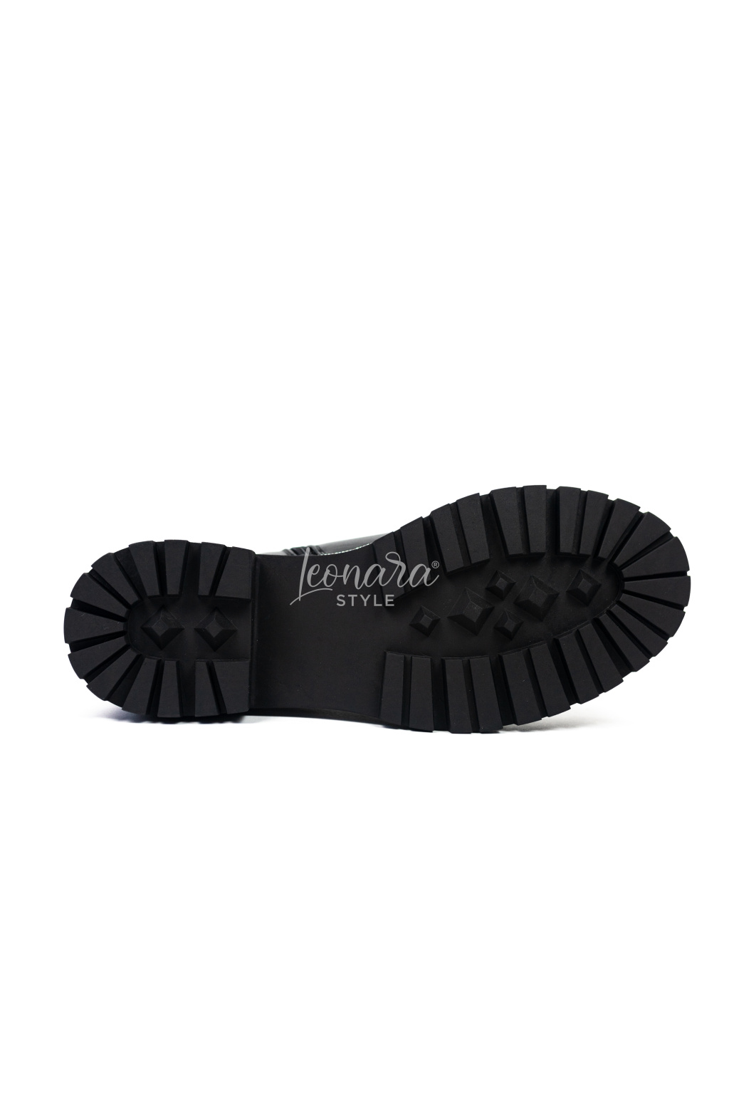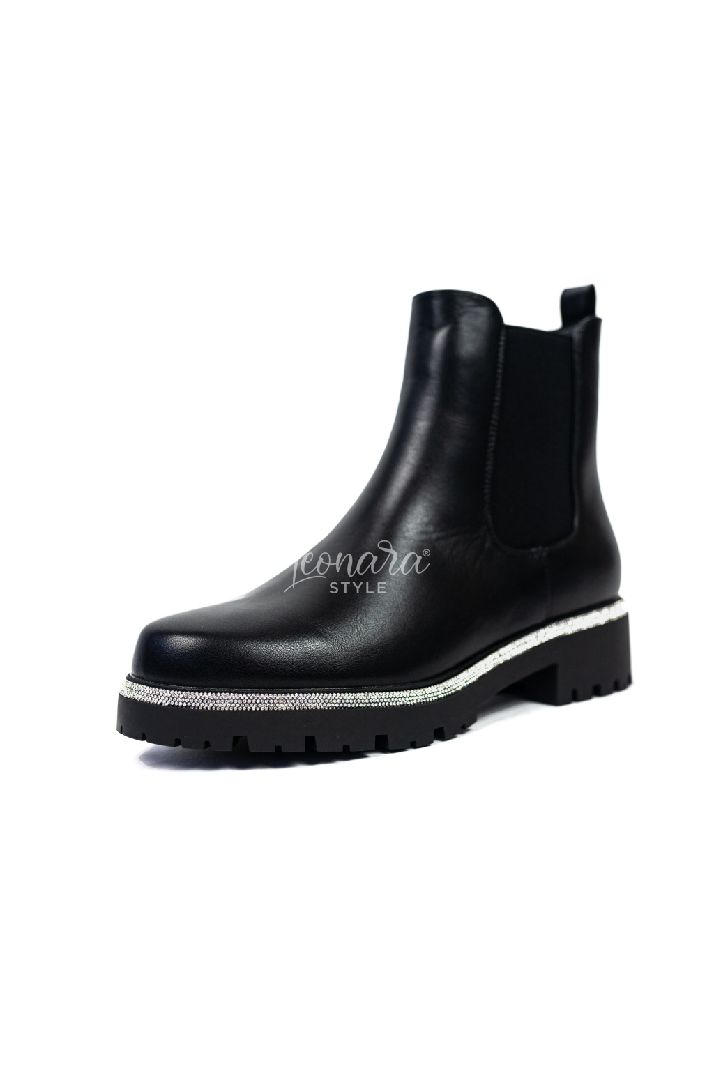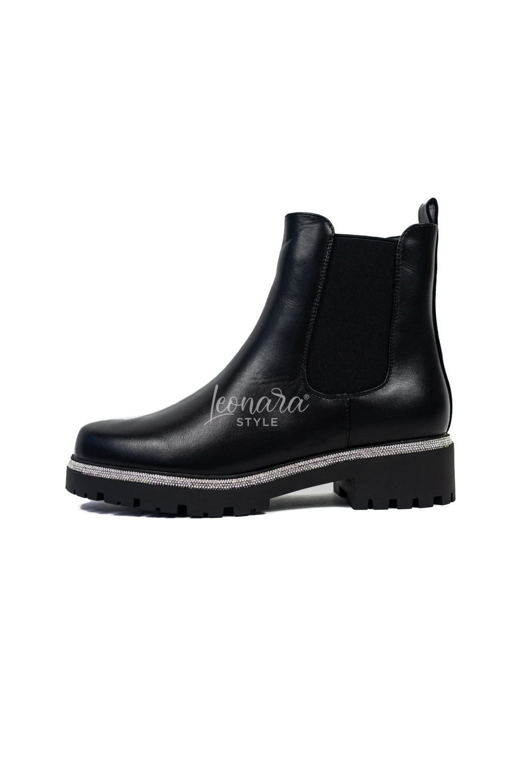Stylové a elegantní černé kotníčkové boty, které zaujmou jemným, ale efektním detailem – kamínkovou linií podél podrážky. Tento decentní lesk dodává botám šmrnc a dělá z nich ideální volbu pro každodenní i slavnostnější outfit.
