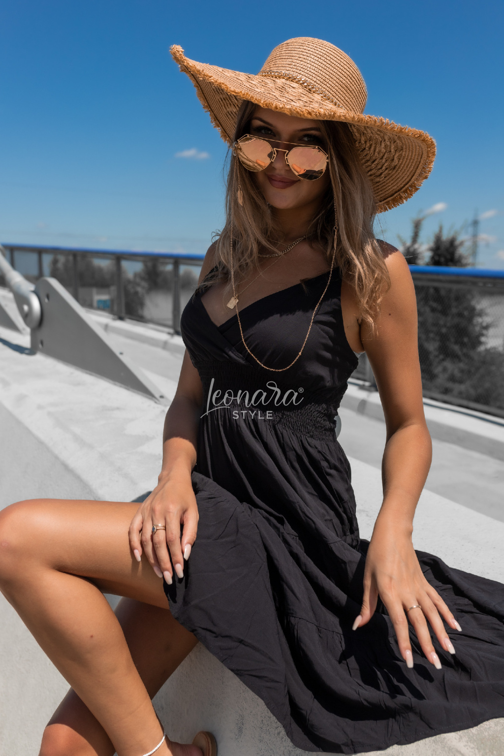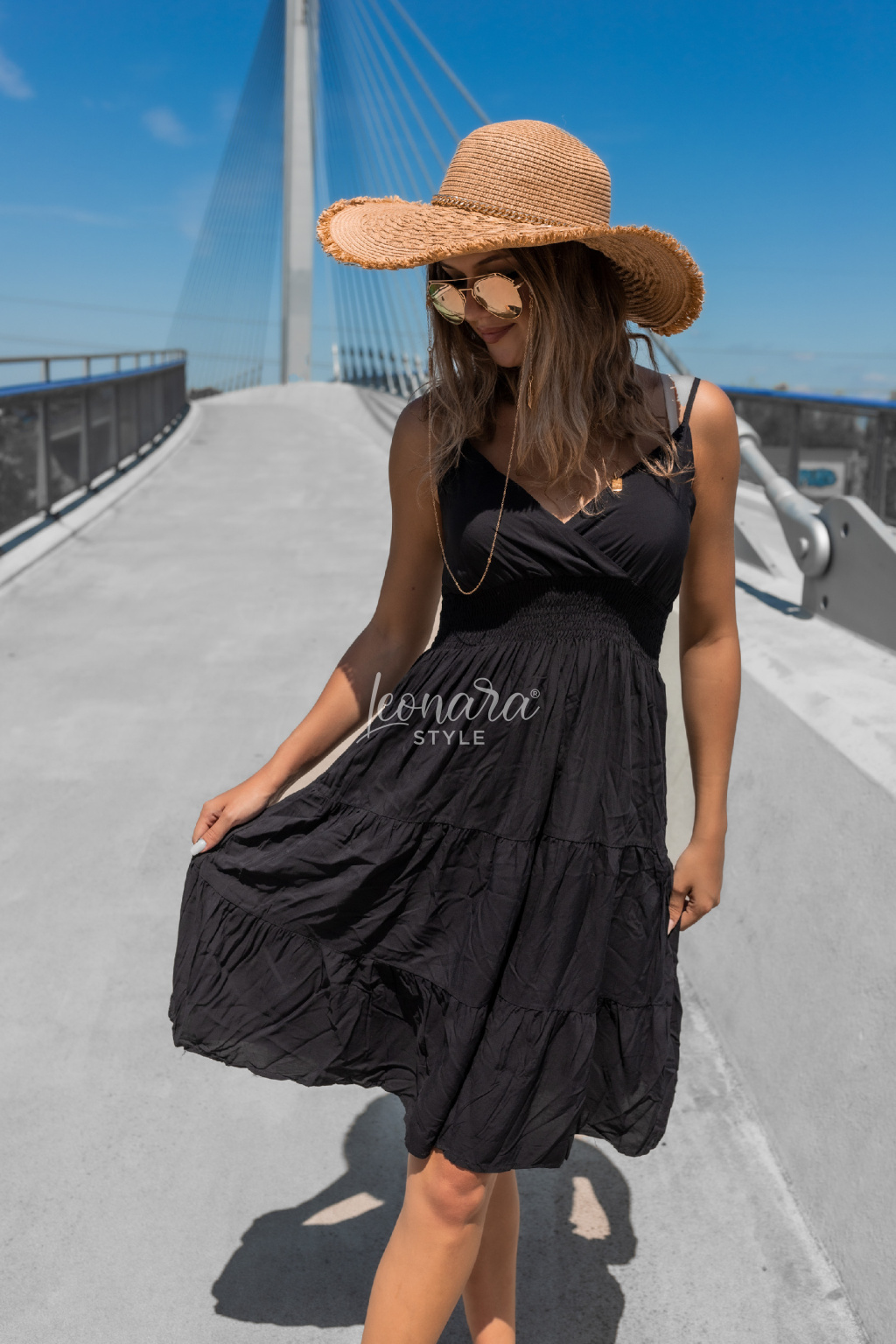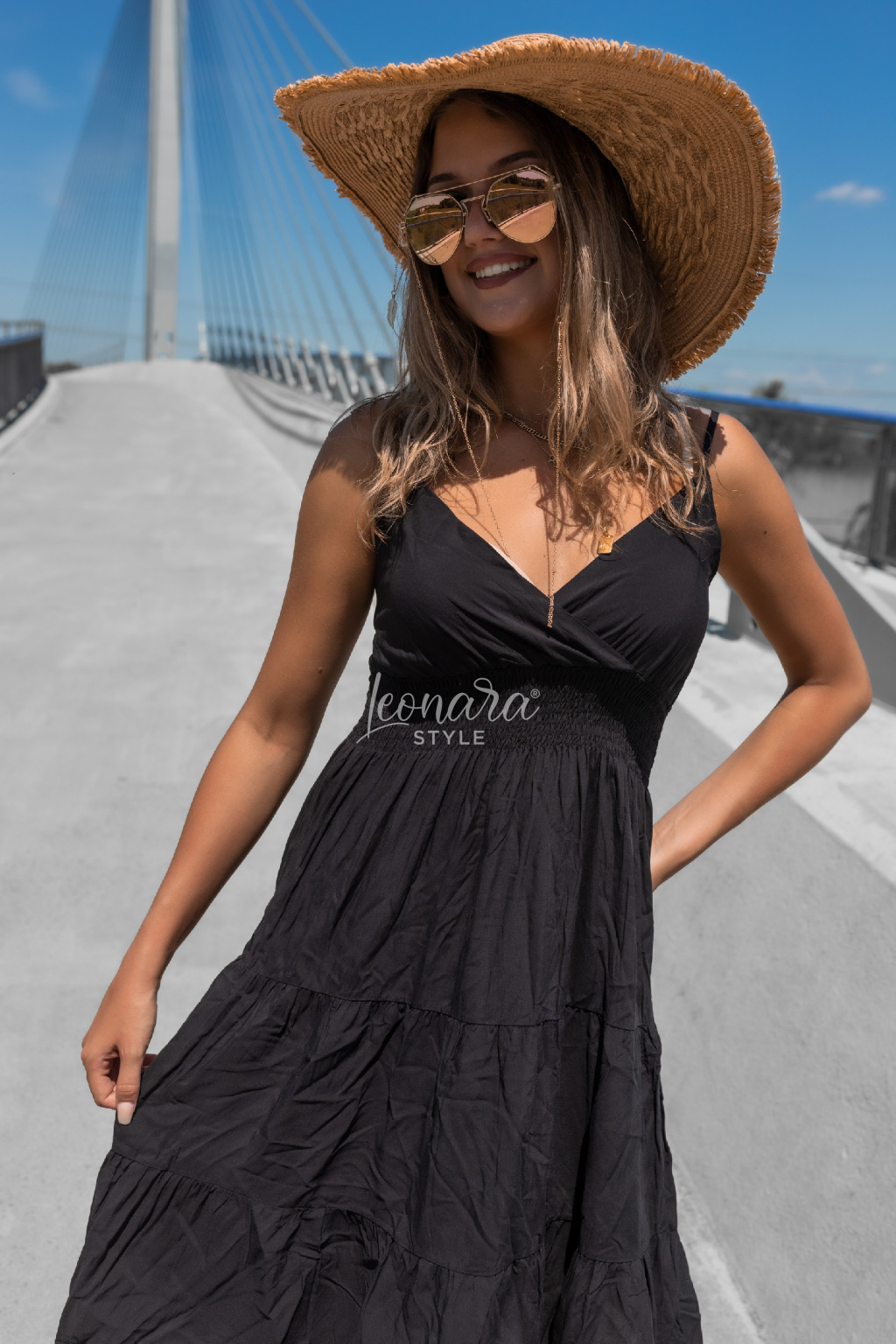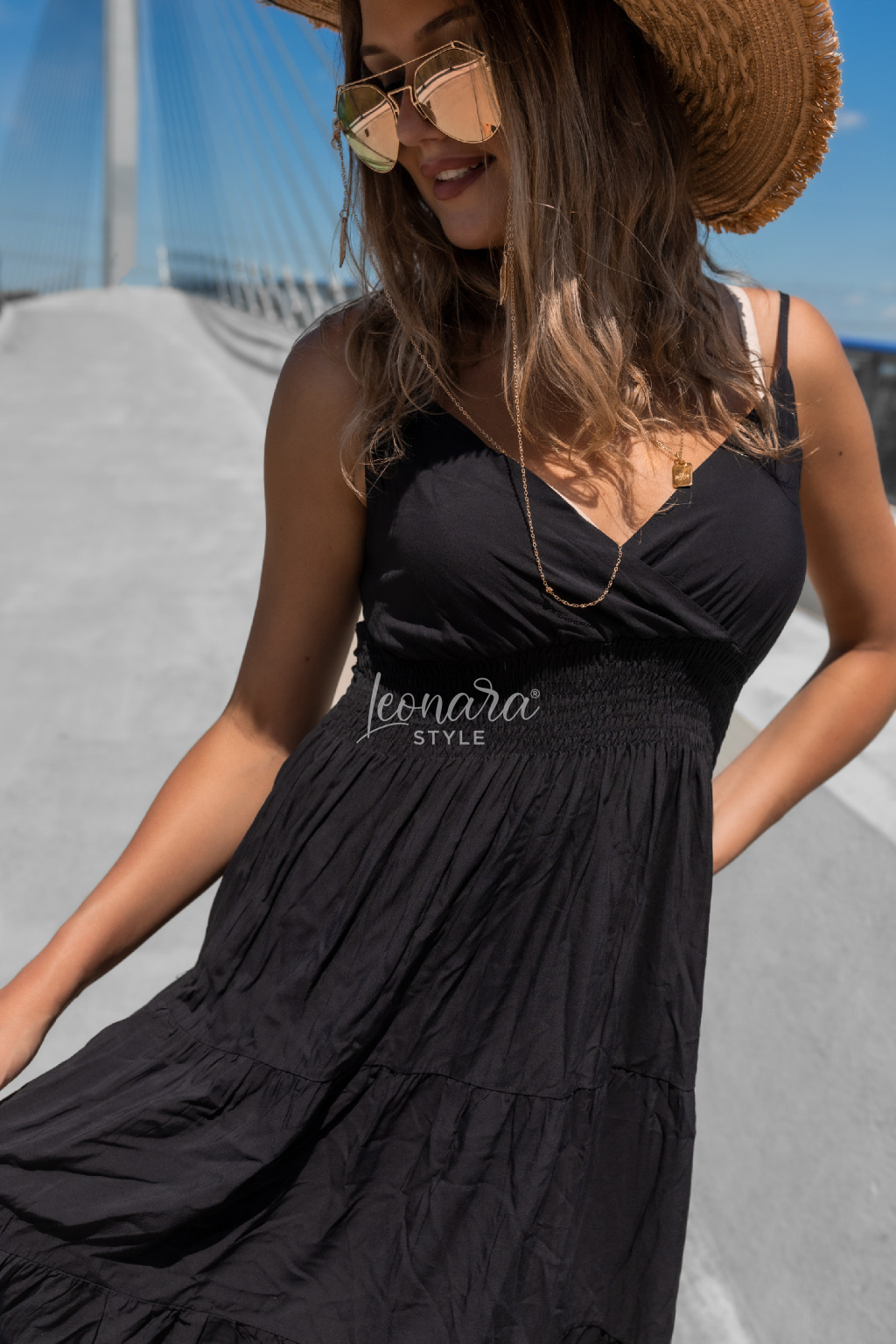 Romantické letní šaty v černé barvě s jemným zavinovacím výstřihem a žabkováním v pase krásně zvýrazní siluetu a zároveň nabídnou maximální pohodlí. Lehký, prodyšný materiál a volnější střih s volánky z nich dělají ideální kousek na dovolenou, procházky i letní posezení. Šaty, ve kterých se budete cítit lehce a přirozeně. Tenká ramínka jsou nastavitelná.