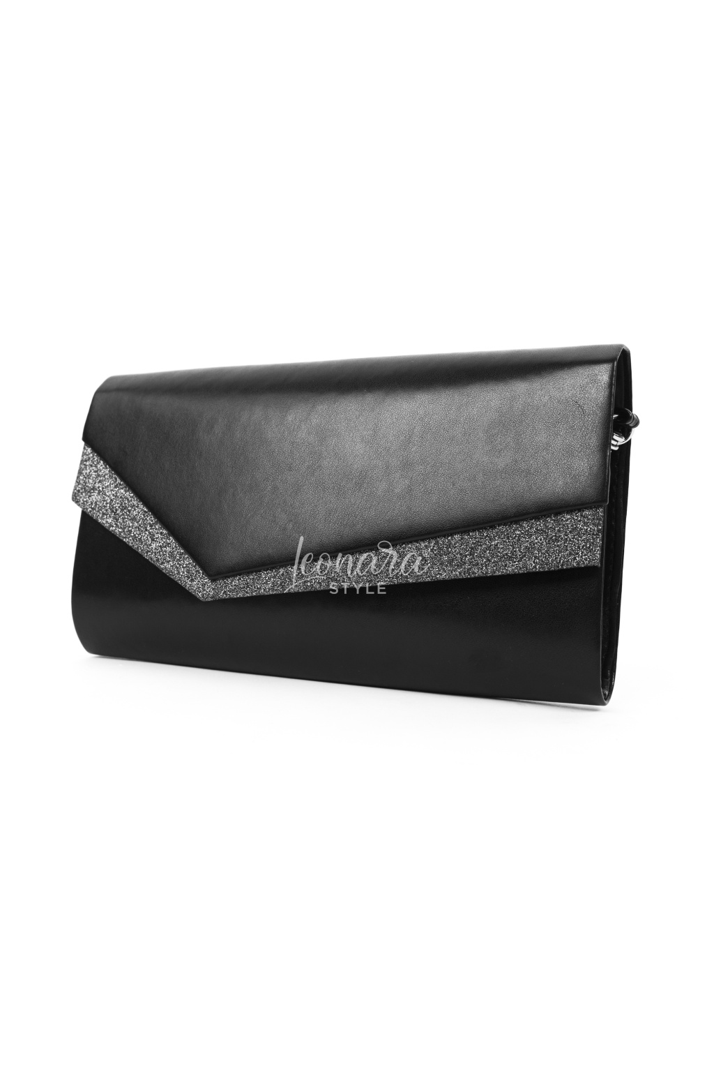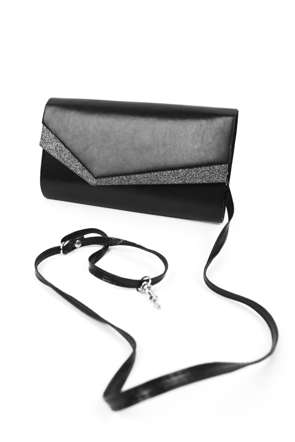 Černé psaníčko upoutá asymetrickým tvarem a kombinací matného a jemně třpytivého povrchu. Magnetický druk zajistí pohodlné a bezpečné zapínání, zatímco odepínací řemínek ze stejného materiálu umožňuje nosit psaníčko v ruce nebo elegantně přes rameno. Uvnitř se nachází praktická kapsa na drobnosti. Tento stylový doplněk je ideální pro plesy, svatby i jiné slavnostní příležitosti.
