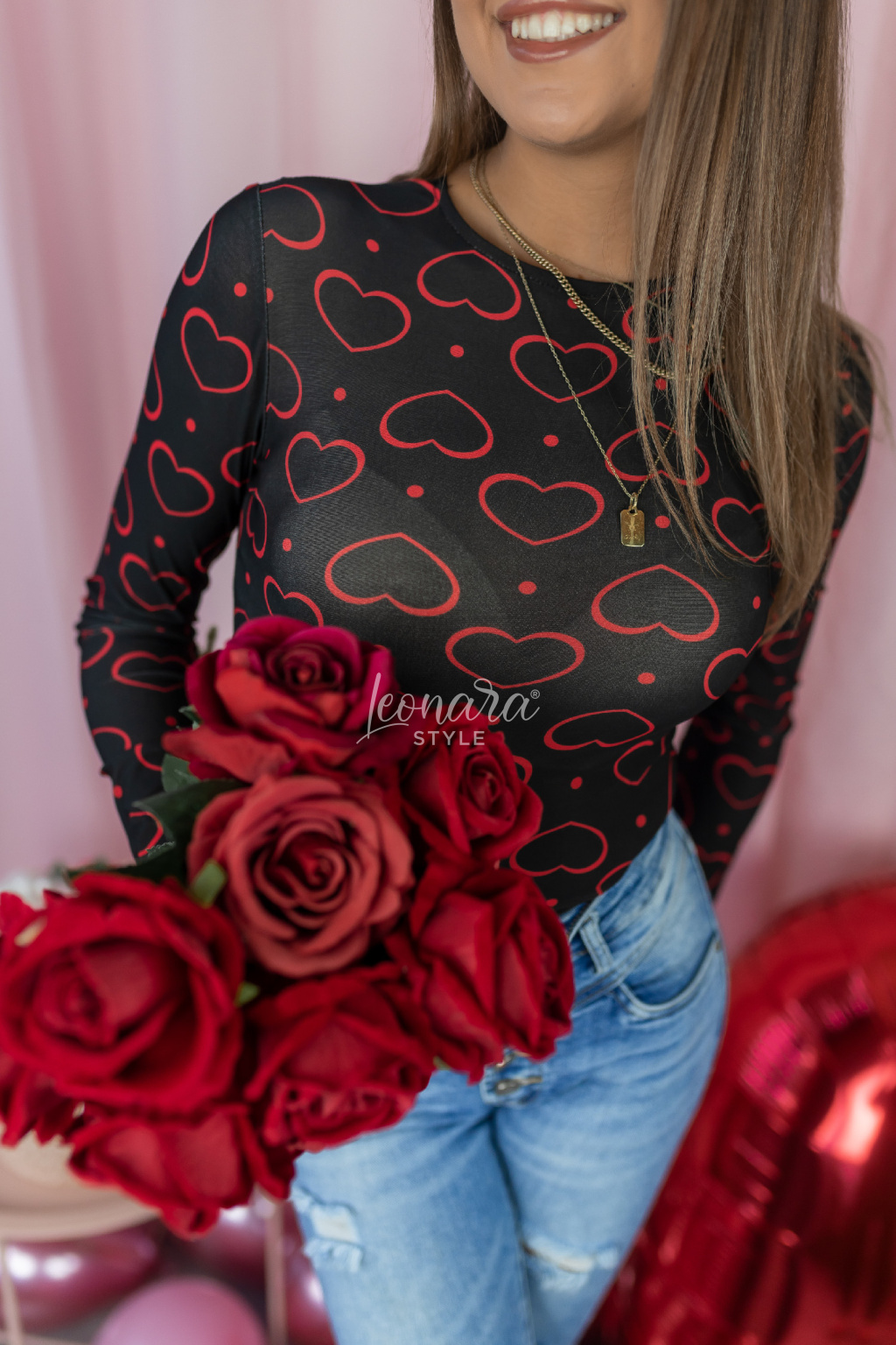 Stylové srdíčkové body s dlouhým rukávem je ideálním kouskem pro výrazný a zároveň ženský outfit. Přiléhavý střih krásně obepne postavu a zvýrazní siluetu. Kulatý výstřih působí jemně a univerzálně, takže se body snadno kombinuje s kalhotami, sukní i sakem. Chladivý materiál je velmi příjemný na nošení a zajistí komfort po celý den. Celoplošný potisk se srdíčky dodává modelu hravý a moderní vzhled. Při obléknutí je body jemně průsvitné, což mu dodává lehce smyslný nádech. Zapínání na podprsenkové háčky usnadňuje oblékání i nošení.