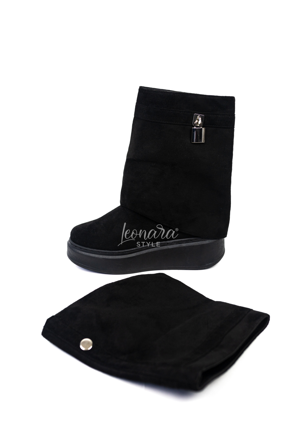 Měkký semišový materiál je příjemný na dotek, zatímco zvýšená platforma-podrážka poskytuje pohodlí i lepší izolaci od chladu. Minimalistický design doplňuje elegantní kovová dekorace na vrchní části.