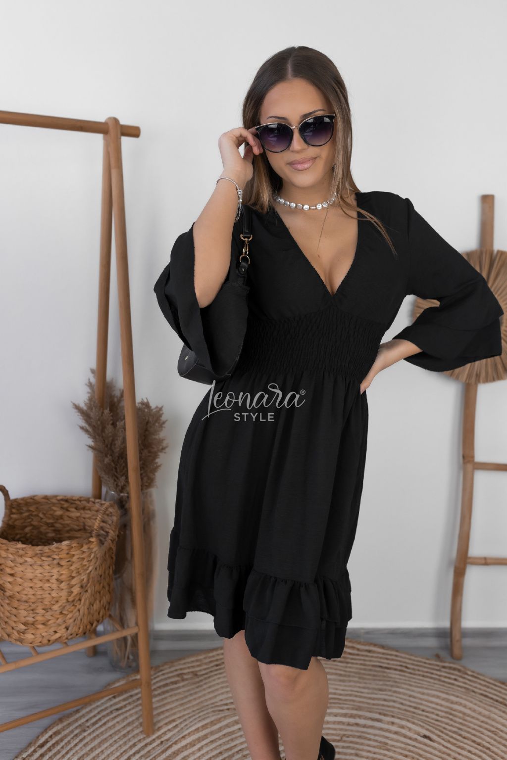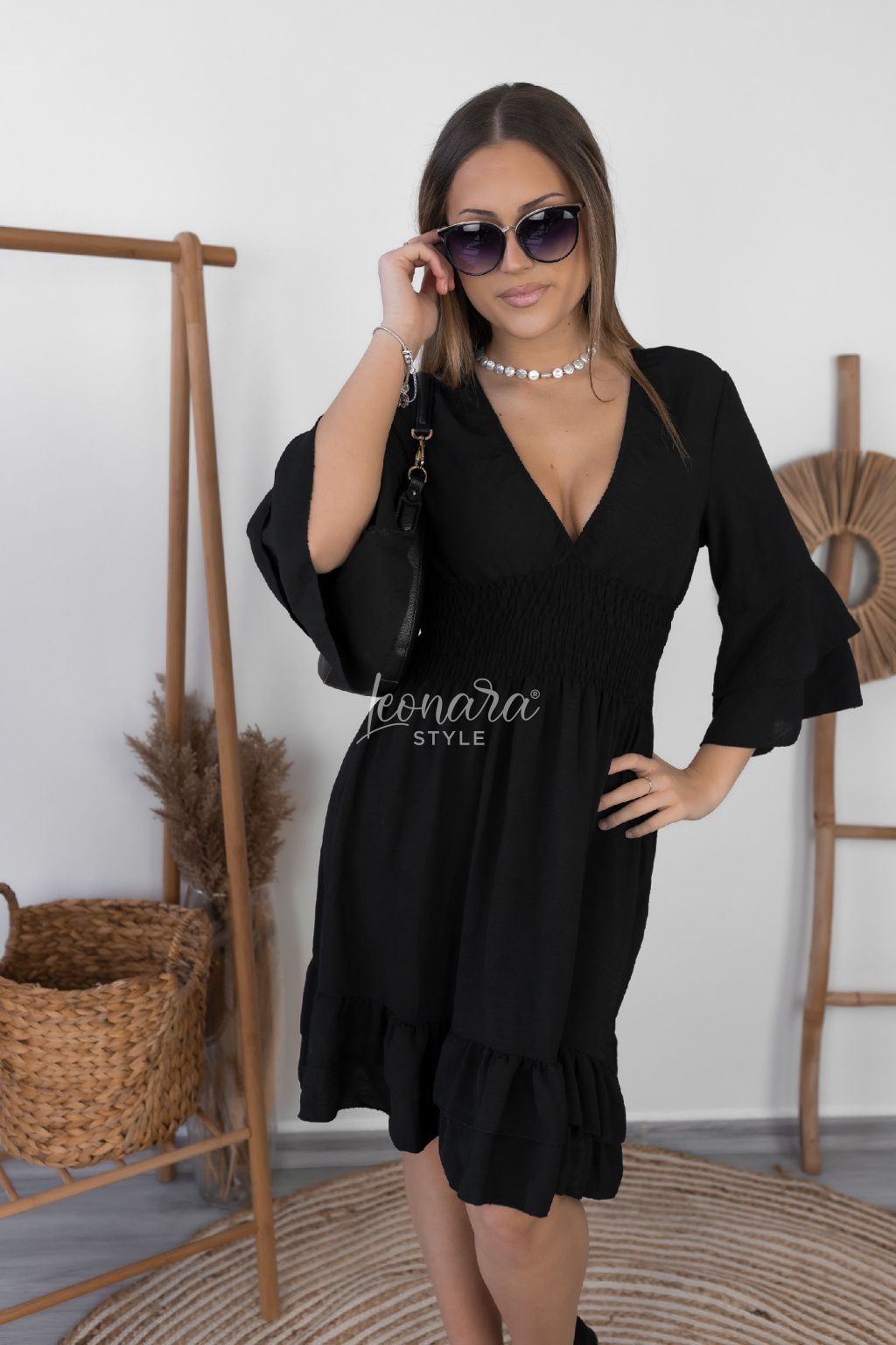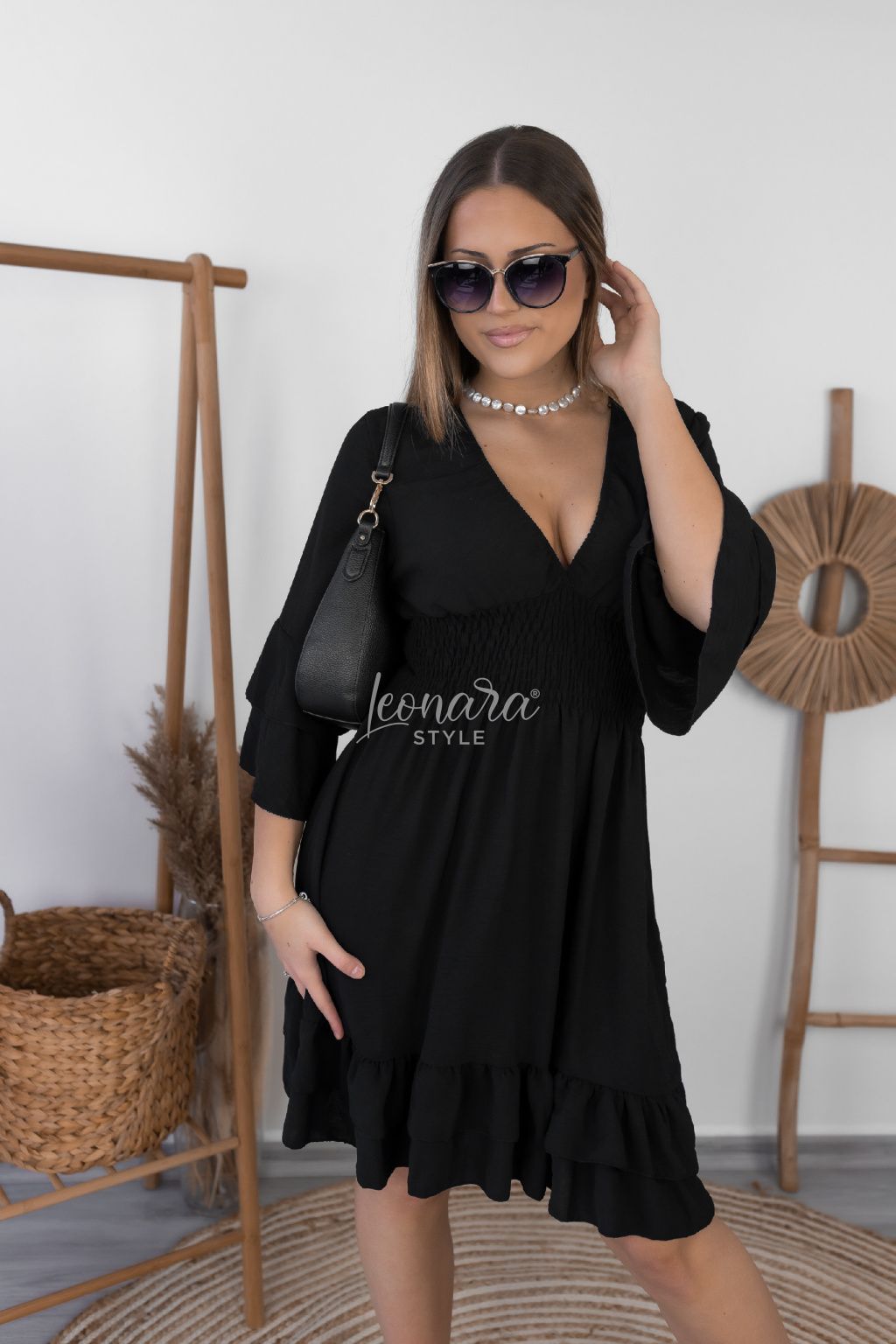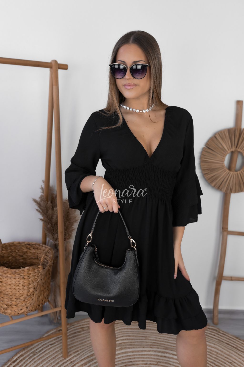 Jednobarevné volánkové letní šaty z velmi příjemného, lehkého materiálu. Mají elegantní výstřih do V a v pase širokou gumu, která krásně zvýrazní siluetu. Rukávy i spodní lem jsou doplněny jemným volánkem, který dodává šatům ženský a vzdušný vzhled. Ideální volba na teplé letní dny i lehce elegantní příležitosti.