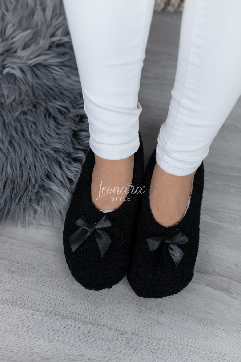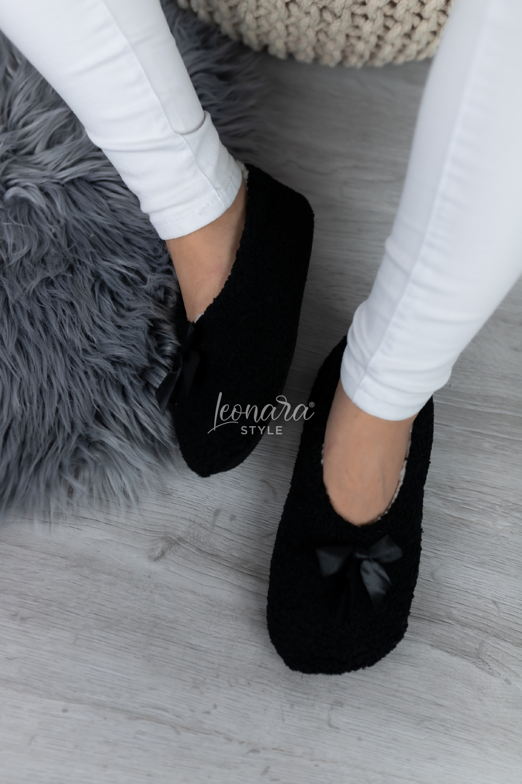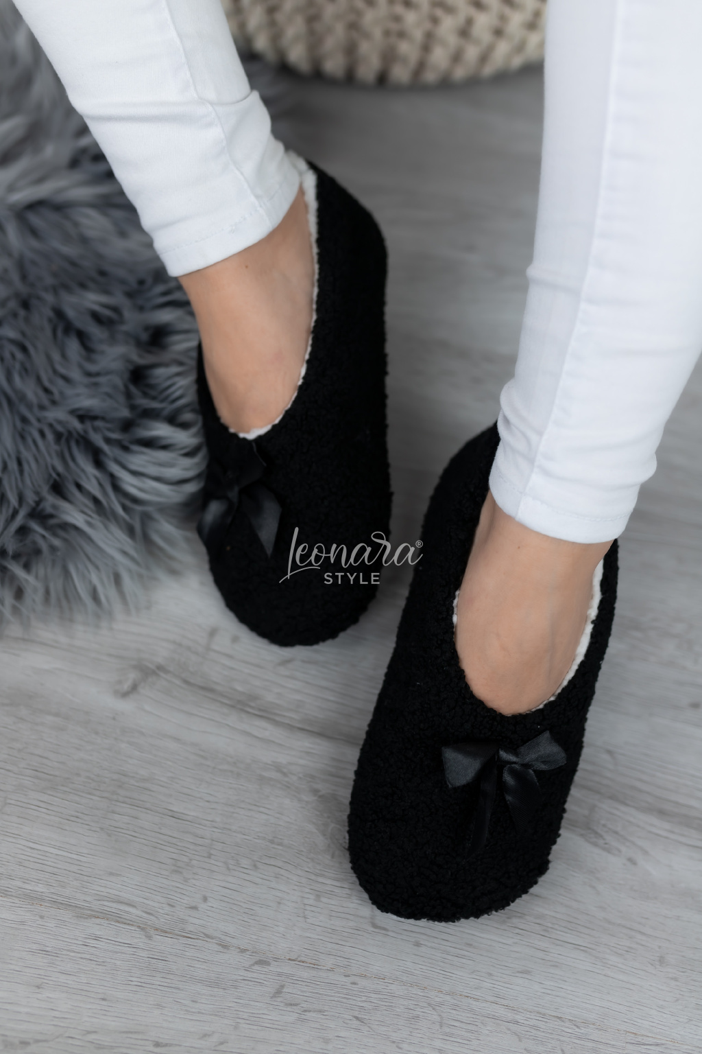 Elegantní a nadčasové domácí bačkůrky ve tvaru balerín, které vynikají svou jednoduchostí a pohodlím. Jsou zateplené hebkým kožíškem, takže příjemně zahřejí, a ozdobná mašle dodává jemný ženský detail. Jednobarevné provedení se snadno kombinuje s domácím outfitem. Protiskluzová podrážka zajistí bezpečný pohyb po bytě.