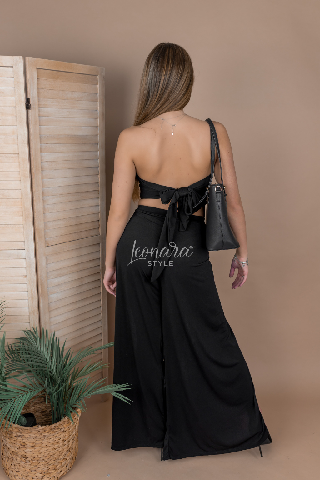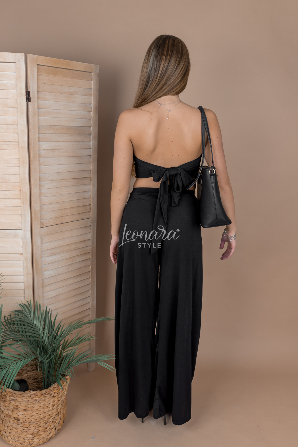 Tento dlouhý letní komplet je ideální volbou pro ty, které hledají stylový a zároveň pohodlný outfit do teplého počasí. Vrchní díl tvoří dlouhý pás látky, který se zavazuje kolem hrudníku na různé způsoby, takže si můžete přizpůsobit vzhled podle své nálady či příležitosti. Kalhoty s vysokým pasem jsou široké, lehké a doplněné o rozparky, které dodávají outfitu pohyb a vzdušnost. Celý komplet je vyroben z velmi lehkého a prodyšného materiálu, což z něj dělá ideální volbu na letní dny, dovolenou nebo procházky u moře.