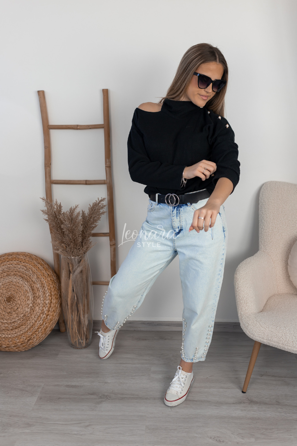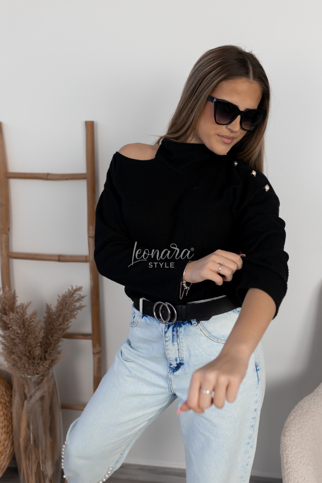Tento hebký svetr vás okouzlí jemnou texturou, která je neuvěřitelně příjemná na dotek. Jedno rameno je decentně spadlé, doplněné elegantními zlatými detaily s perlou, které dodávají outfitu luxusní nádech. Stojáček svetru je jemný a nenápadný, takže se hodí jak do každodenního nošení, tak i na speciální příležitosti.