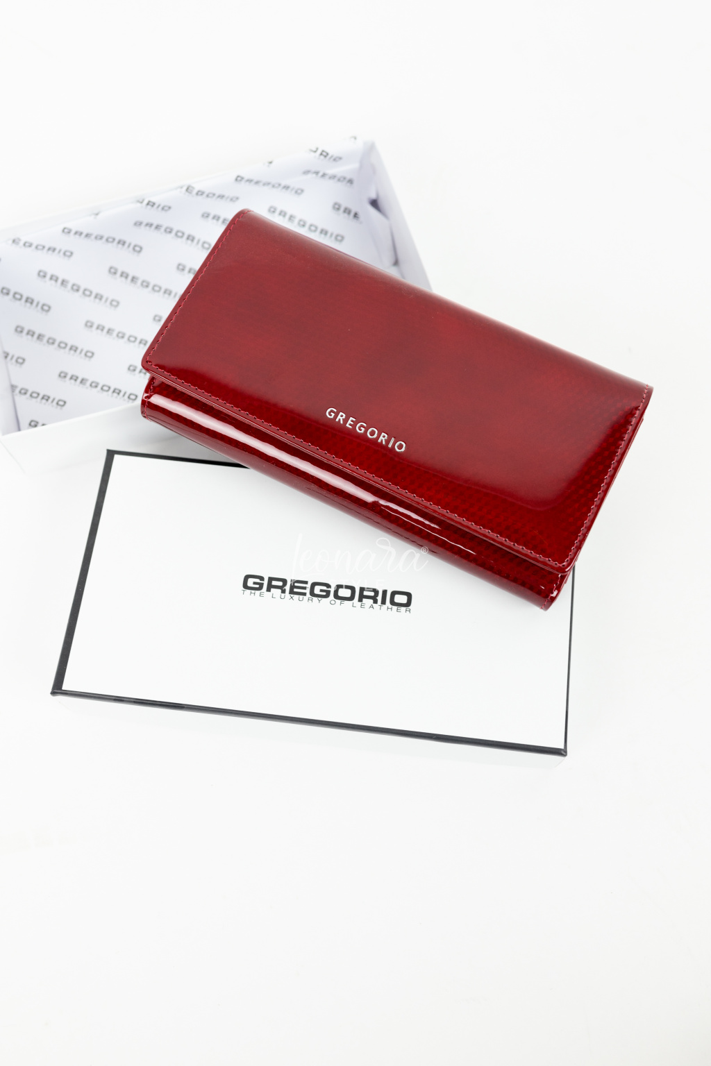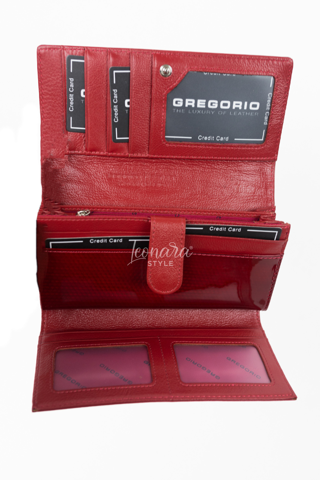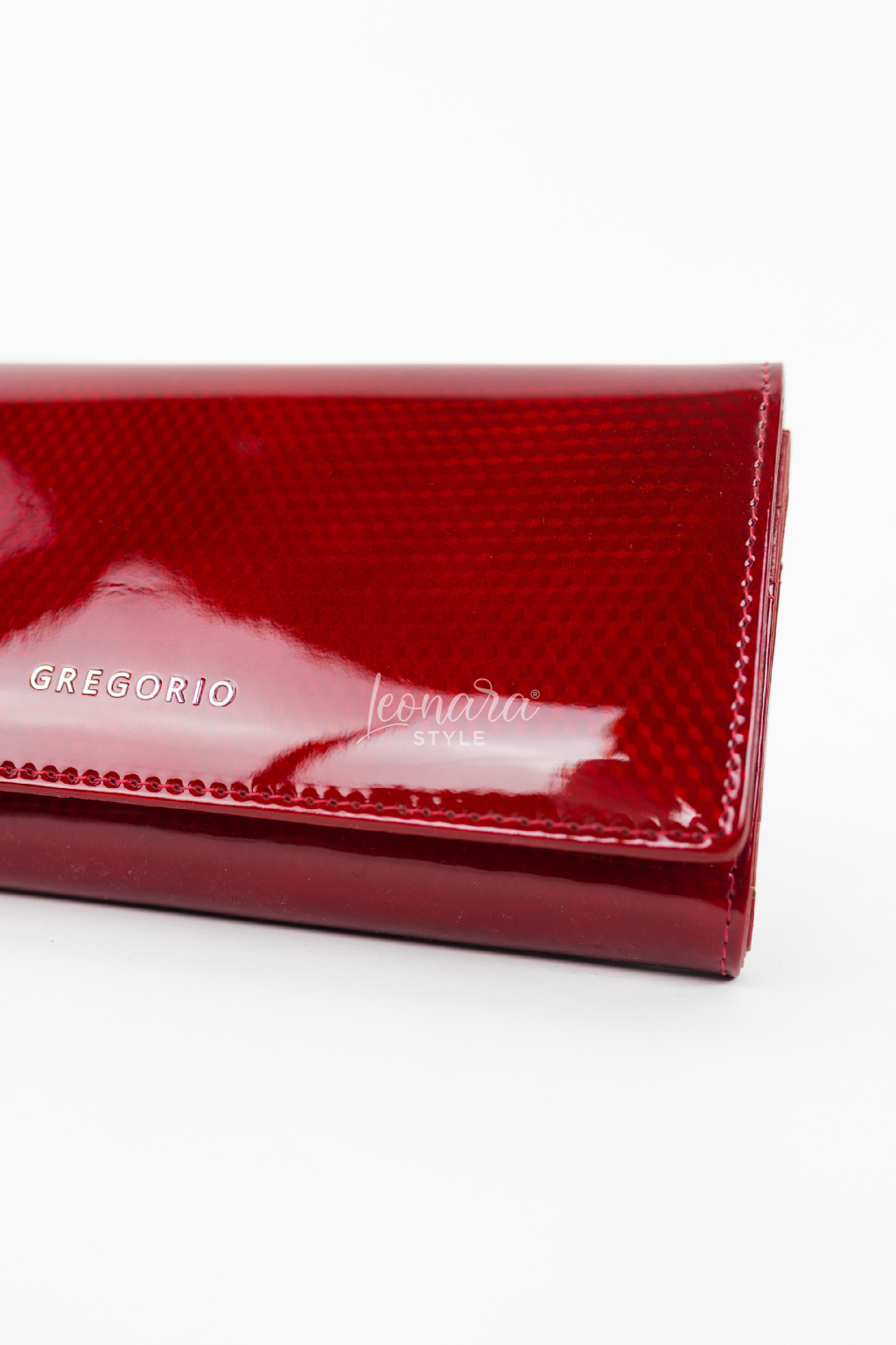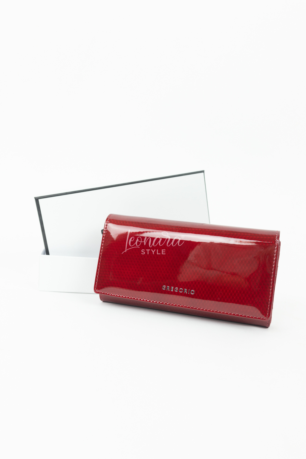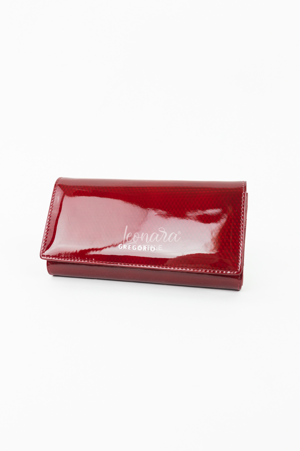 Elegantní lakovaná peněženka z pravé, vysoce kvalitní kůže zdobená decentním nápisem na přední straně. Uzavírá se praktickým cvočkem, jenž zajišťuje bezpečné a pohodlné používání.