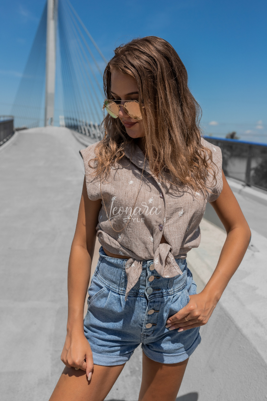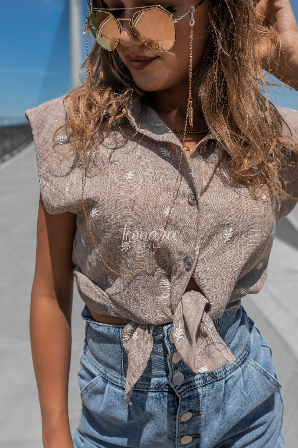 Letní košile bez rukávů z lehkého a vzdušného materiálu s vyšívaným vzorem. Má volnější střih, klasický límeček a zapínání na knoflíky. Spodní část lze zavázat do uzlu, nebo ji nechat volně – podle toho, jaký styl zvolíte. Skvělá k džínům, šortkám i sukním.