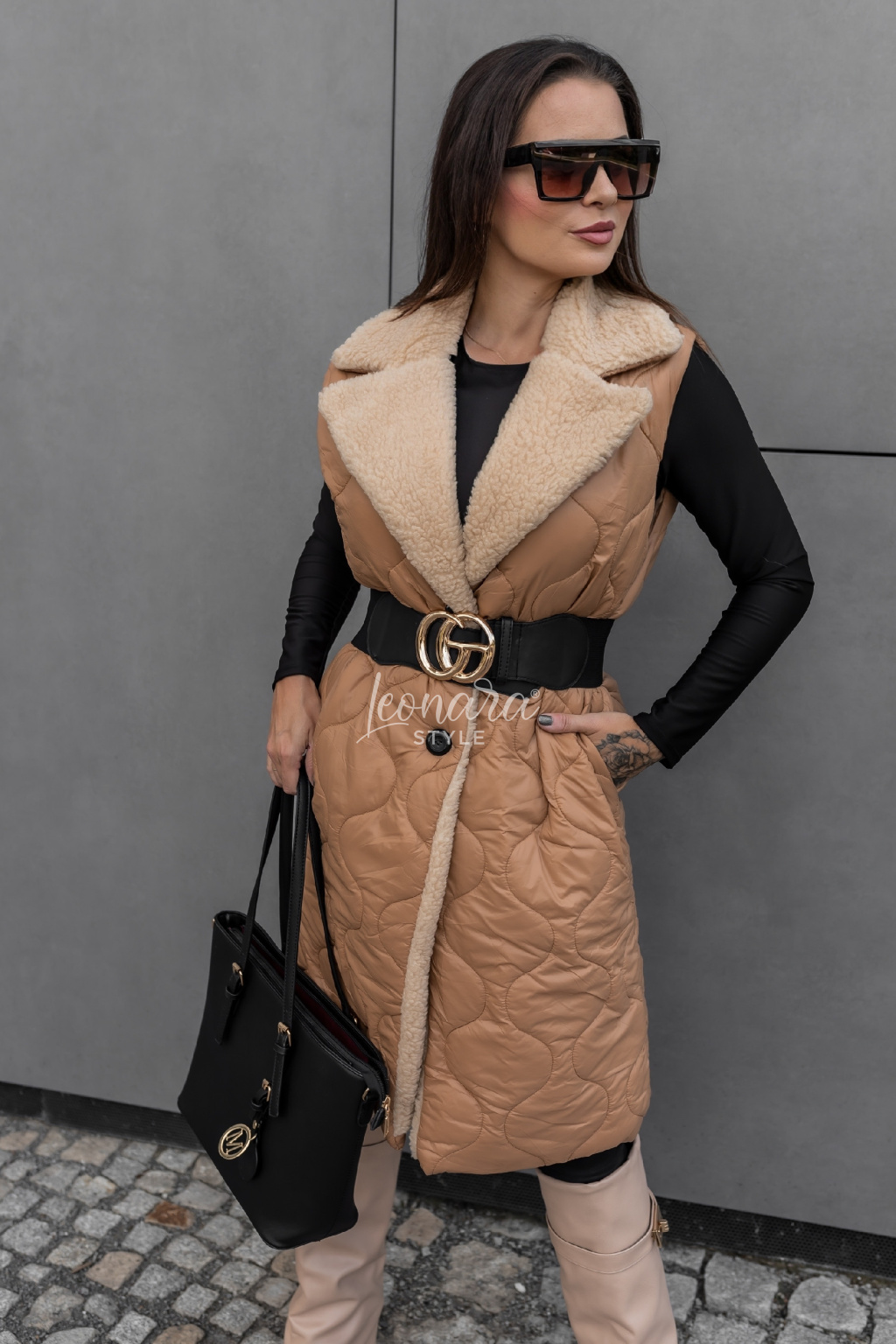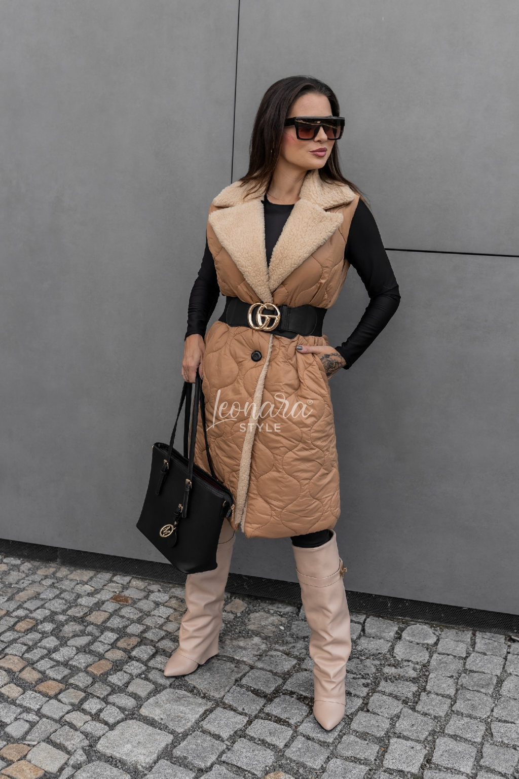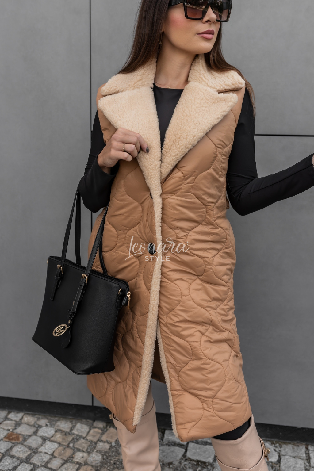 Prošívaná delší vesta se zapínáním na knoflíky a klopovým límcem s měkkým chlupatým vnitřkem. Po stranách má praktické kapsy a poutka na případný opasek, který však není součástí. Díky volnějšímu střihu se dobře kombinuje jak k šatům, tak i k úzkým kalhotám či džínám. Elegantní kousek, který snadno doladíš páskem podle svého stylu.