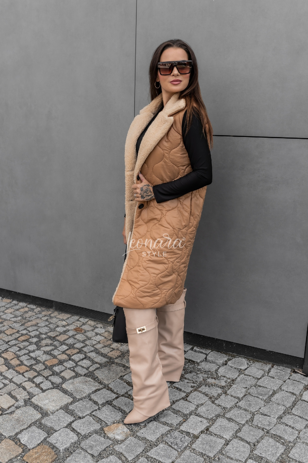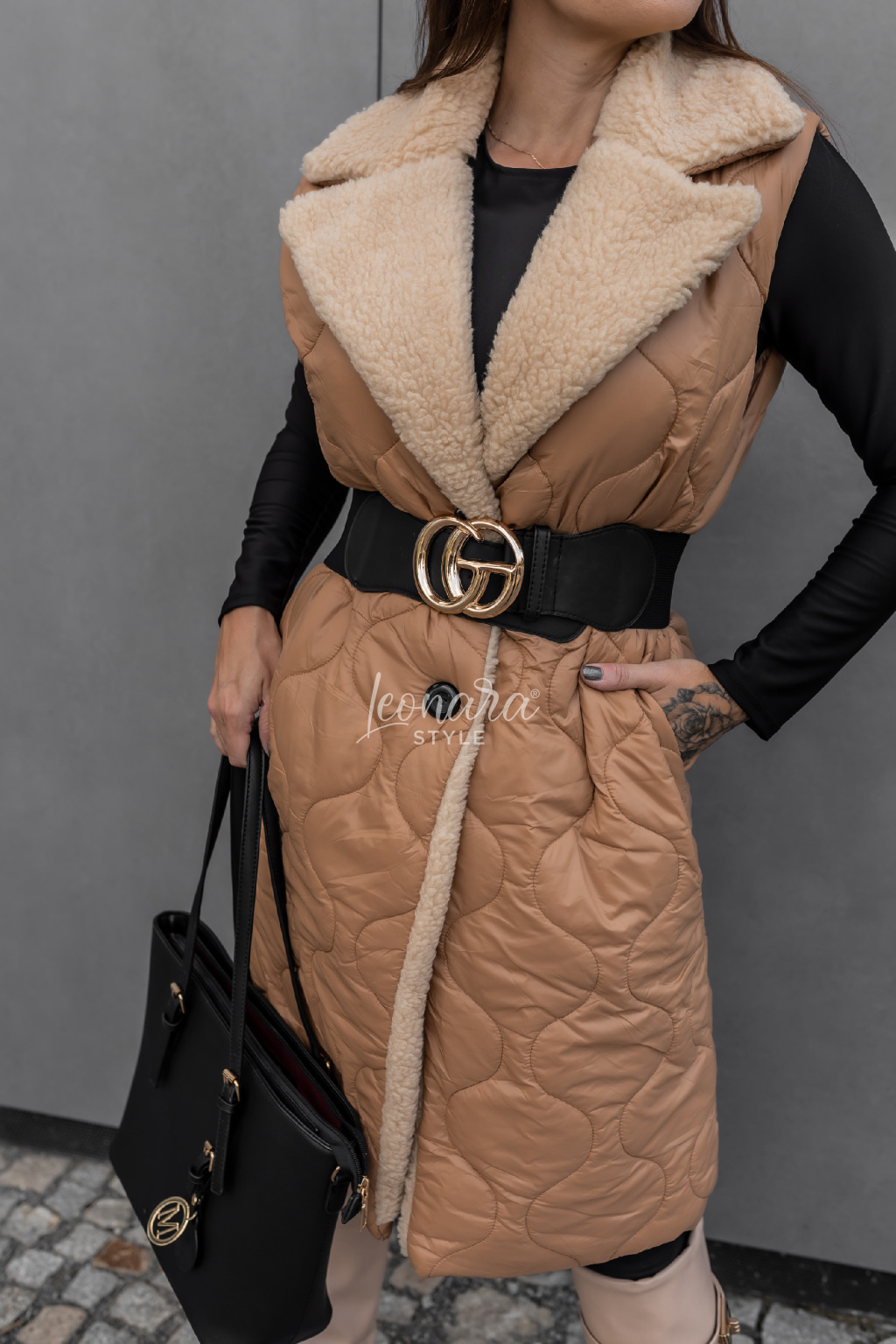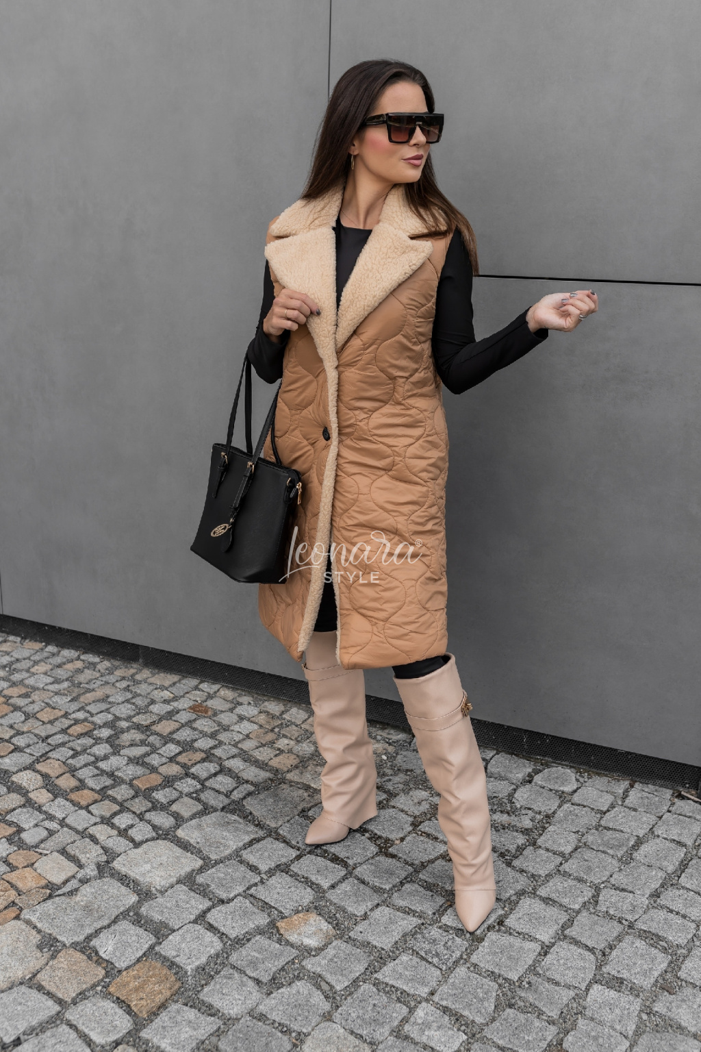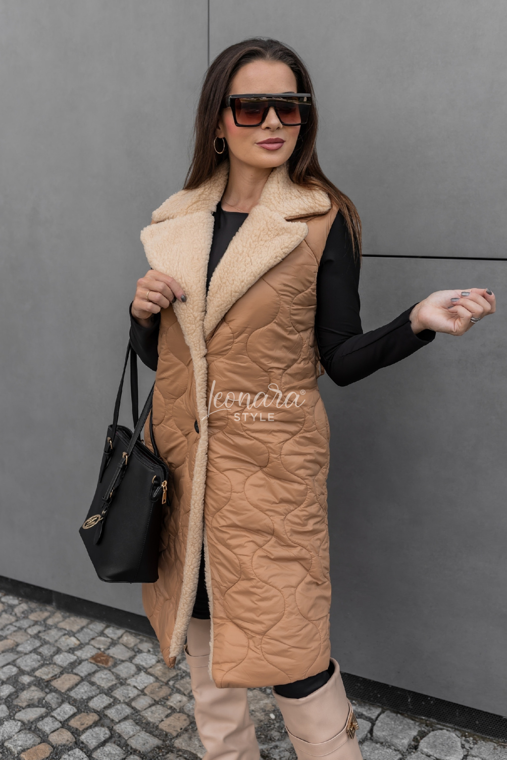 Prošívaná delší vesta se zapínáním na knoflíky a klopovým límcem s měkkým chlupatým vnitřkem. Po stranách má praktické kapsy a poutka na případný opasek, který však není součástí. Díky volnějšímu střihu se dobře kombinuje jak k šatům, tak i k úzkým kalhotám či džínám. Elegantní kousek, který snadno doladíš páskem podle svého stylu.