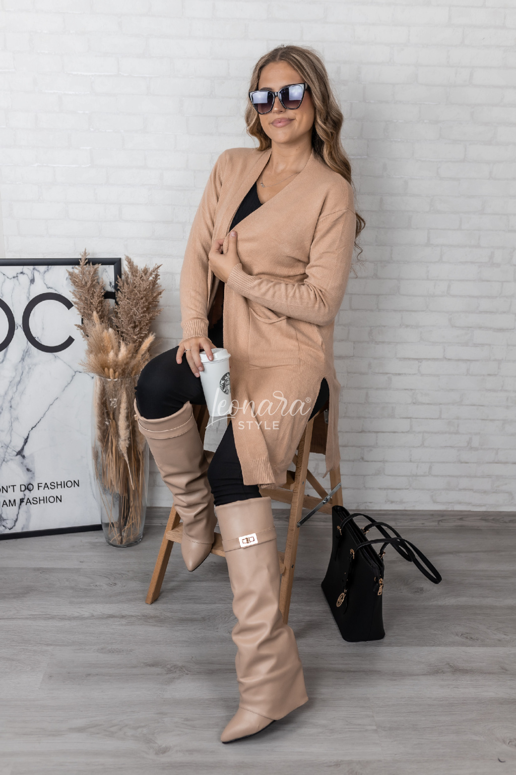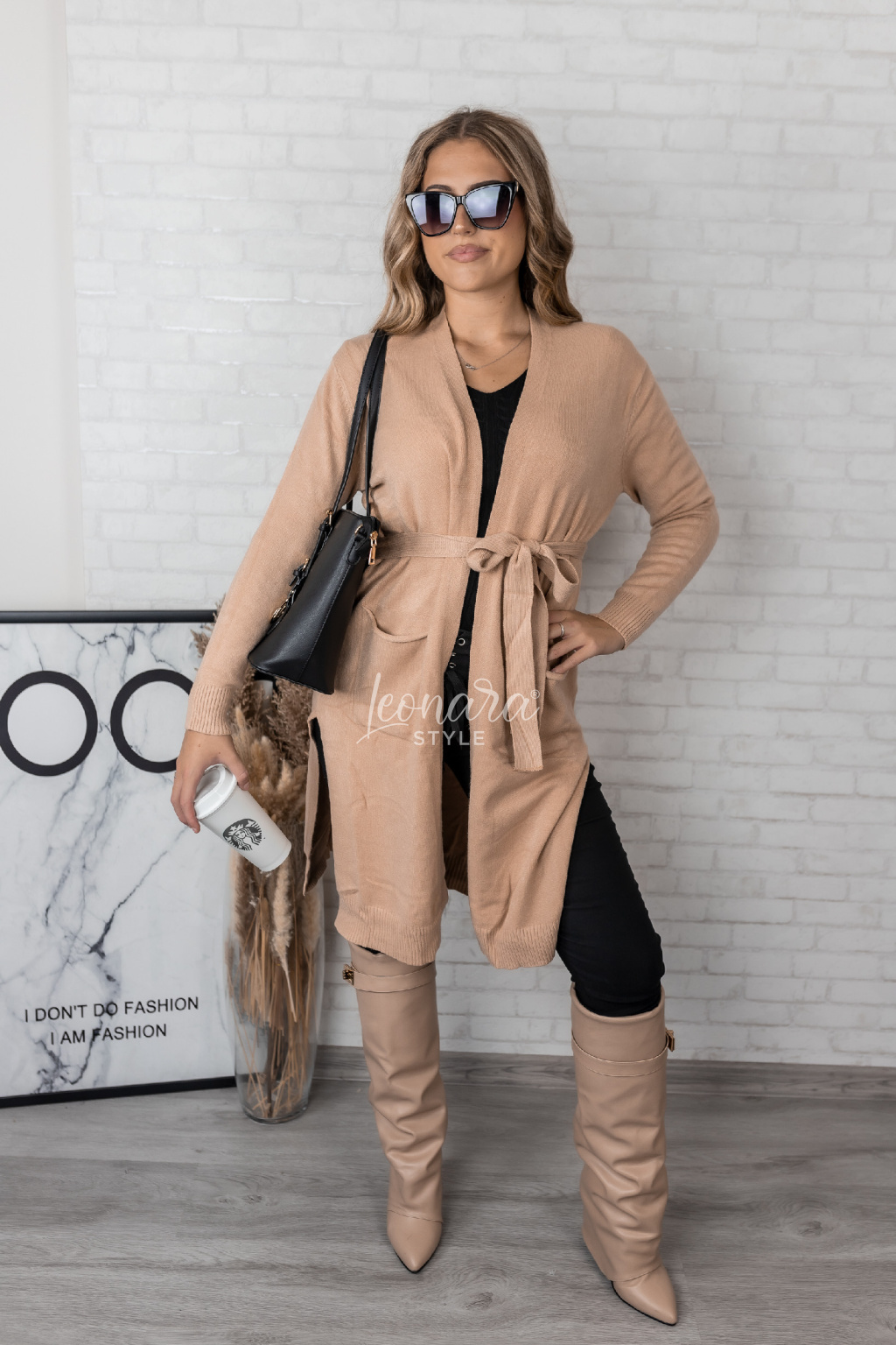 Elegantní delší kardigan bez kapuce, který zakryje záda a postará se o pohodlný pocit při nošení. Součástí je pásek, díky němuž si snadno vytvarujete siluetu podle potřeby. Příjemný materiál dělá z tohoto kousku ideální volbu pro každodenní outfit. Po bocích má rozparek.
