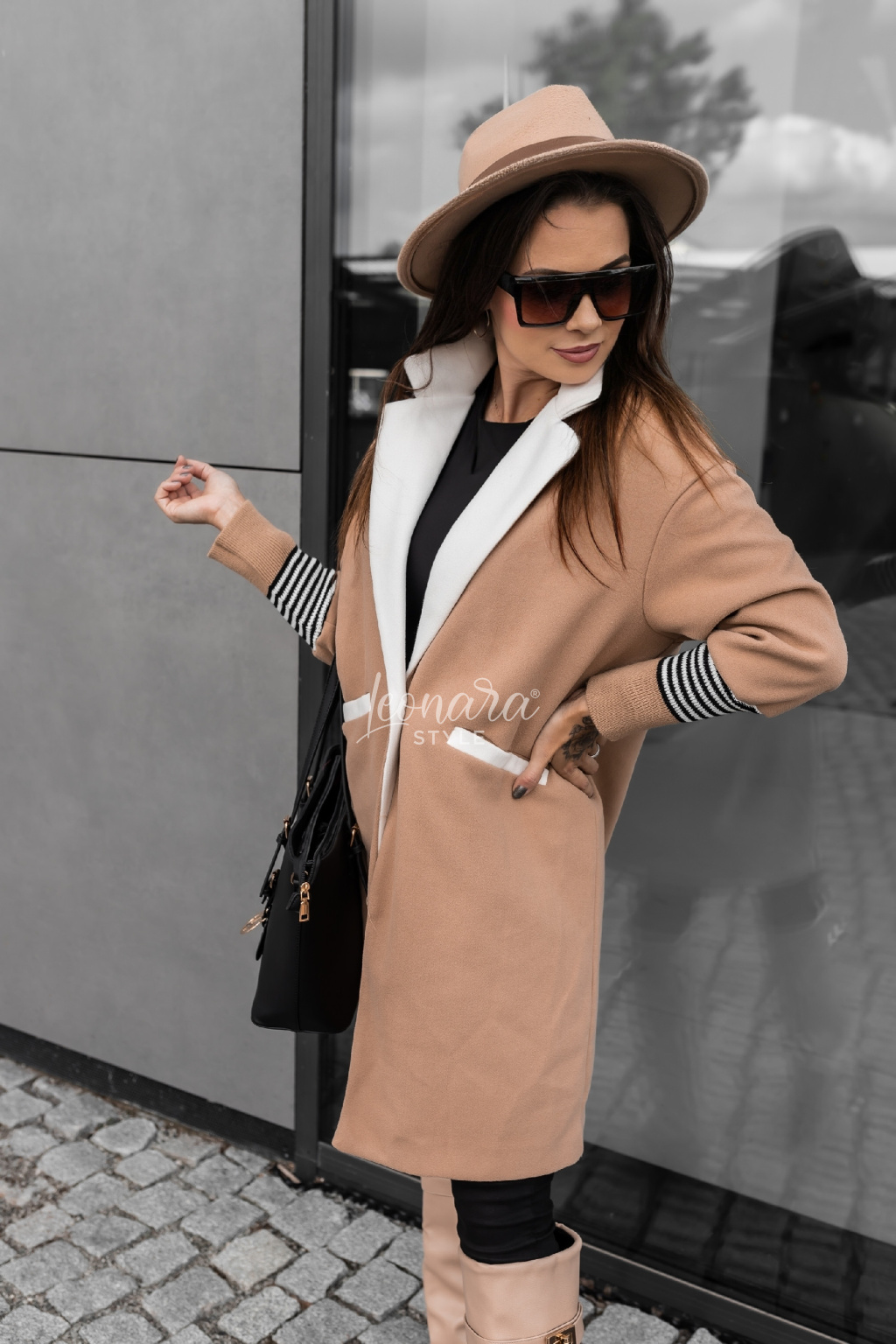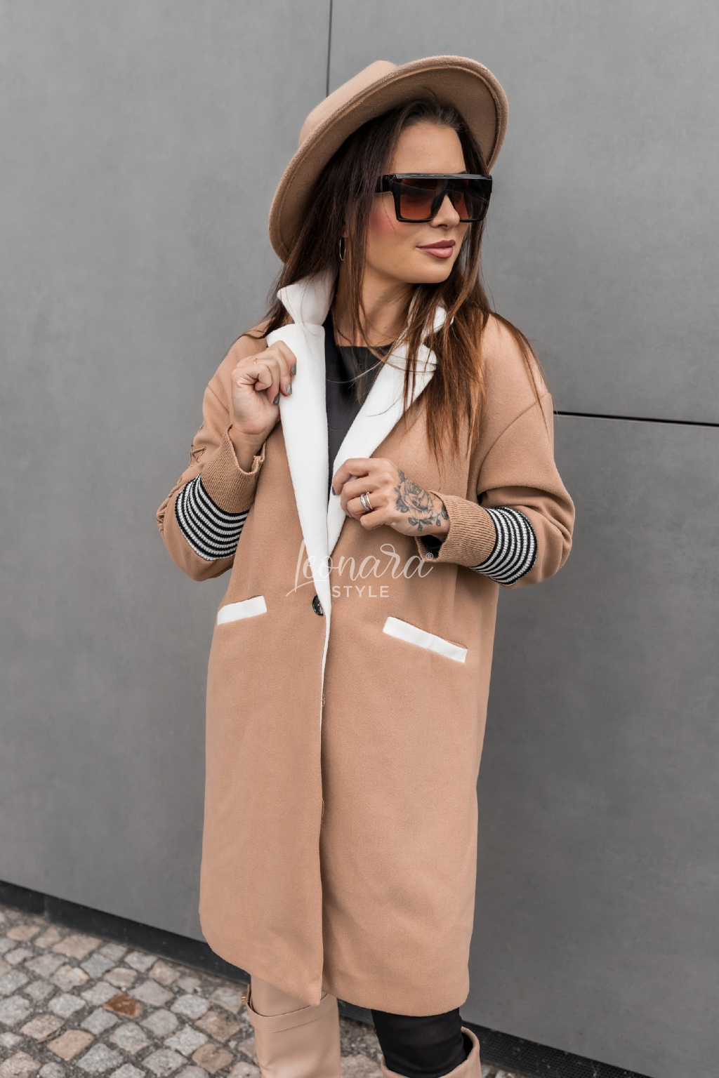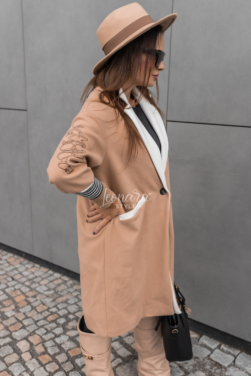 Představujeme vám stylový oversized kabát v hnědé barvě, který se stane nepostradatelným kouskem vašeho šatníku. Tento módní kousek vyniká elegantními bílými klopami a čistým designem s jednořadým zapínáním na jeden knoflík. Pro maximální pohodlí jsou rukávy zakončeny pruhovanými elastickými manžetami a na bocích najdete praktické kapsy s bílým lemováním. Módní vzhled podtrhuje dekorativní nápis na rukávu. Díky volnému oversized střihu a délce nad kolena je kabát ideální pro každodenní nošení i speciální příležitosti. Snadno jej zkombinujete s džíny, šaty i elegantními kousky.