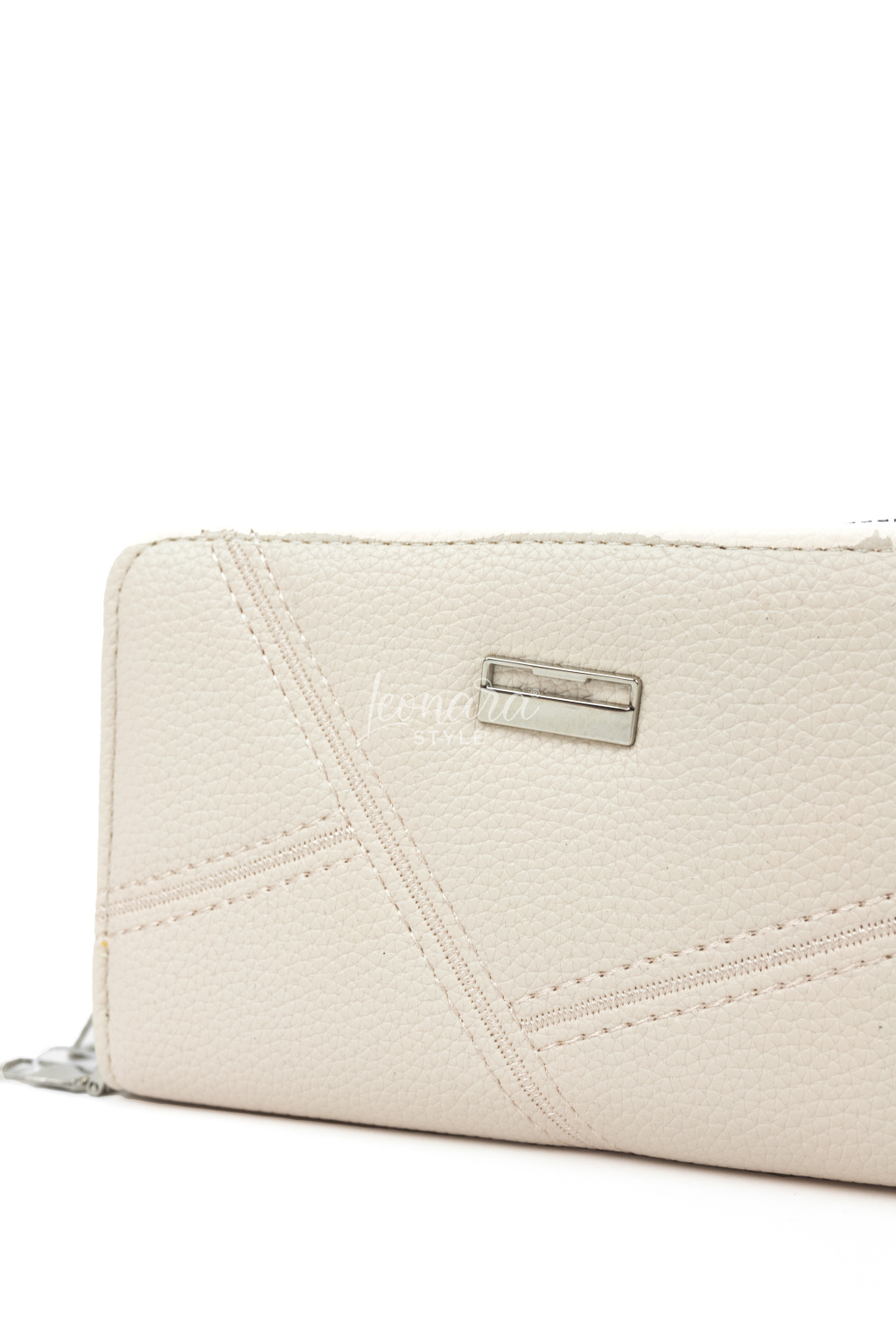 Elegantní koženková dvojitá peněženka se stříbrnými detaily je praktickým a stylovým doplňkem pro každý den. Díky promyšlenému vnitřnímu uspořádání nabízí dostatek prostoru na hotovost, karty i drobnosti. Součástí je odnímatelné koženkové poutko, díky kterému můžete peněženku nosit i samostatně v ruce. První část peněženky je rozdělena na dvě kapsy a jednu kapsu na mince se zapínáním na zip. Druhá část má dvě kapsy, po jejichž bocích se nachází přihrádky na karty, takže budete mít vše přehledně uspořádané a po ruce.
