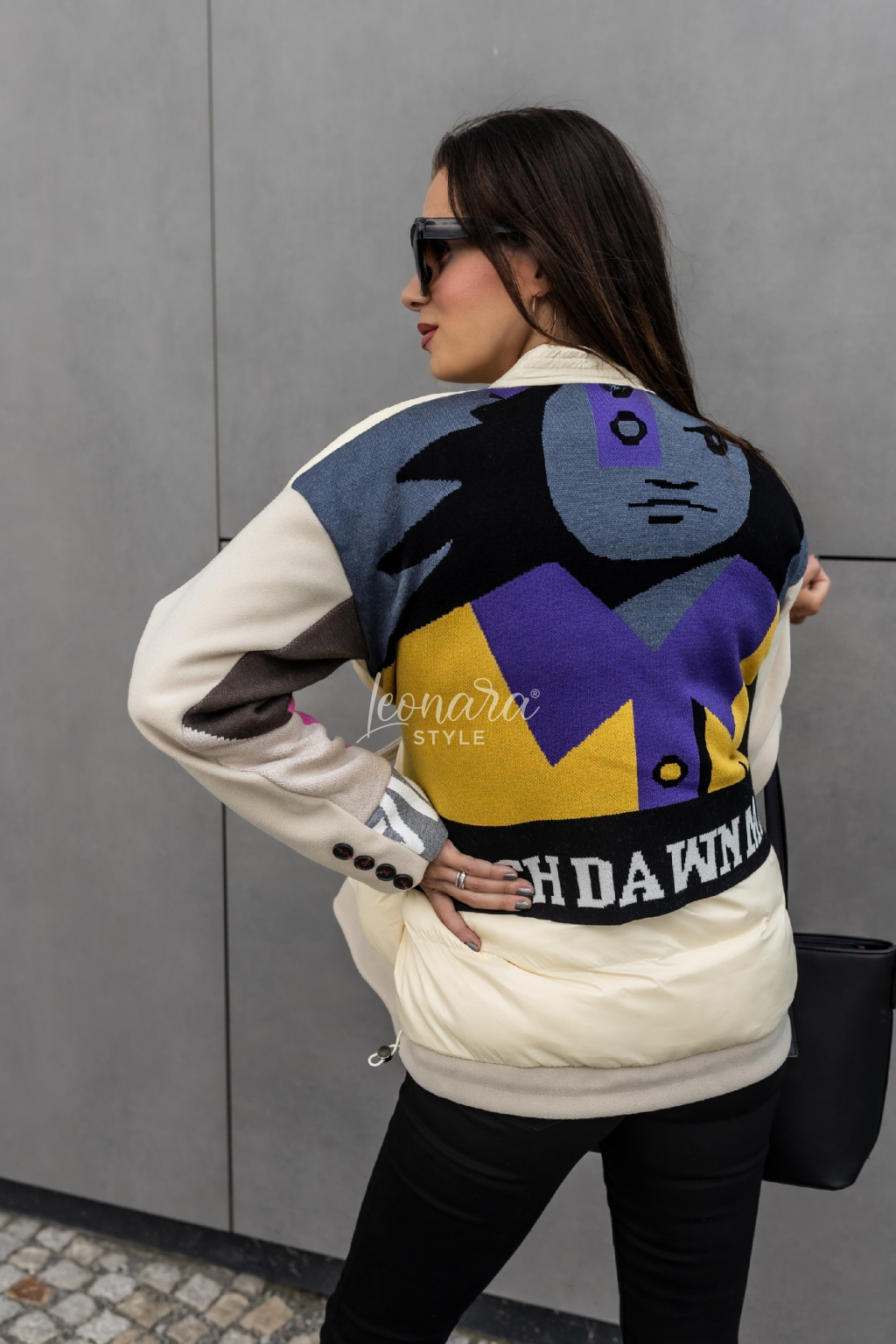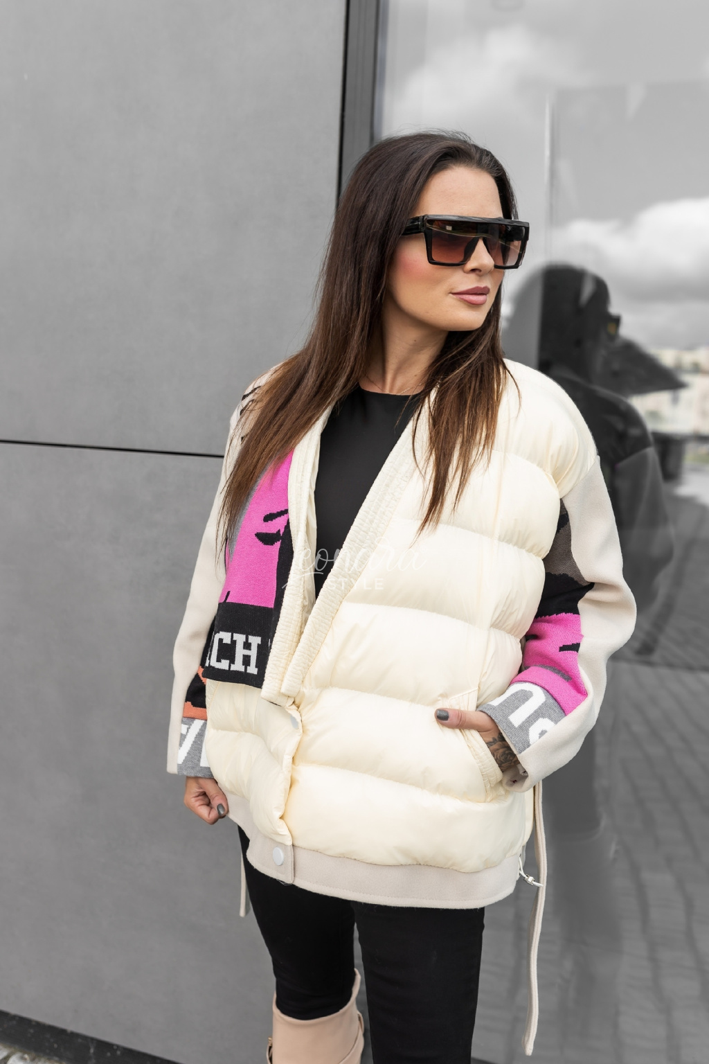 Prošívaná bunda se širokým límcem a kapsami v pase. Rukávy i zadní část jsou zdobené originálním barevným potiskem s motivem postavy a nápisy, což dodává bundě moderní streetwear vzhled. Dá se nosit volně nebo stáhnout páskem v pase pro zvýraznění siluety. Stylový kousek, který se odlišuje svým výrazným designem.