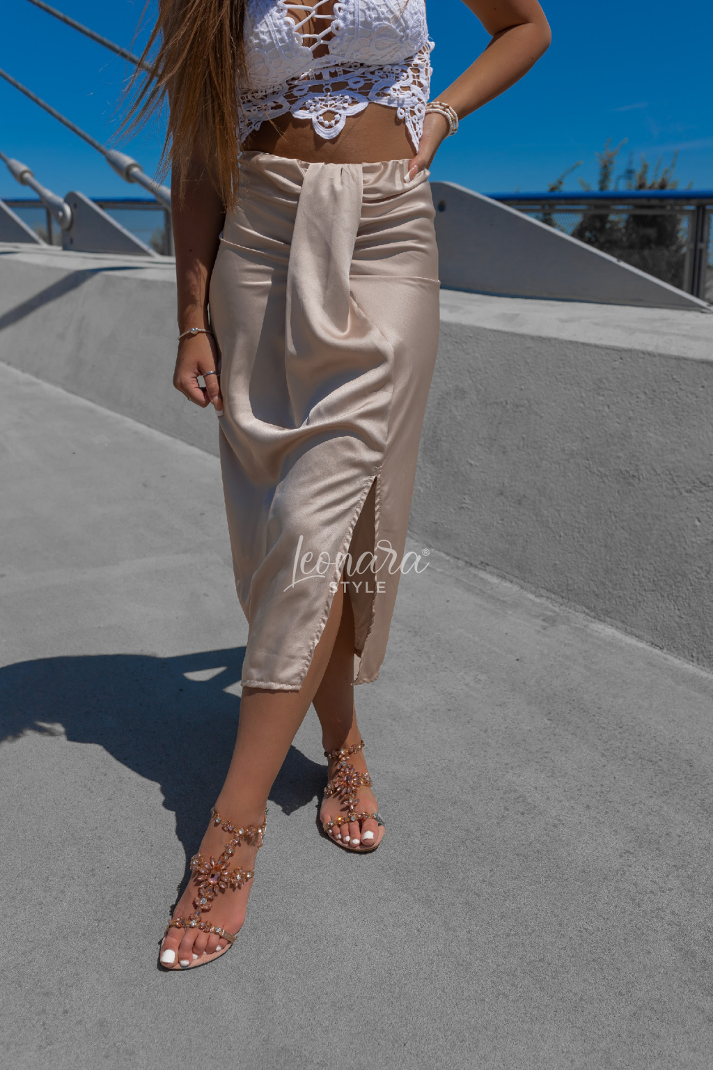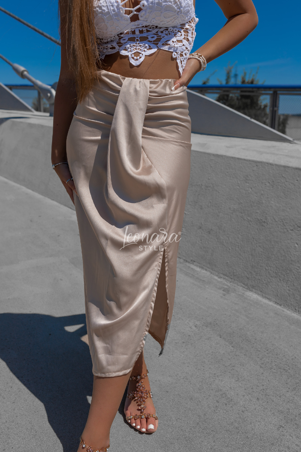 Elegantní saténová sukně s efektním uzlem v pase a rozparkem vpředu. Díky elastickému pasu se krásně přizpůsobí postavě. Bez zapínání – jednoduše oblékneš a jdeš! Délka pod kolena a rozparek na jedné straně dodávají modelu šmrnc a ženský půvab. Ideální volba na večerní výlet, letní party nebo elegantní letní outfit.