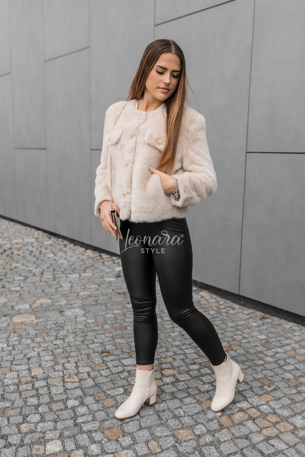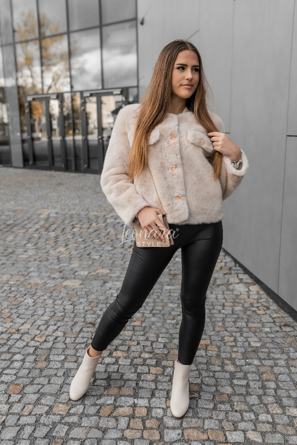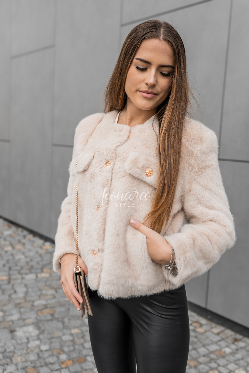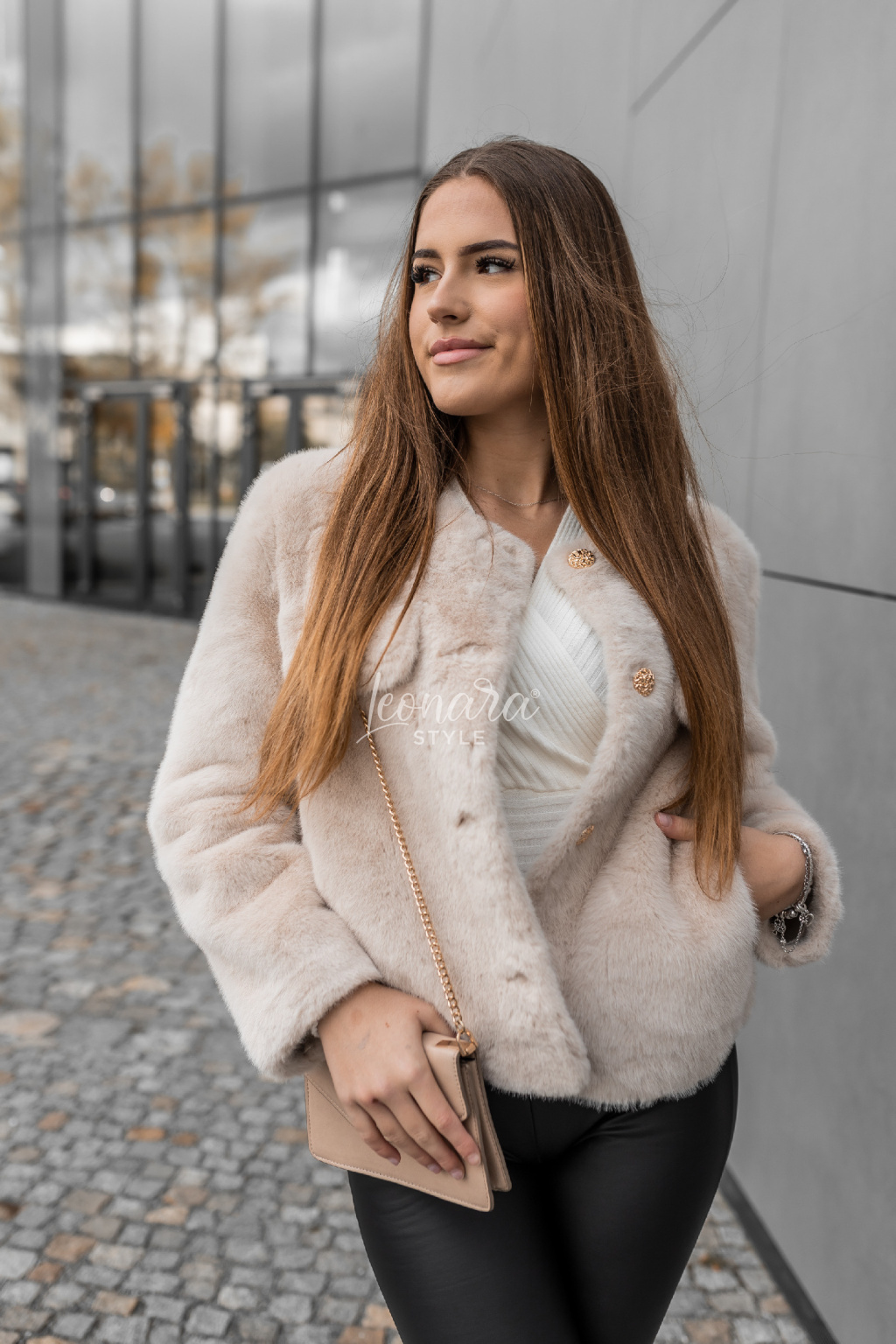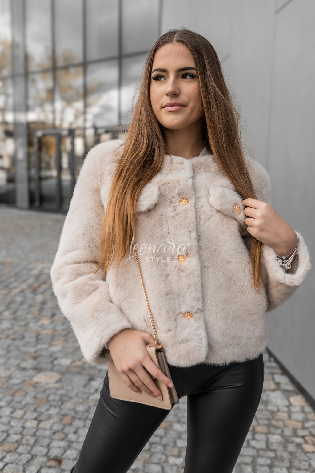 Představujeme vám krémový elegantní kabátek do pasu se zlatými knoflíky je ideální pro chladnější dny. Kabátek má podšívku a je bez kapuce. Krátký střih zvýrazní pas, zatímco kožíšek zajišťuje teplo a pohodlí. Zlaté knoflíky přidávají kabátku jedinečný vzhled, který snadno doplní jakýkoli outfit. Vhodný k šatům i džínům pro každodenní nošení i speciální příležitosti.