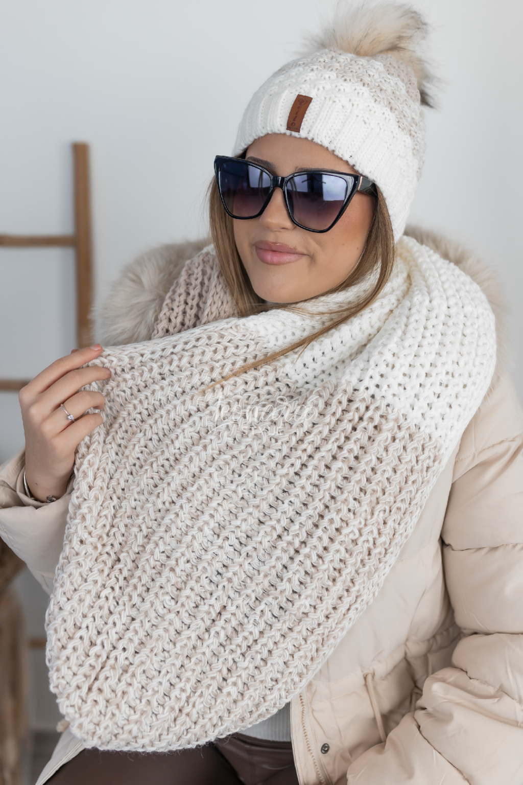 Elegantní pletený set čepice a šály v harmonické kombinaci krémové a béžové barvy. Je mimořádně příjemný na nošení, hebký na dotek a díky hrubému pletenému vzoru krásně zahřeje. Nadčasový doplněk s bohatou kožešinovou bambulí, který dodá šmrnc každému zimnímu outfitu. Šála je ve stylu tunelu.