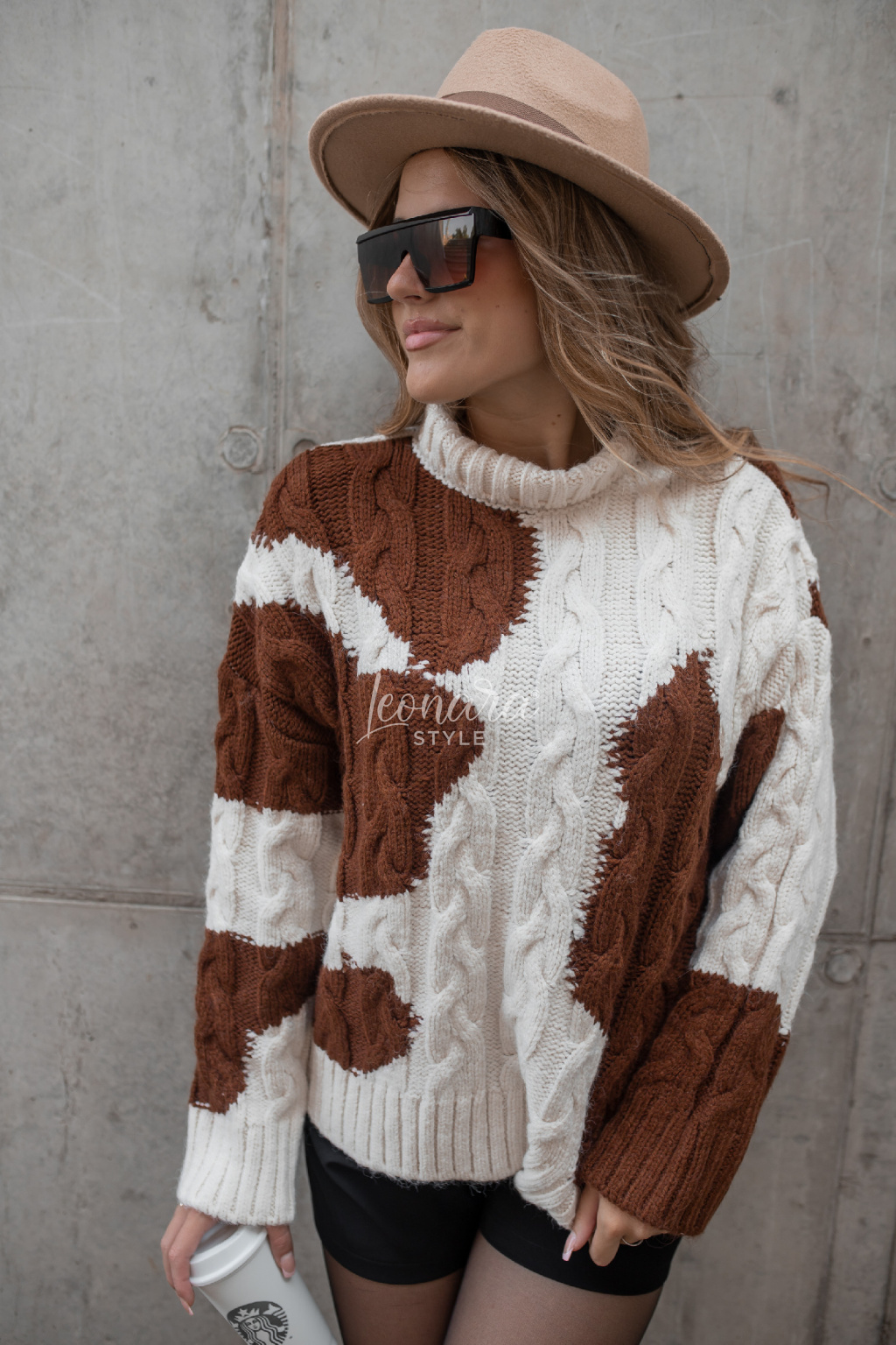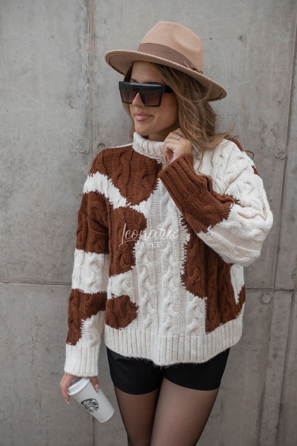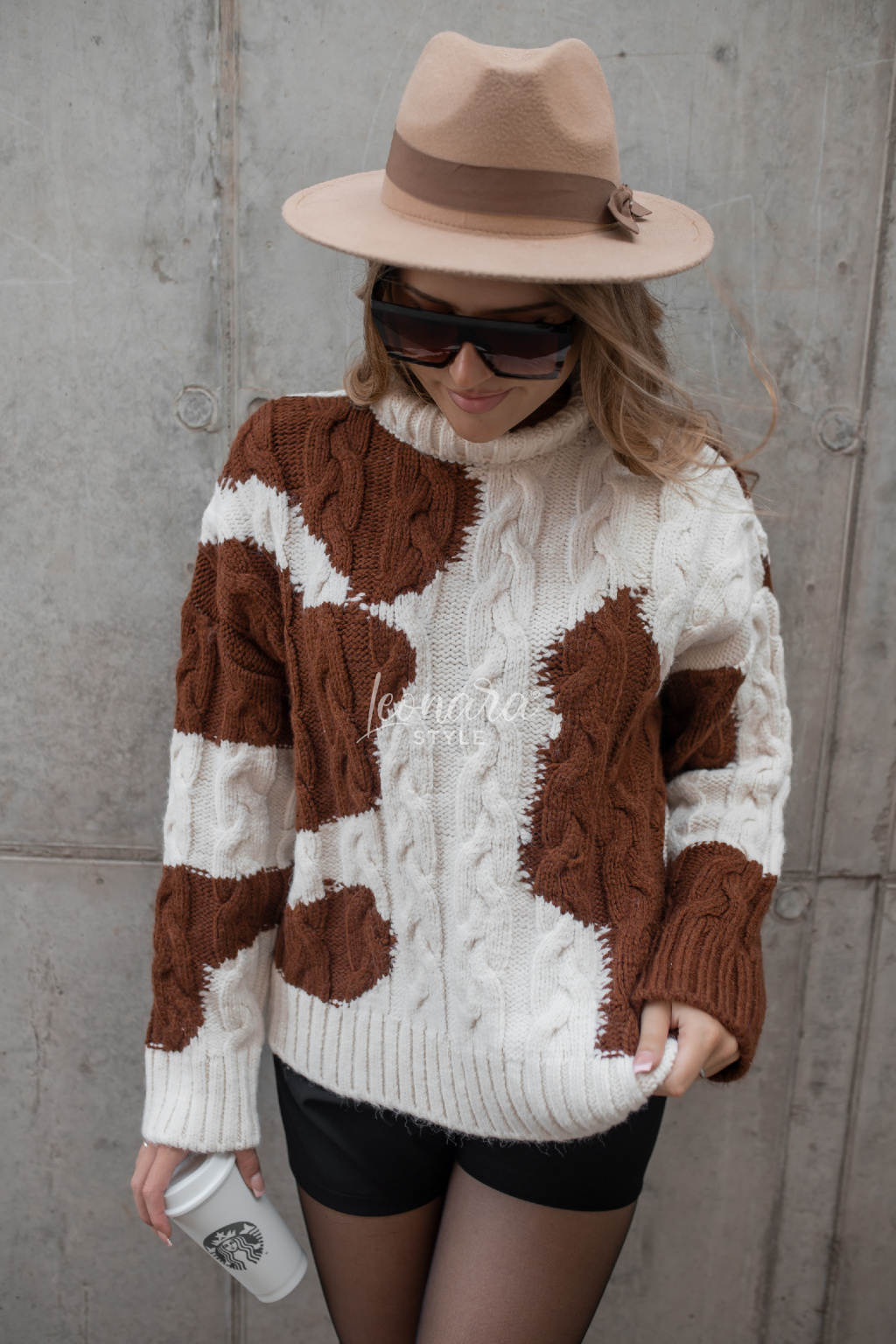 Stylový pletený svetr v kombinaci bílé a hnědé barvy s výrazným vzorem a copánkovým úpletem. Pohodlný volnější střih s vysokým rolákovým límcem zahřeje i v chladnějším počasí. Díky originálnímu designu se stane dominantním prvkem vašeho outfitu a snadno se kombinuje s jednoduchými kalhotami nebo džínami. Ideální pro každodenní nošení, kdy chcete vypadat moderně a zároveň se cítit pohodlně.