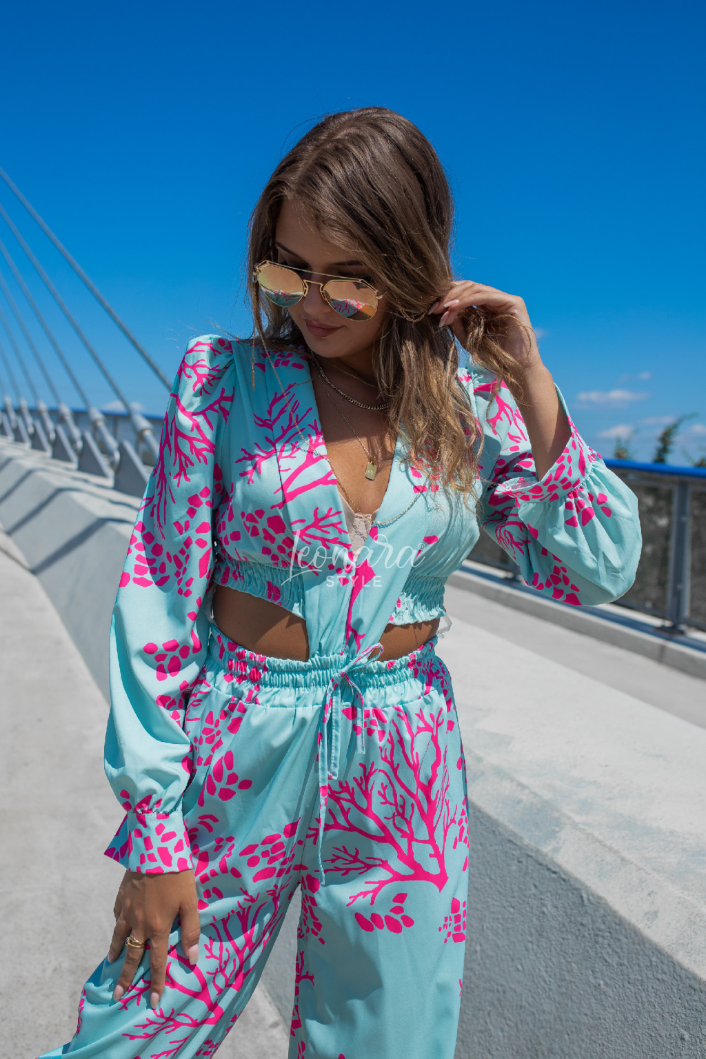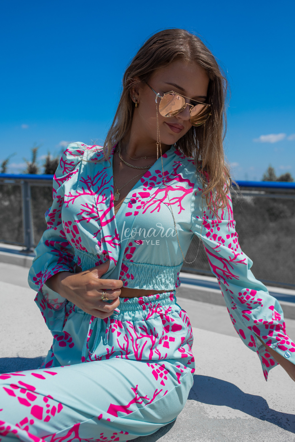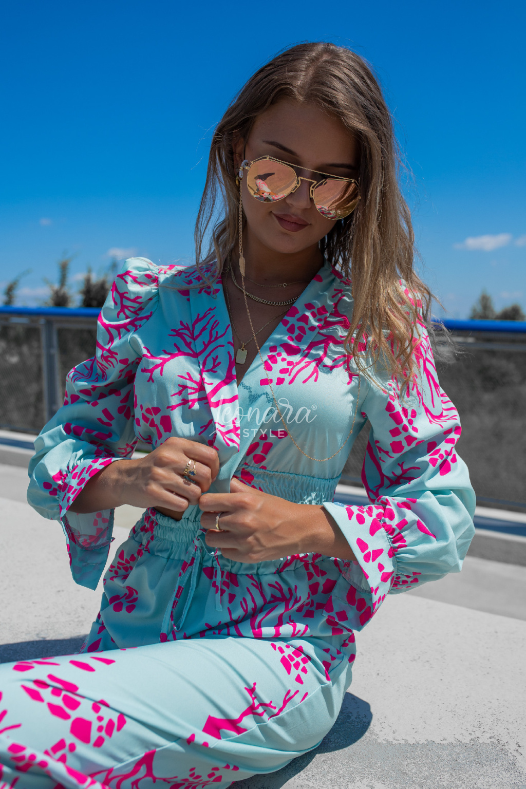 Overal v tyrkysové-mintové barvě s výrazným růžovým potiskem korálů. Má dlouhé rukávy s manžetami, výstřih do „V“ a elastický pas se šňůrkou. Stylové výřezy v oblasti pasu a guma v zadní části zajišťují pohodlné nošení. Lehký, lesklý materiál ideální na léto. Nohavice jsou zakončeny gumou.