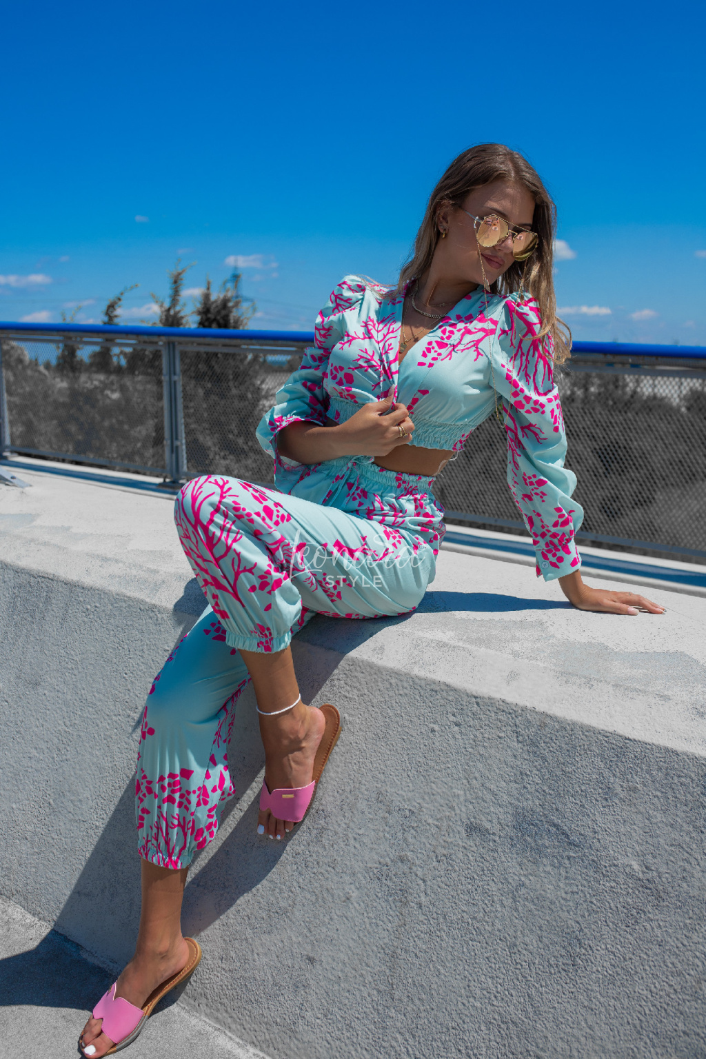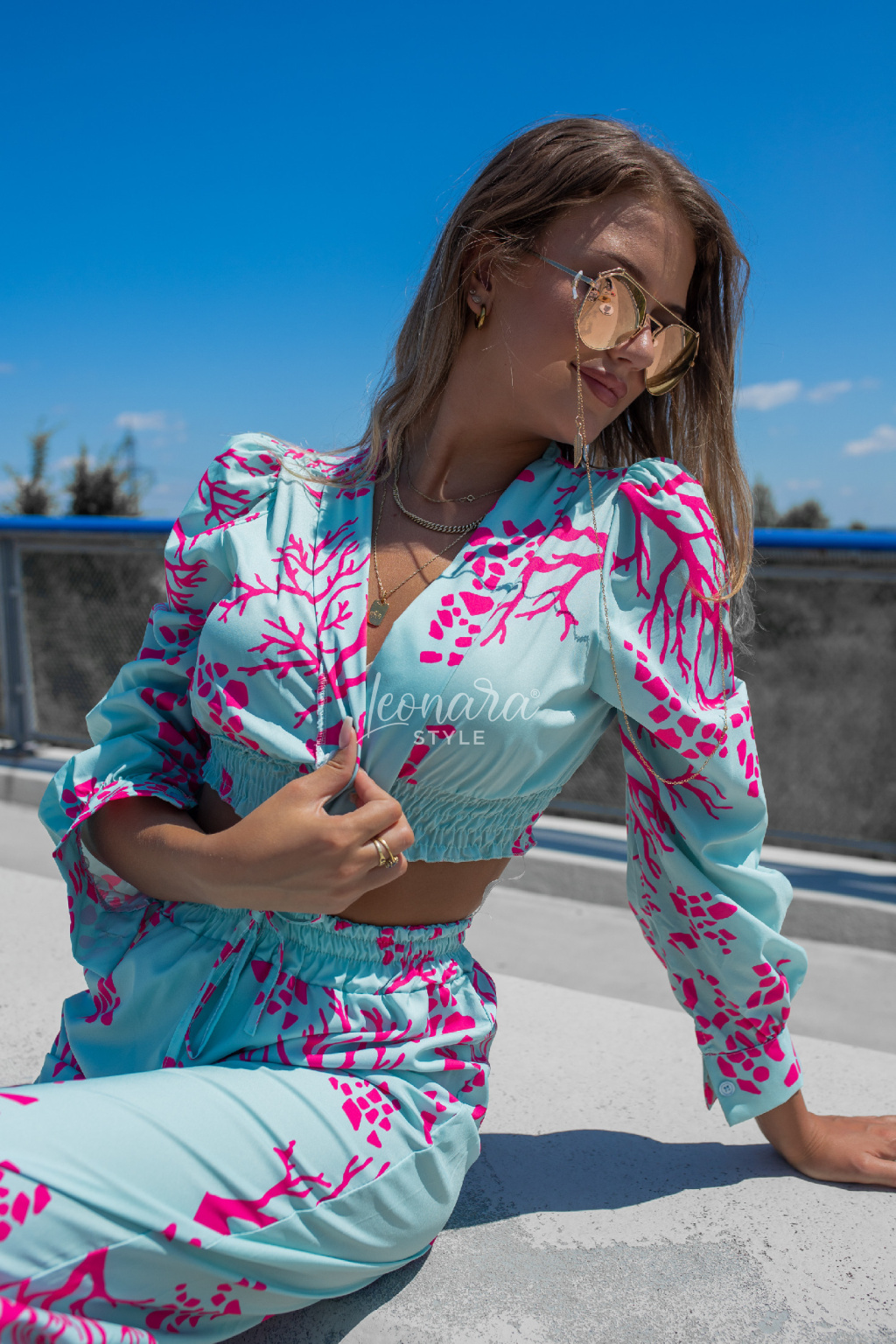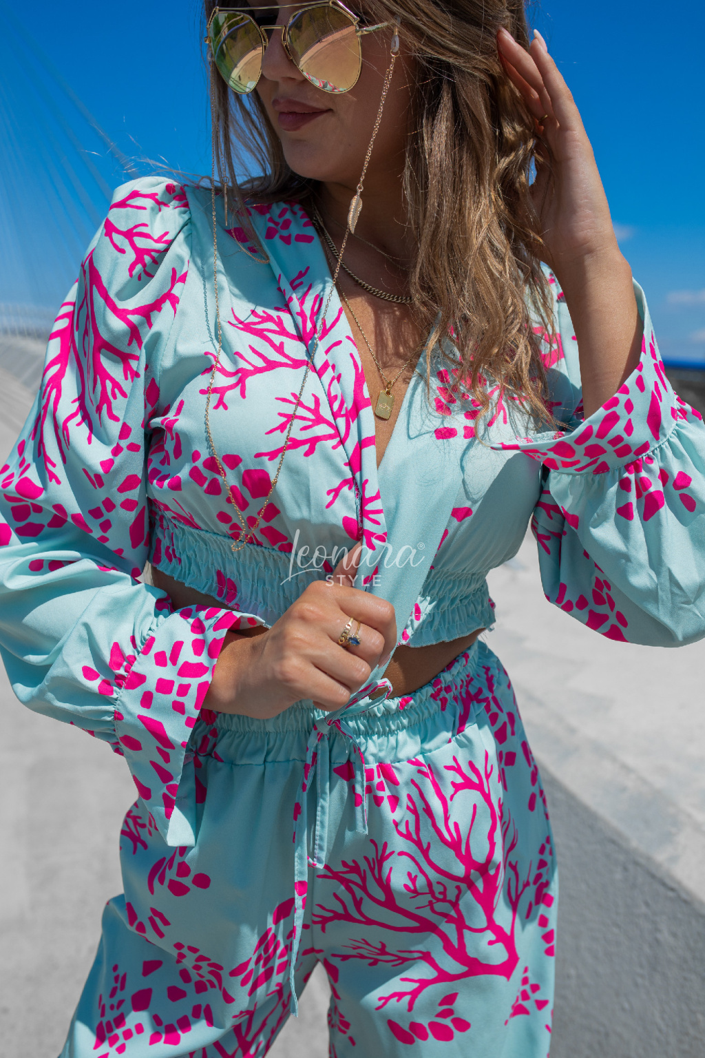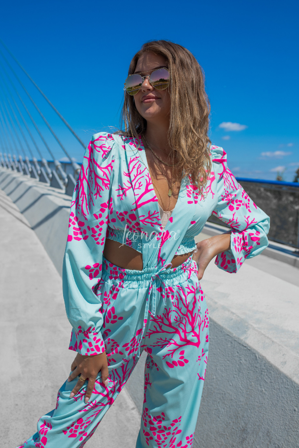 Overal v tyrkysové-mintové barvě s výrazným růžovým potiskem korálů. Má dlouhé rukávy s manžetami, výstřih do „V“ a elastický pas se šňůrkou. Stylové výřezy v oblasti pasu a guma v zadní části zajišťují pohodlné nošení. Lehký, lesklý materiál ideální na léto. Nohavice jsou zakončeny gumou.