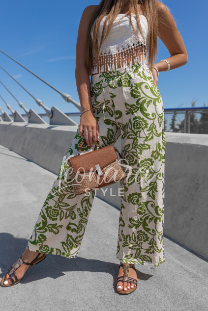 Overal v tyrkysové-mintové barvě s výrazným růžovým potiskem korálů. Má dlouhé rukávy s manžetami, výstřih do „V“ a elastický pas se šňůrkou. Stylové výřezy v oblasti pasu a guma v zadní části zajišťují pohodlné nošení. Lehký, lesklý materiál ideální na léto. Nohavice jsou zakončeny gumou.