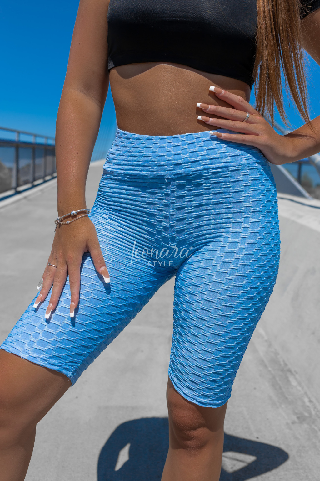 Baby blue sportovní šortky s push-up efektem a jemnou 3D strukturou. Velmi pružné a pohodlné na nošení. Vysoký pas perfektně tvaruje postavu a drží na místě i při pohybu. Ideální na sport i volný čas – doplní každý letní outfit. Vhodné pro všechny typy postavy.