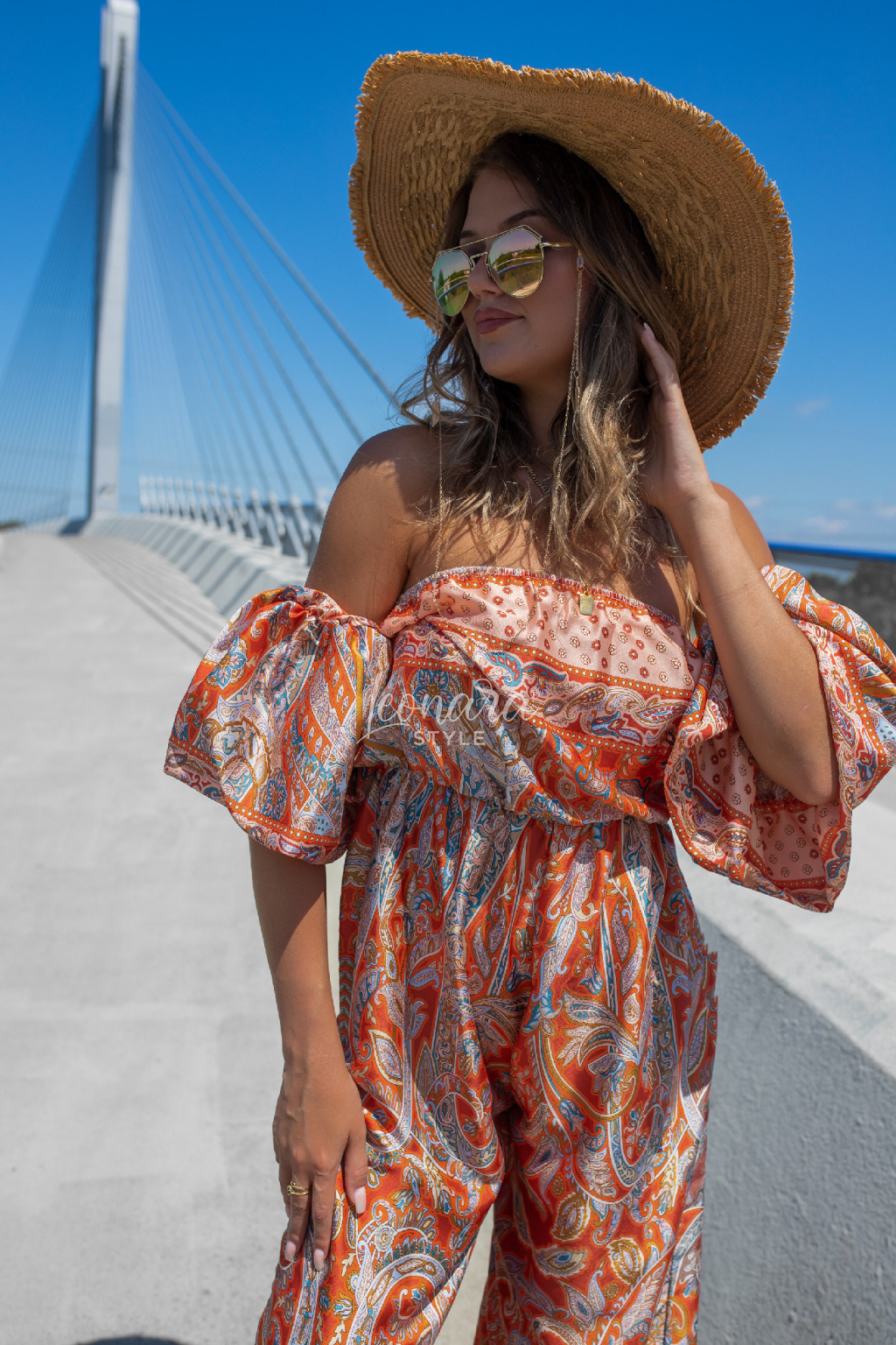 Výrazný letní overal s barevným orientálním vzorem a volnými nohavicemi je perfektní volbou na dovolenou i do města. Díky elastickému pasu a žabkování se pohodlně nosí a krásně sedí. Rukávy jsou balónové. Lesklý , splývavý materiál působí elegantně a zároveň je ideální do teplého počasí. Zezadu nemá zapínání, je na gumu.