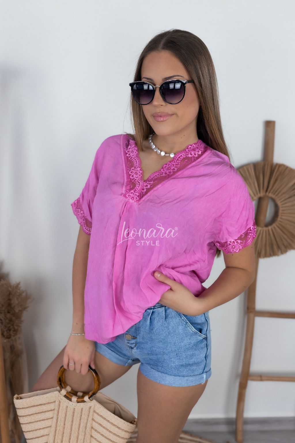 Oversize tričko s volným střihem z velmi lehkého a příjemného materiálu, ideální na každodenní nošení i teplé dny. Přední část je kratší, zadní delší pro moderní a pohodlný střih. Výstřih do „V“ je zdoben jemnou krajkou, která se objevuje i na rukávech. Tričko je vzdušné, pohodlné a vhodné pro různé typy postav.