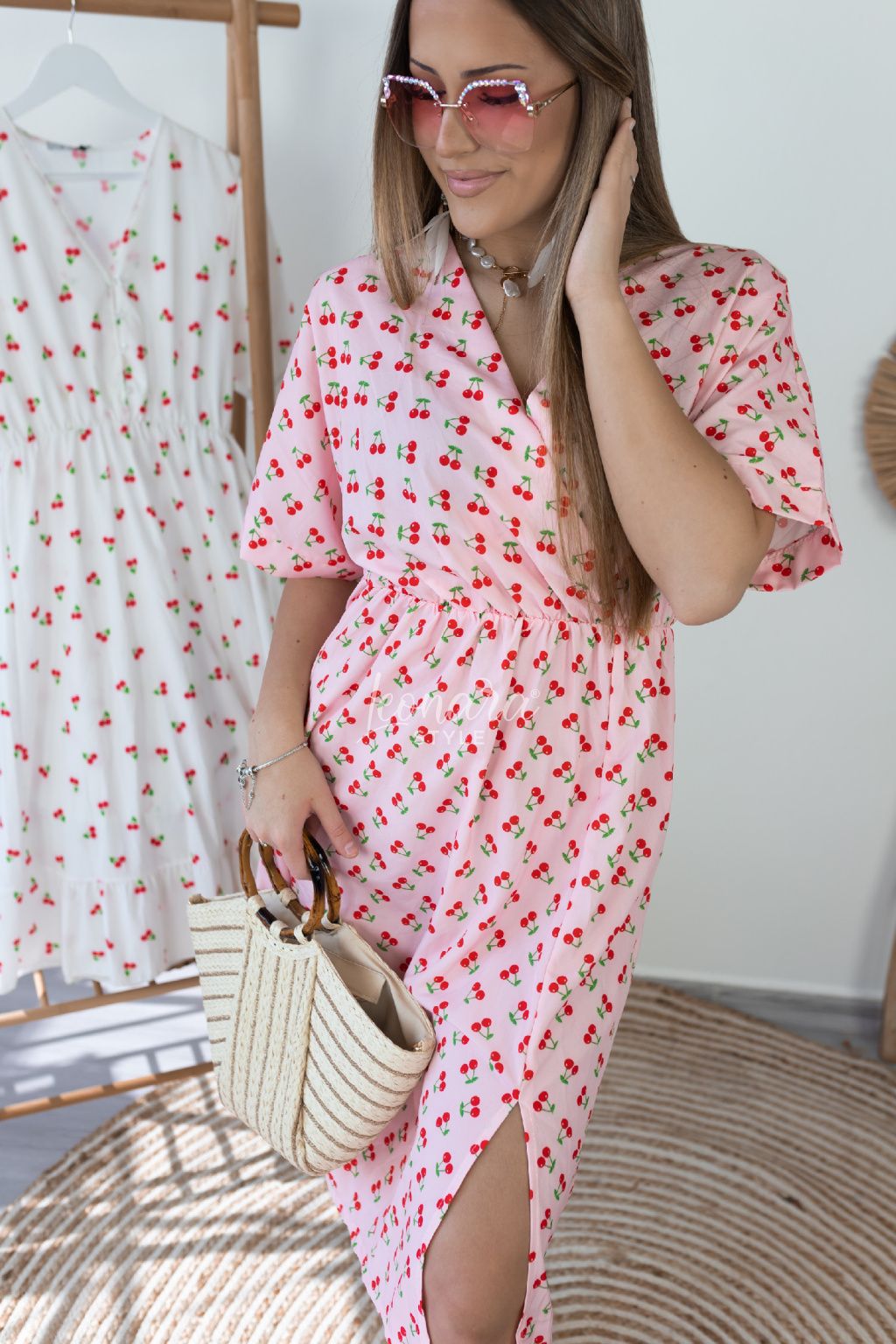 Tento model šatů má pohodlný, splývavý midi střih a je vyroben z lehkého, příjemného materiálu vhodného pro celodenní nošení. Na první pohled zaujme jemným motivem drobných třešní, který působí něžně. Šaty mají véčkový výstřih, který je praktický i pro kojení, a v pase jsou řešeny pružnou gumou, díky které se přizpůsobí postavě. Polodlouhé rukávy dodávají modelu vzdušnost a pohodlí a zakryjí ramena. Midi délka spolu s rozparkem na boku zajišťuje komfort při chůzi a zároveň podtrhuje lehkost celkového vzhledu.