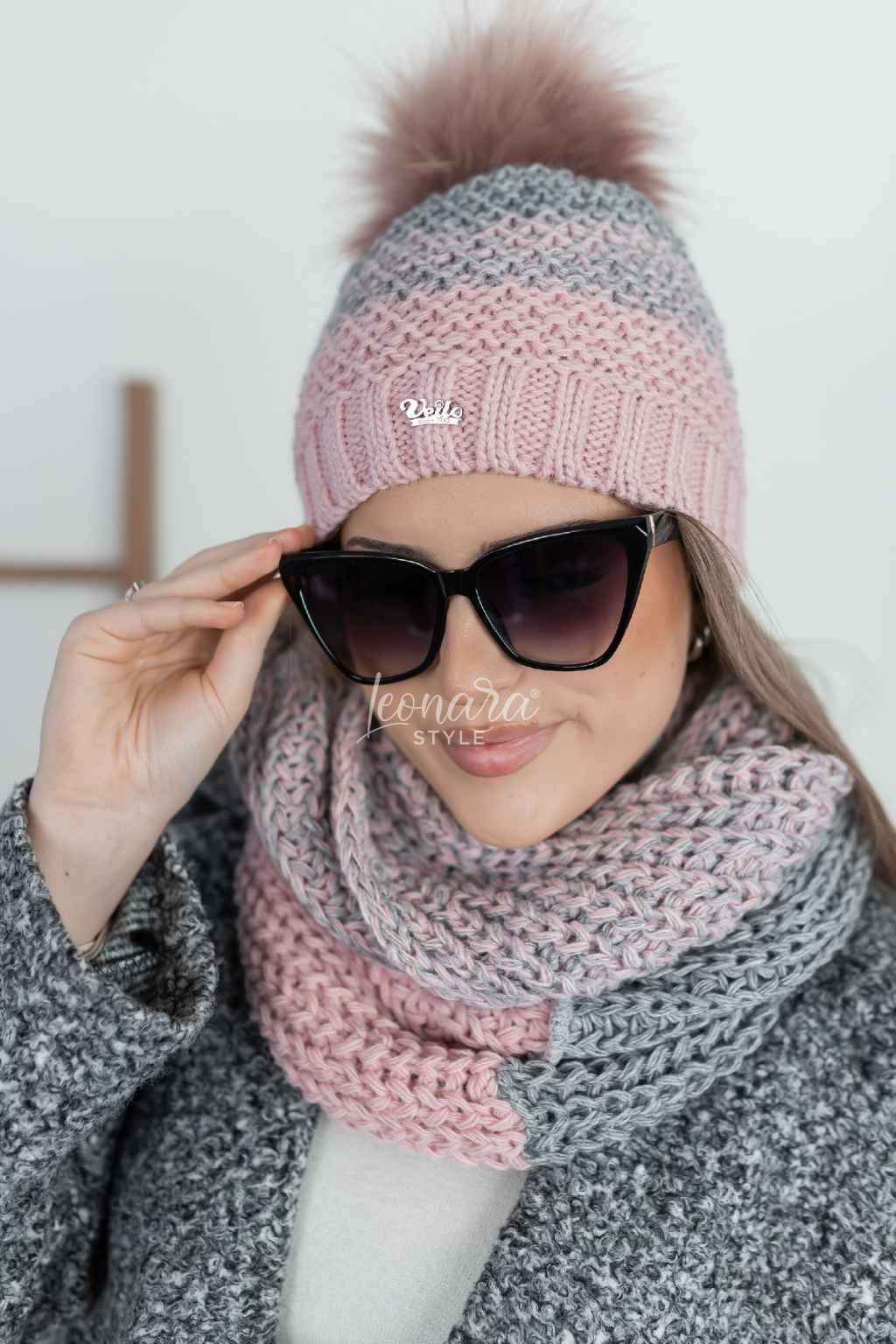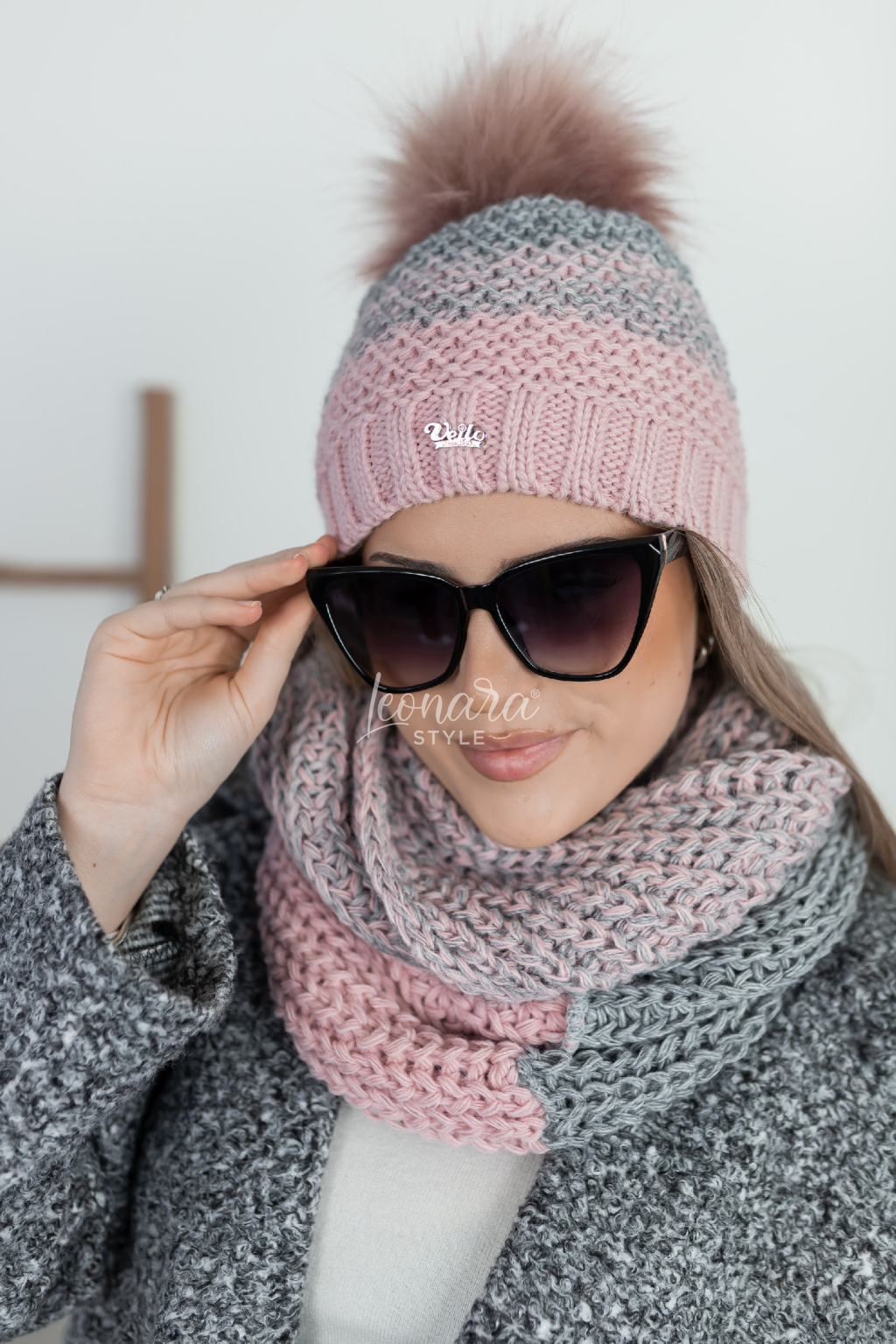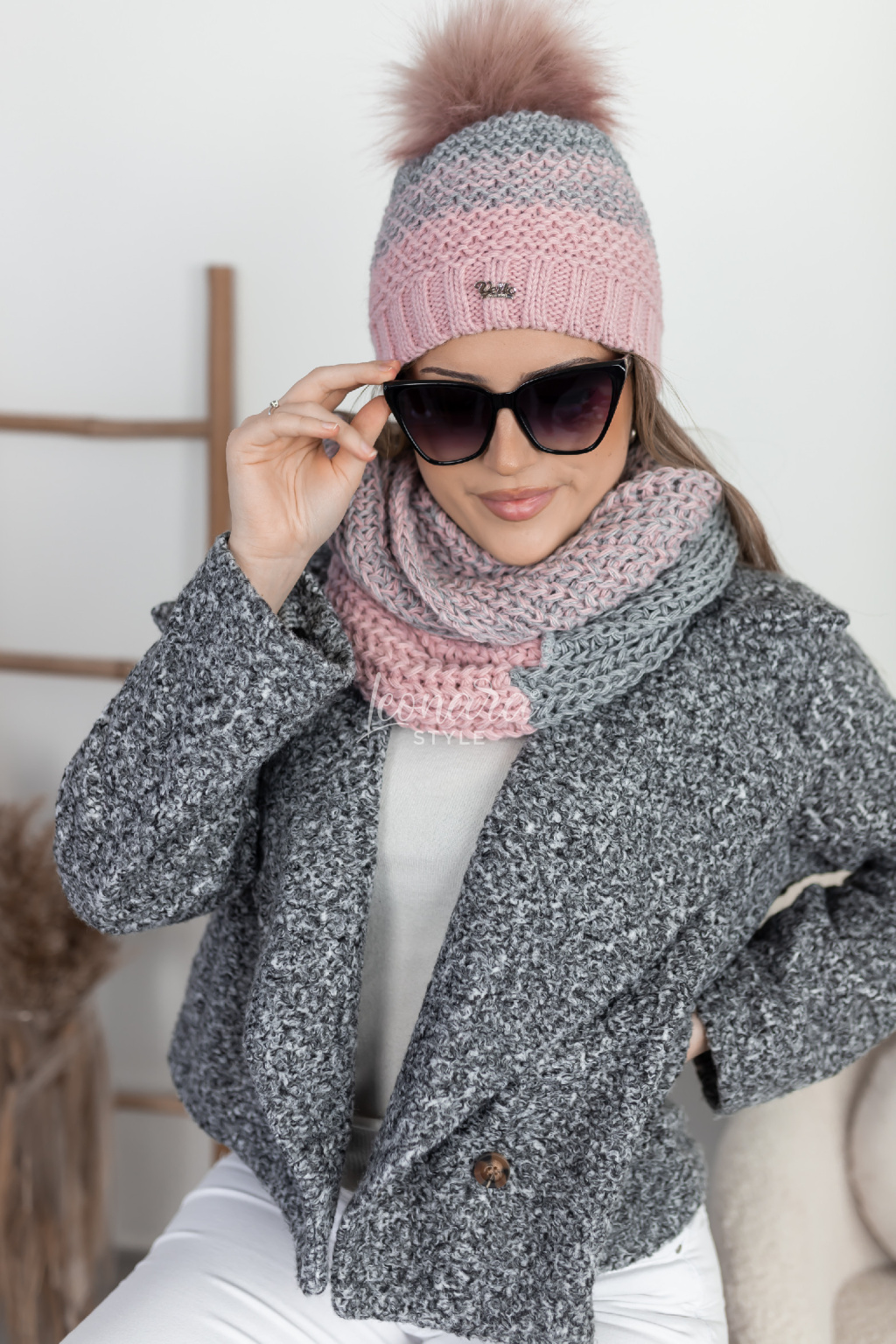 Elegantní pletený set čepice a šály v harmonické kombinaci šedé a růžové barvy. Je mimořádně příjemný na nošení, hebký na dotek a díky hrubému pletenému vzoru krásně zahřeje. Nadčasový doplněk s bohatou kožešinovou bambulí, který dodá šmrnc každému zimnímu outfitu. Šála je ve stylu tunelu.