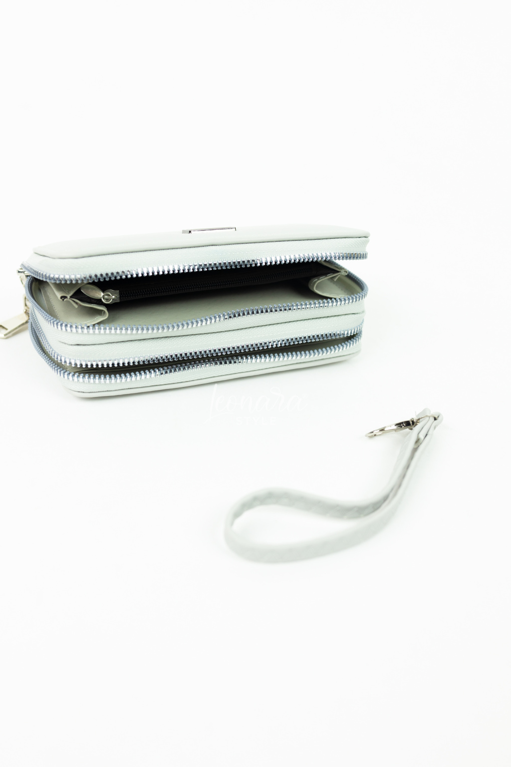 Elegantní koženková dvojitá peněženka se stříbrnými detaily je praktickým a stylovým doplňkem pro každý den. Díky promyšlenému vnitřnímu uspořádání nabízí dostatek prostoru na hotovost, karty i drobnosti. Součástí je odnímatelné koženkové poutko, díky kterému můžete peněženku nosit i samostatně v ruce. První část peněženky je rozdělena na dvě kapsy a jednu kapsu na mince se zapínáním na zip. Druhá část má dvě kapsy, po jejichž bocích se nachází přihrádky na karty, takže budete mít vše přehledně uspořádané a po ruce.