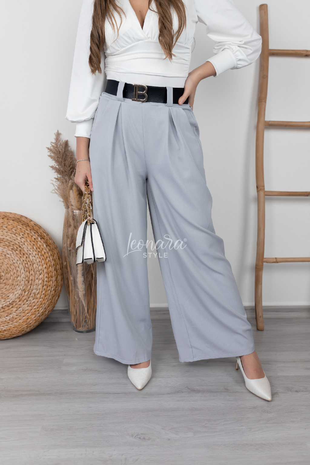 Elegantní široké kalhot jsou vyrobeny z lehkého a velmi příjemného materiálu, díky kterému se pohodlně nosí po celý den. V zadní části pasu je pružná guma pro lepší přizpůsobení postavě. Součástí kalhot je pásek se zlatou sponou s písmenem B, který dodává modelu luxusní detail. Kalhoty mají praktické kapsy a volný, vzdušný střih, jenž působí elegantně. Skvěle se hodí na běžné nošení, do práce i na společenské příležitosti.
